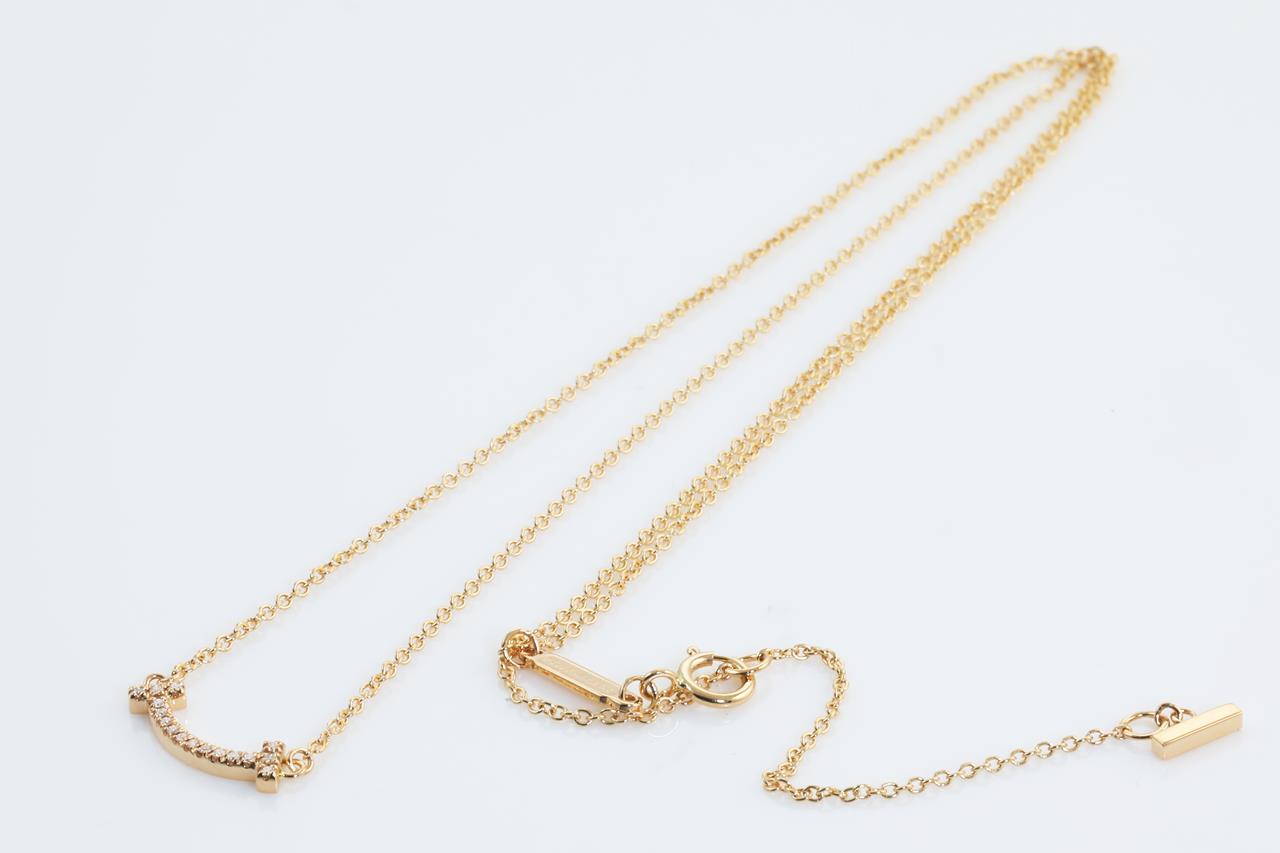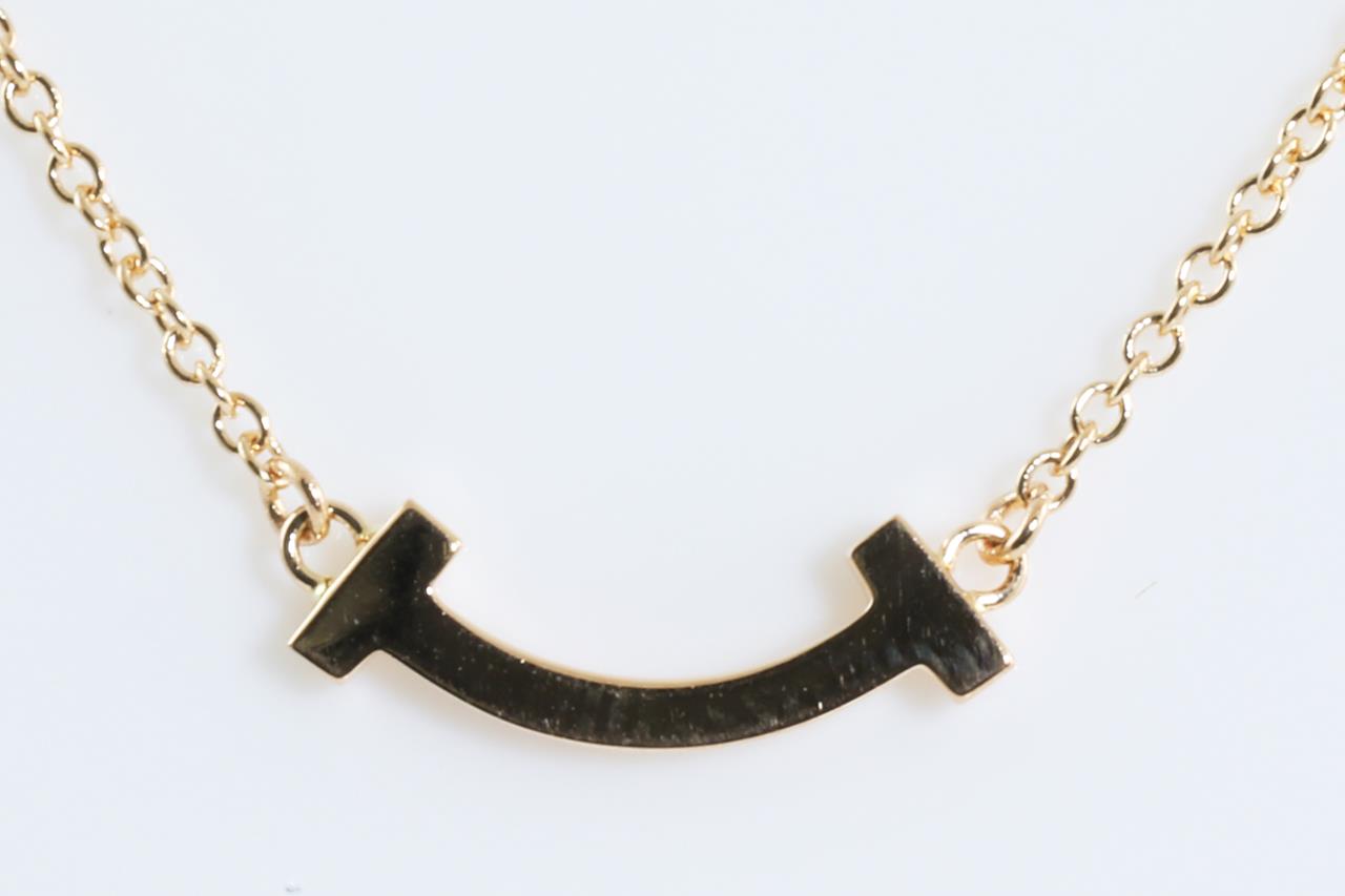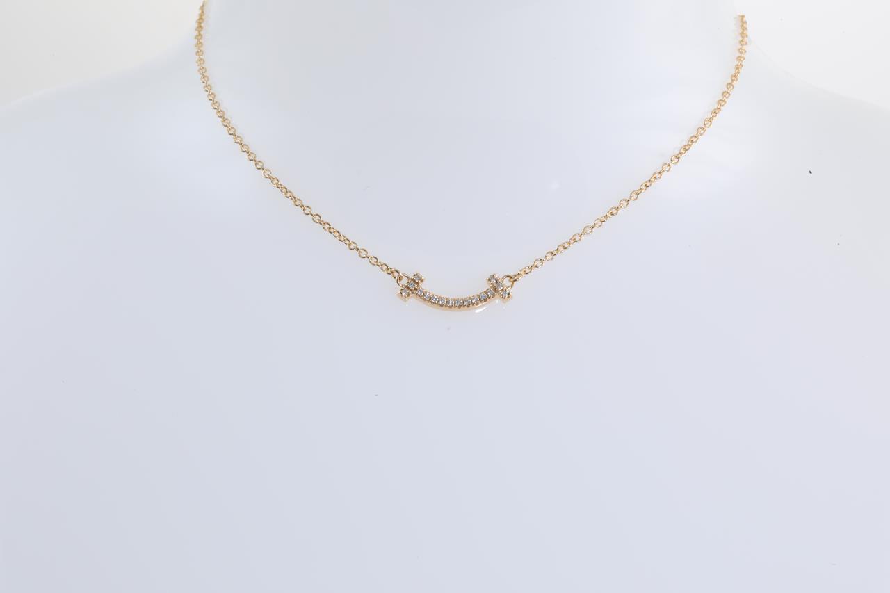 Tiffany & Co T smile necklace with round Diamonds totalling 0.06cts. 18ct rose gold with attached chain. Length: 45cm. Weight: 2.3g (Pre-owned)
