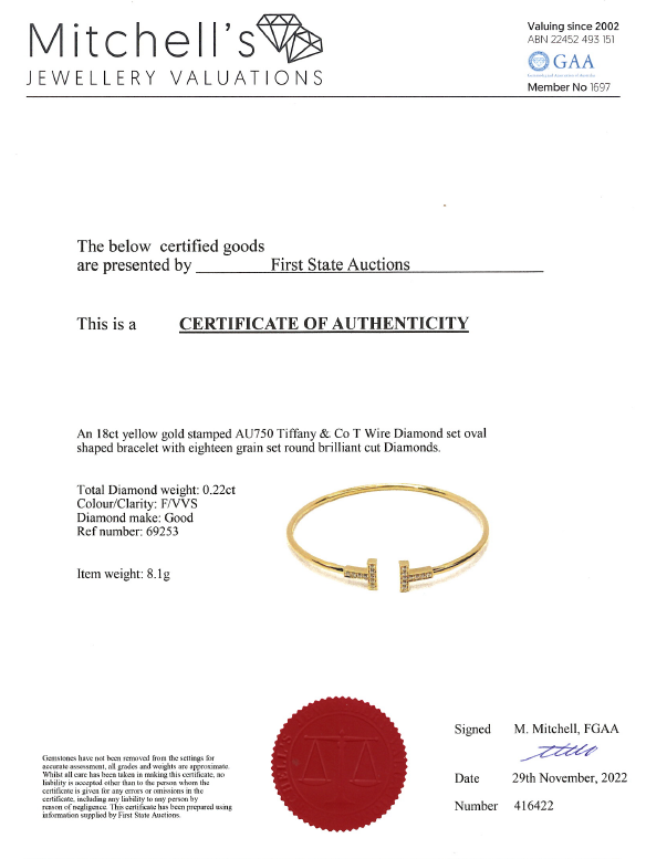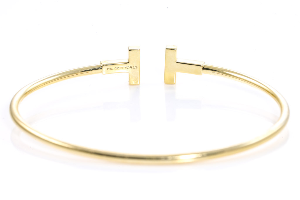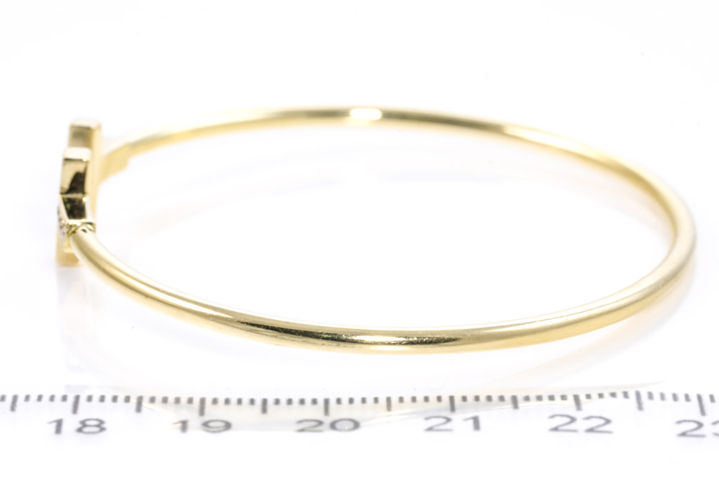 Tiffany & Co T Wire Diamond oval shape bracelet with round Diamonds totalling 0.22cts. Made in Italy. 18ct yellow gold. Circumference: 17cm. Weight: 8.1g. With Certificate #416422. (Pre-owned)