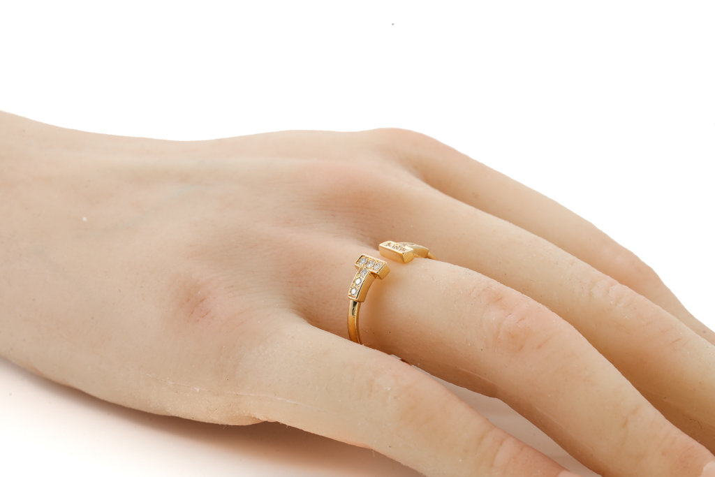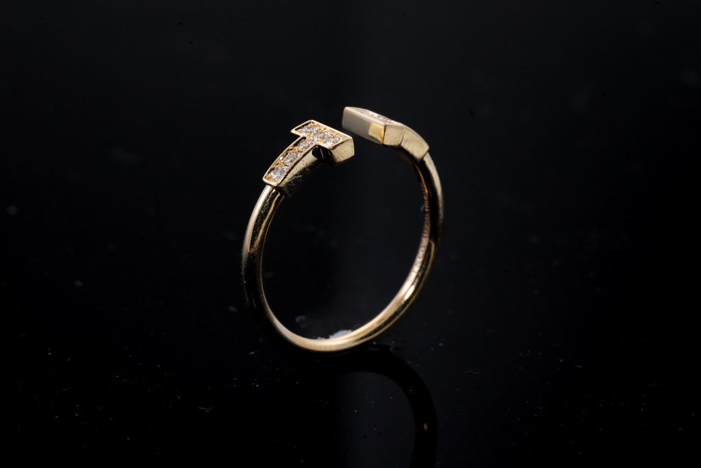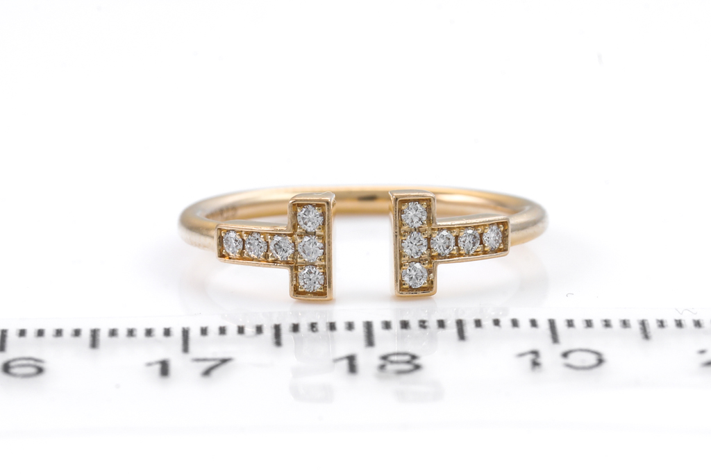 Tiffany & Co T wire ring with round Diamonds totalling 0.13cts. 18ct rose gold. Ring size N1/2- ring resizing is not recommended. Weight: 2.8g. With Tiffany & Co box. (Pre-owned)