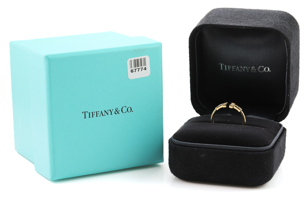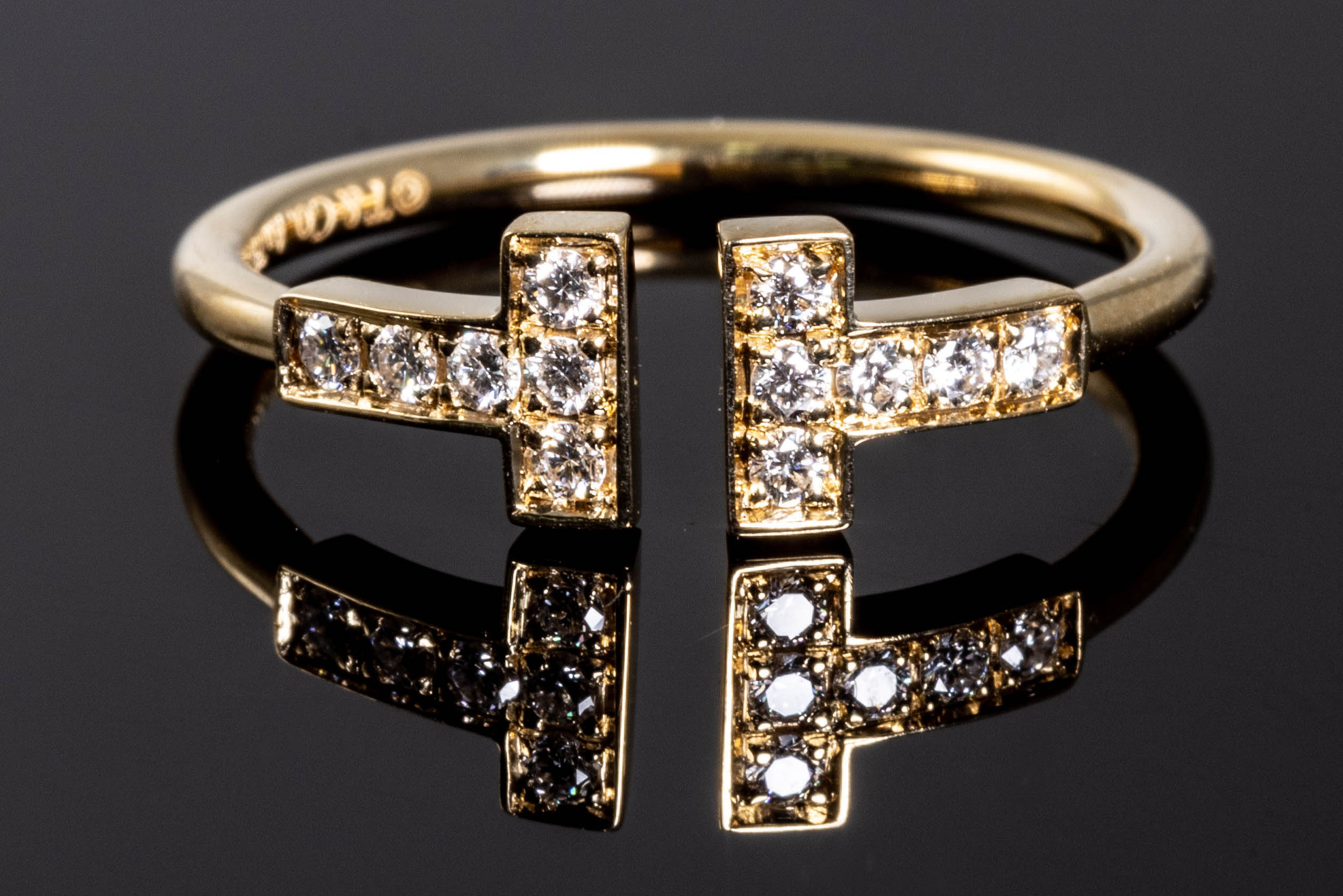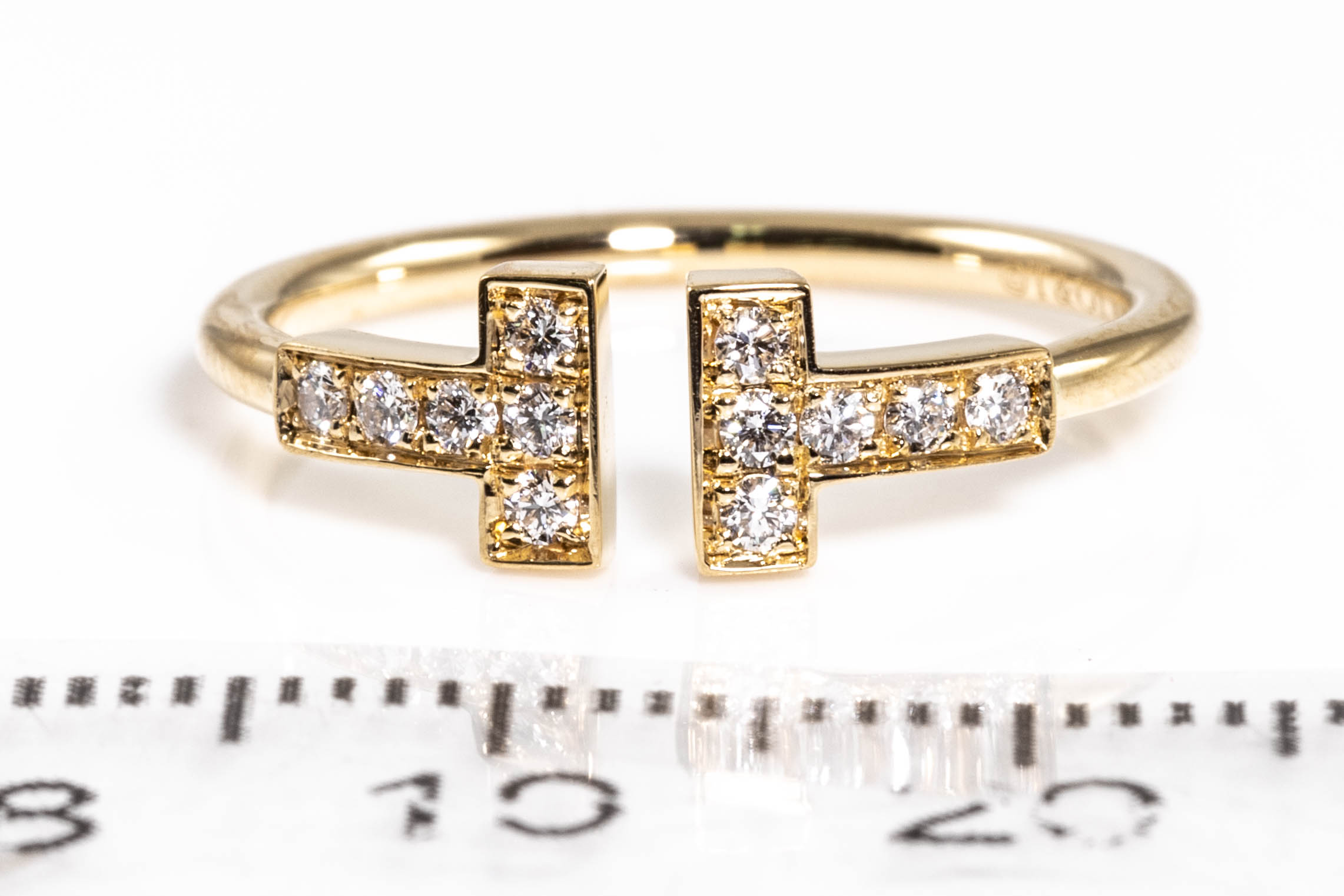 Tiffany & Co T wire ring with round Diamonds totalling 0.13cts. 18ct yellow gold. Ring size M1/2 - ring resizing is not recommended. Weight: 2.4g.With Tiffany & Co box. (Pre-owned)