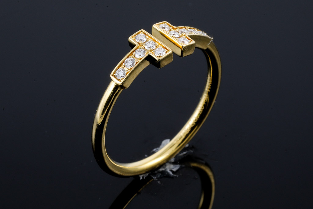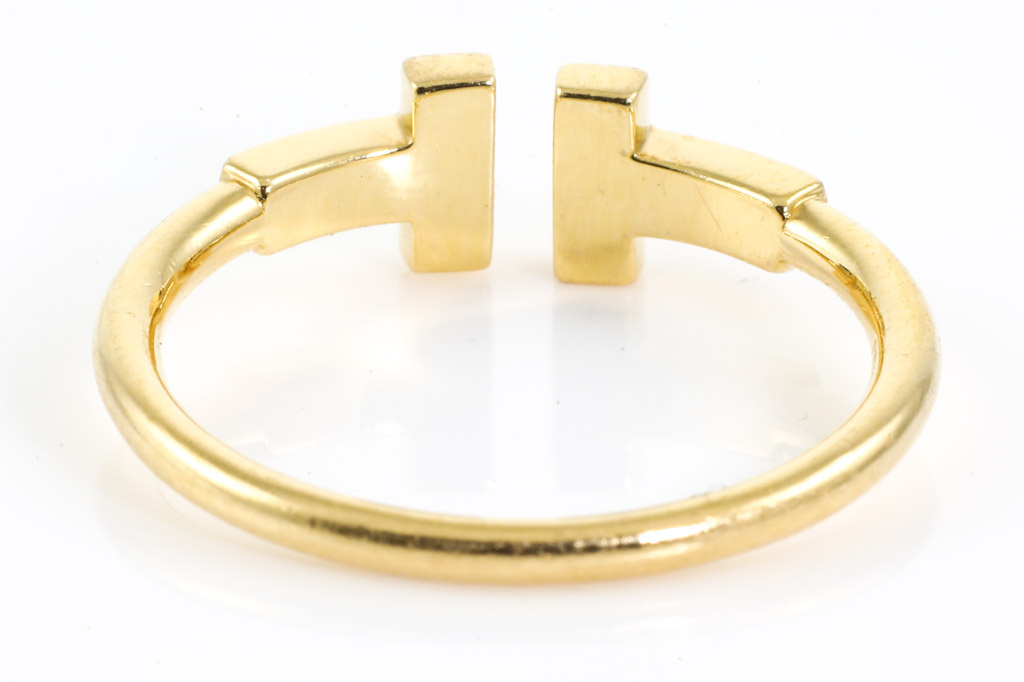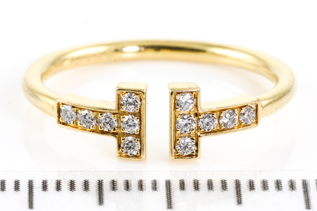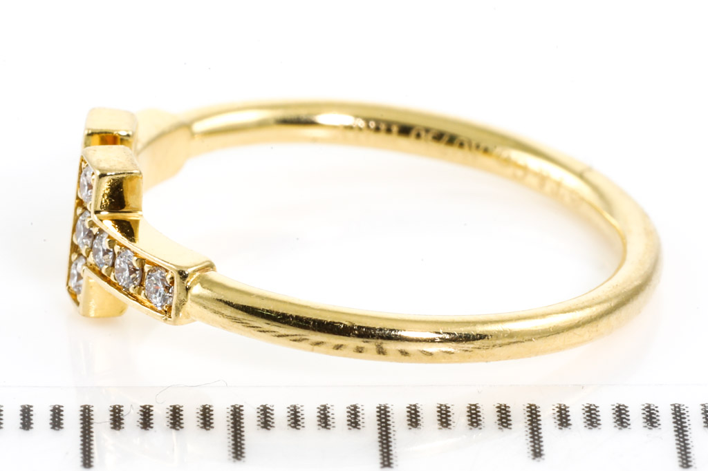 Tiffany & Co T wire ring with round Diamonds totalling approximately 0.15cts. 18ct yellow gold. Ring size N- ring resizing is not recommended. Made in Italy. Weight: 3.3g. (Pre-owned)
