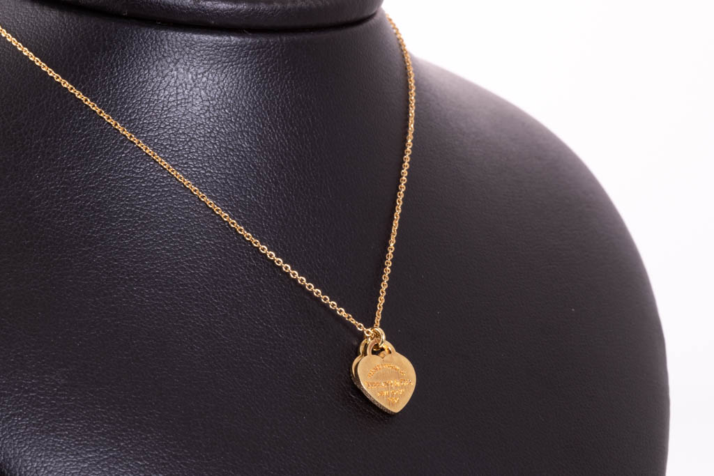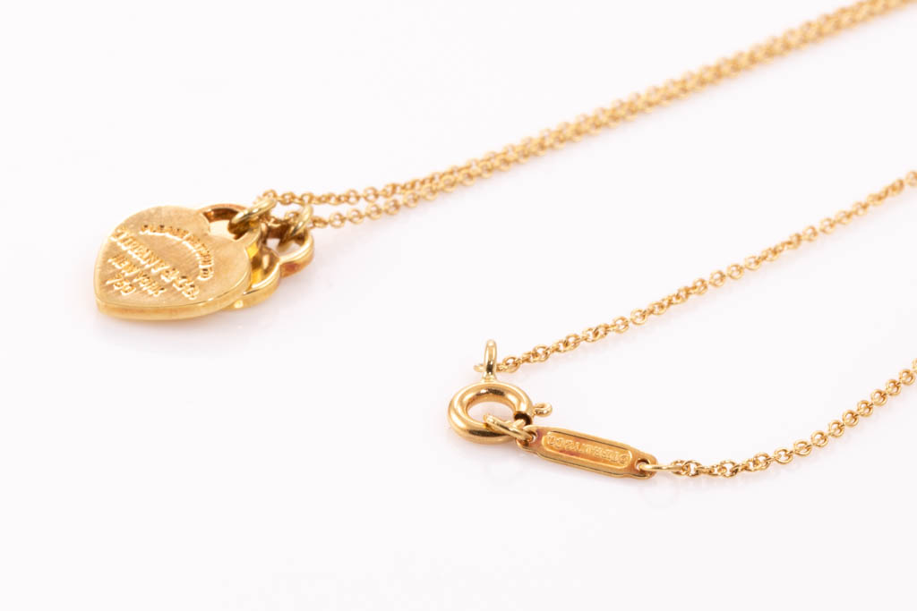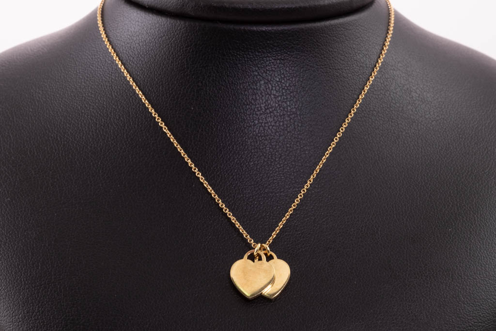 Return To Tiffany Mini Double Heart Tag pendant. 18ct yellow gold with Tiffany & Co. 18ct yellow gold 40cm chain. Weight: 4.5g. With Tiffany & Co box. (Pre-owned)