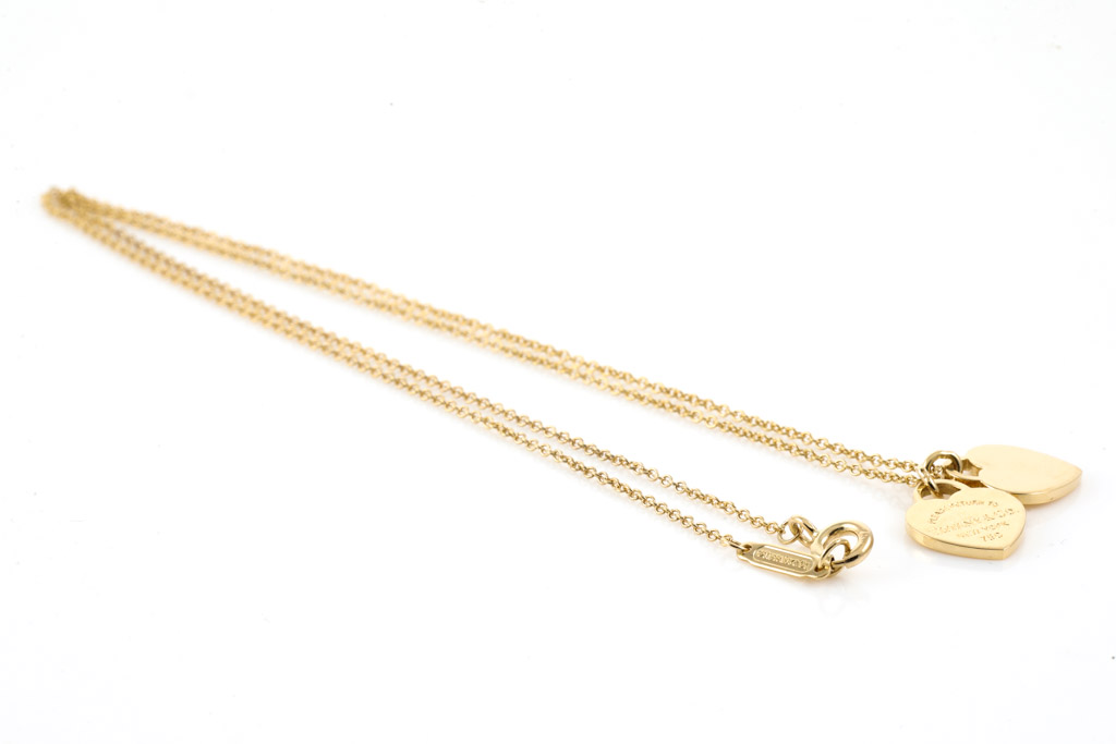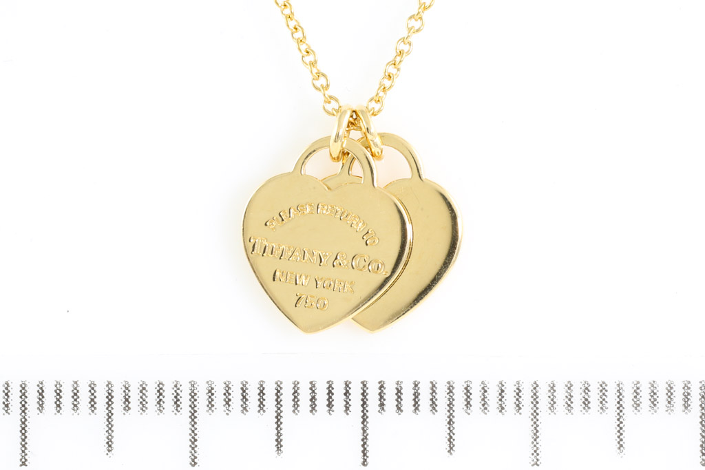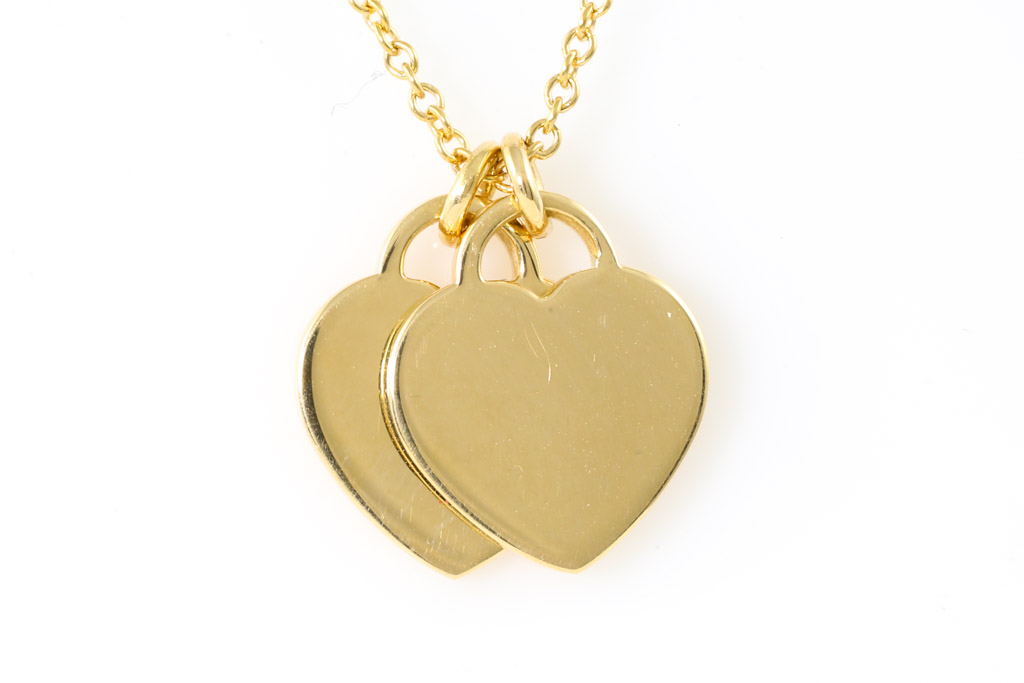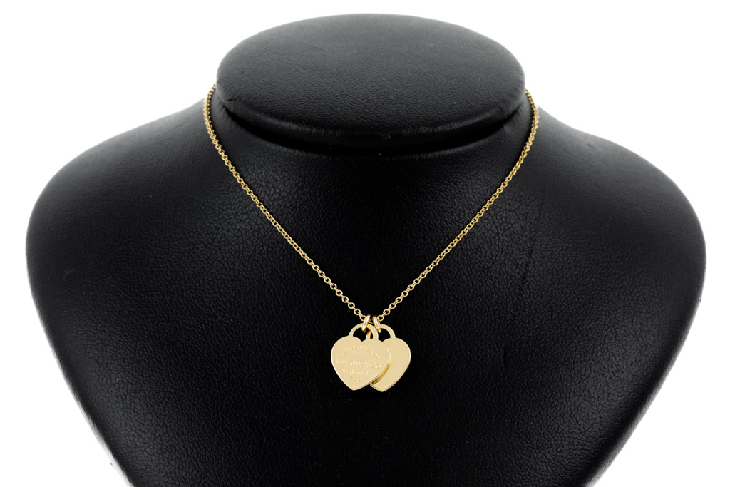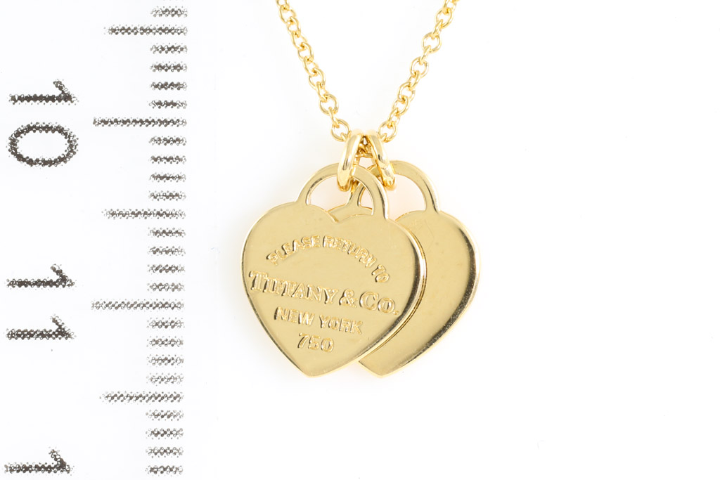 Return To Tiffany Mini Double Heart Tag pendant. 18ct yellow gold with Tiffany & Co 18ct yellow gold 40cm chain. Weight: 4.4g. (Pre-owned)