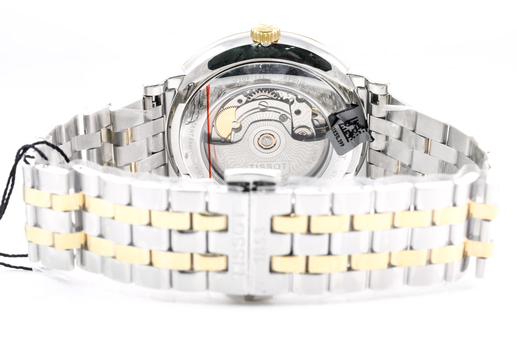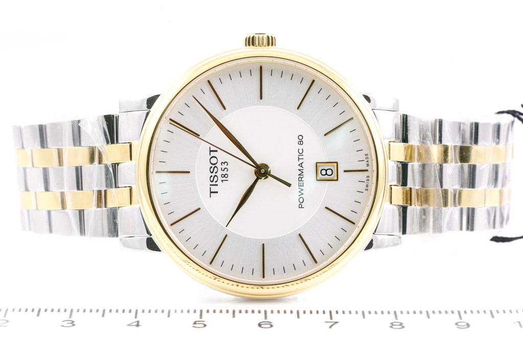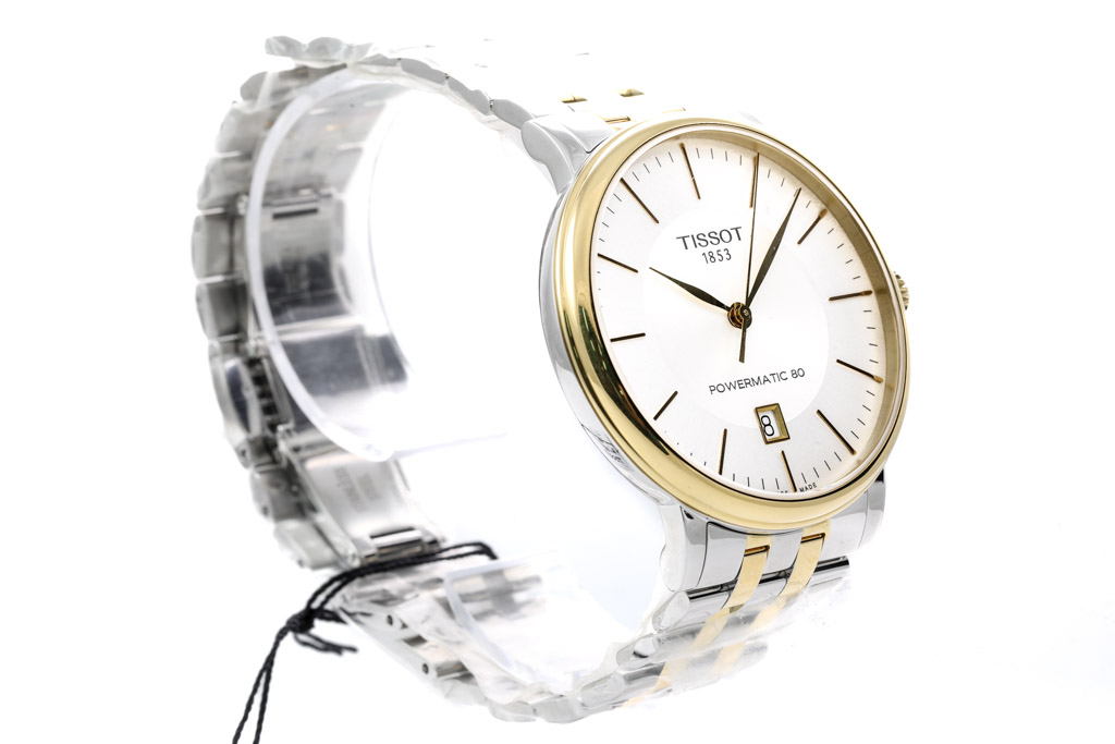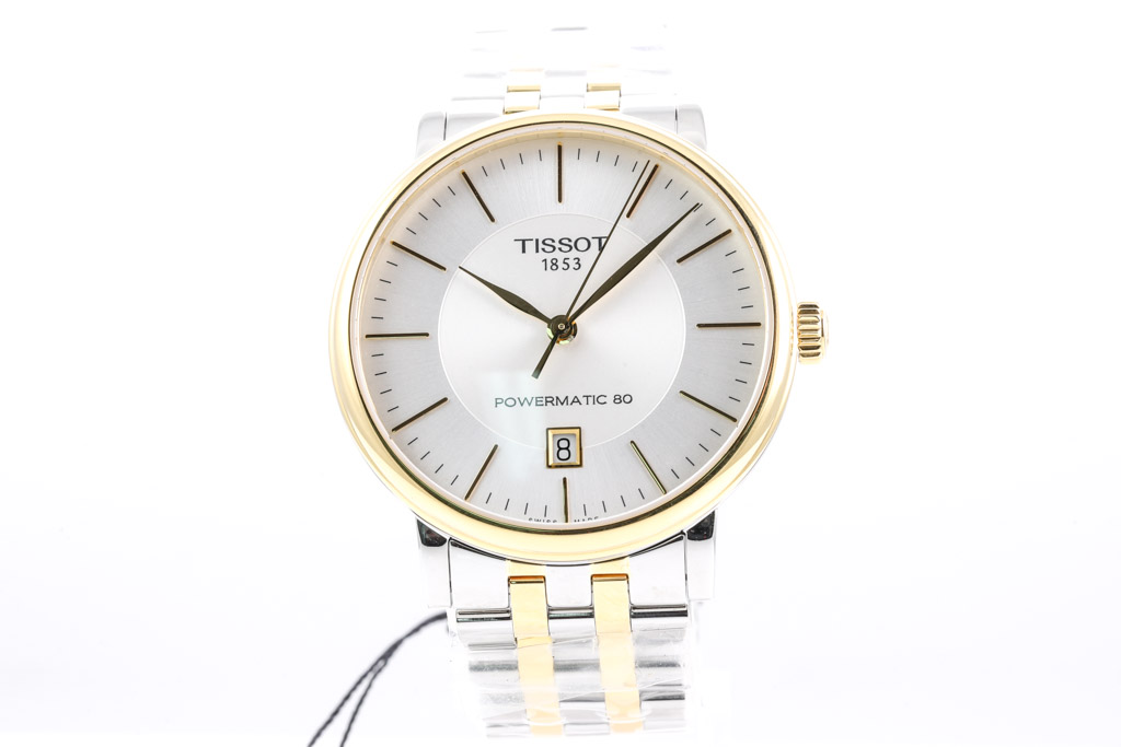 Tissot Carson Premium Powermatic 80 Yellow gold PVD coating and stainless steel automatic mens watch. Silver dial, date, case diameter: 40mm, wrist size: 19cm, Swiss made. Ref# T1224072203100. With Tissot two tone bracelet and clasp. With Tissot box. (As New, Note: minor scratches on case due to being display stock and bracelet in original wrapping)