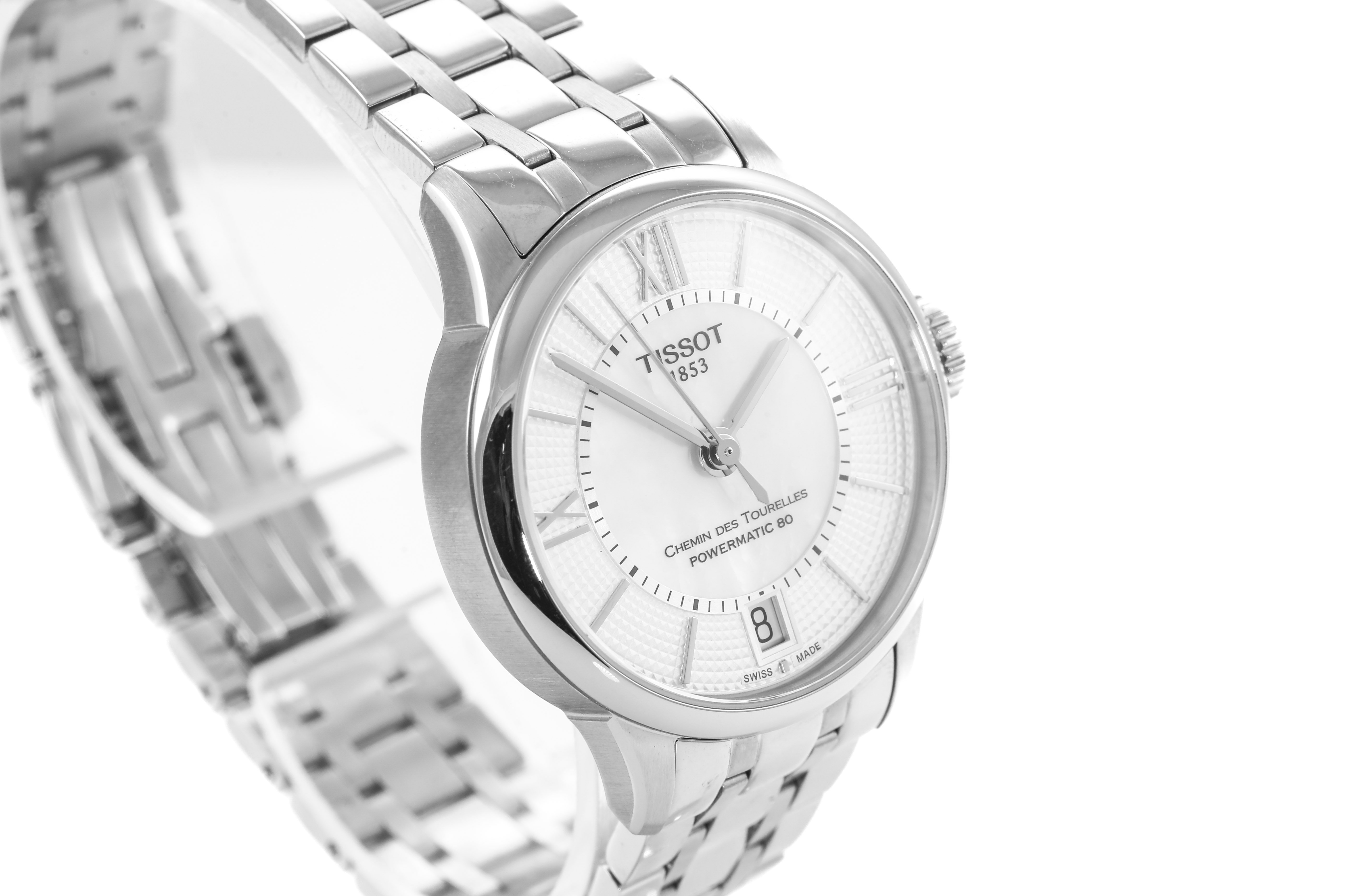Tissot Chemin Des Tourelles Powermatic 80 automatic ladies watch. Mother of Pear dial, date, stainless steel case, case diameter: 32mm, wrist size: 18cm, Swiss made. Ref# T0992071111800. With Tissot stainless steel bracelet and clasp. With Tissot 2 Year International Warranty (no warranty card provided) - to be registered online and instructions will be provided. (As New, Note: minor scratches on case and bracelet due to being display stock)