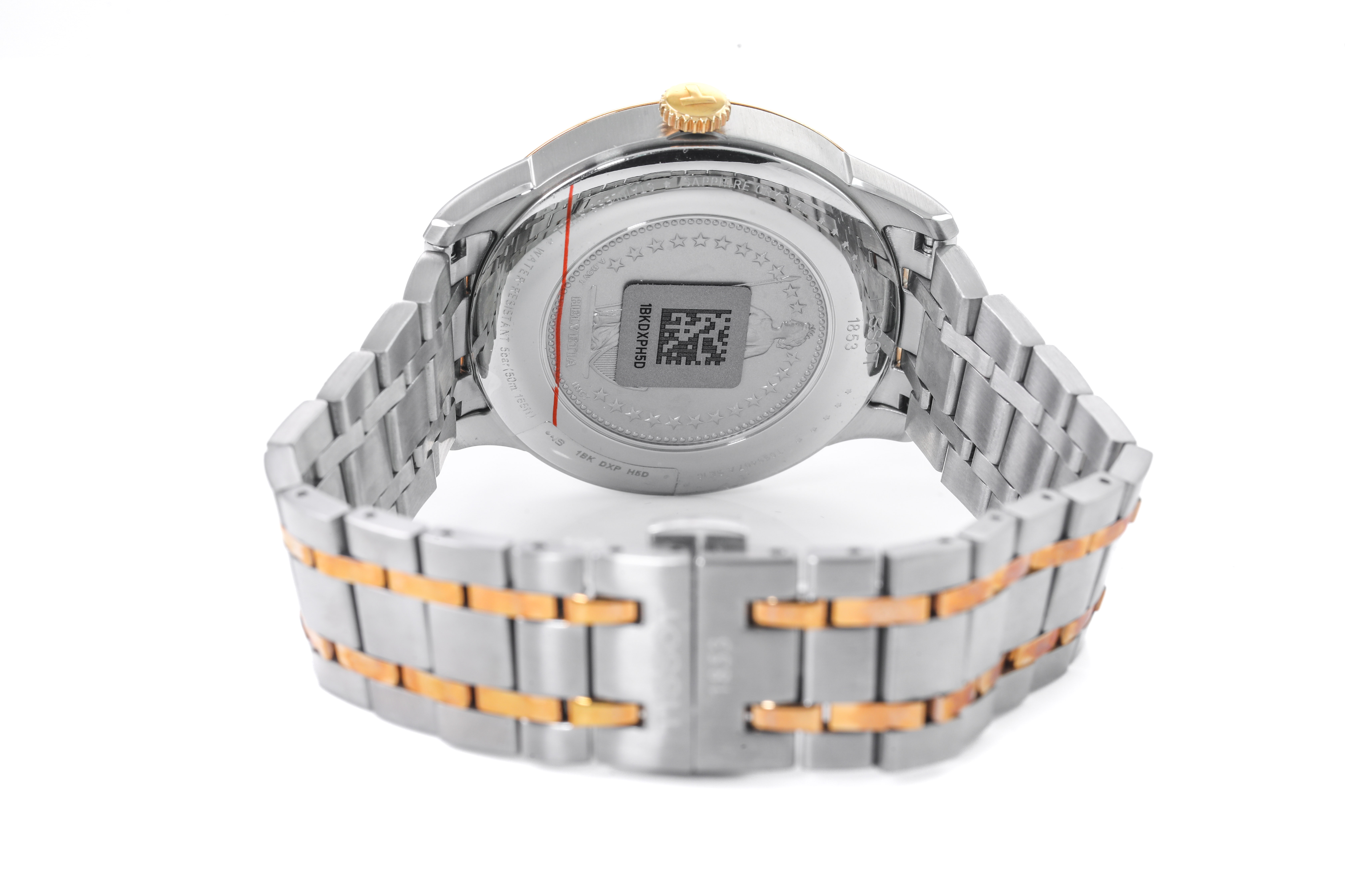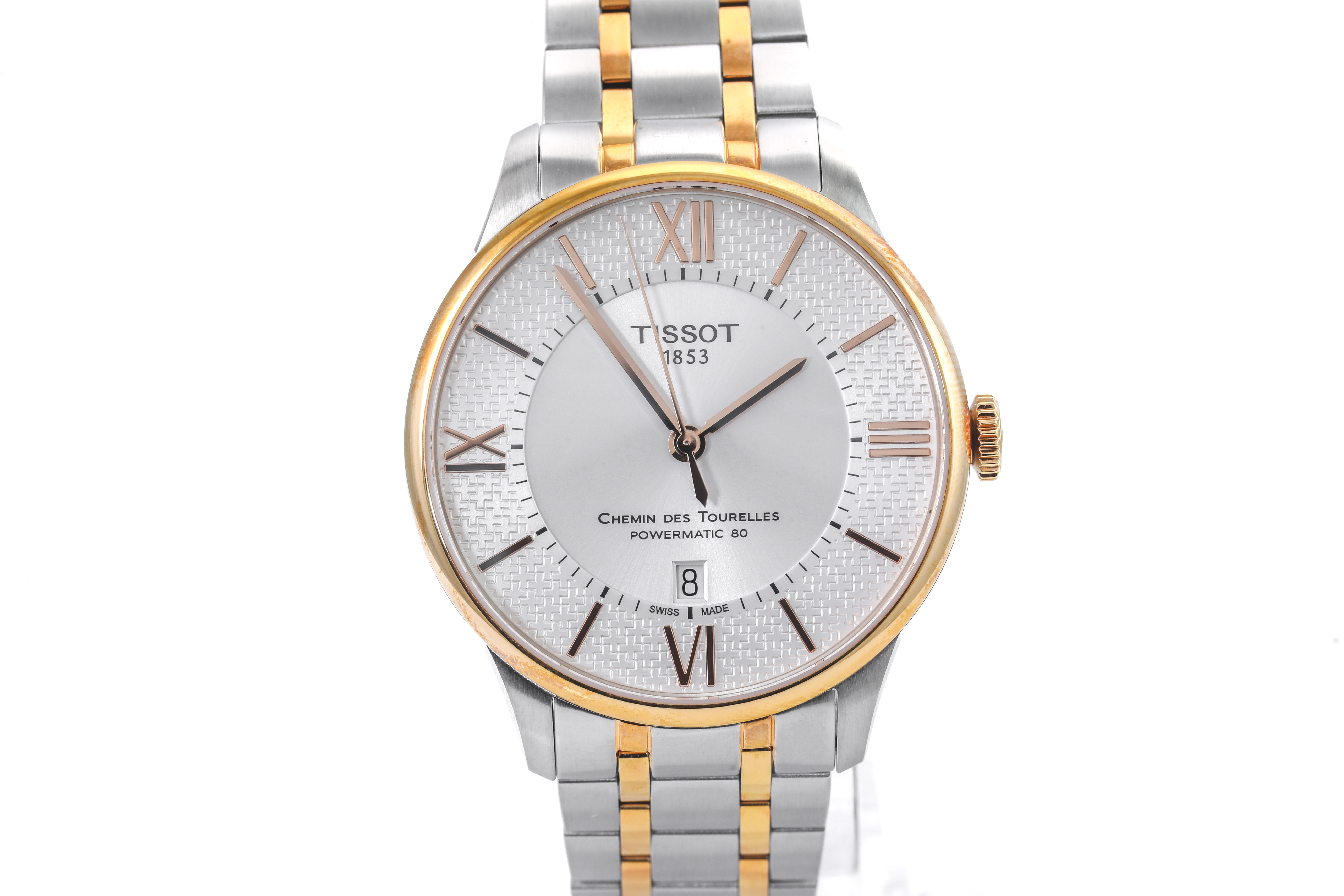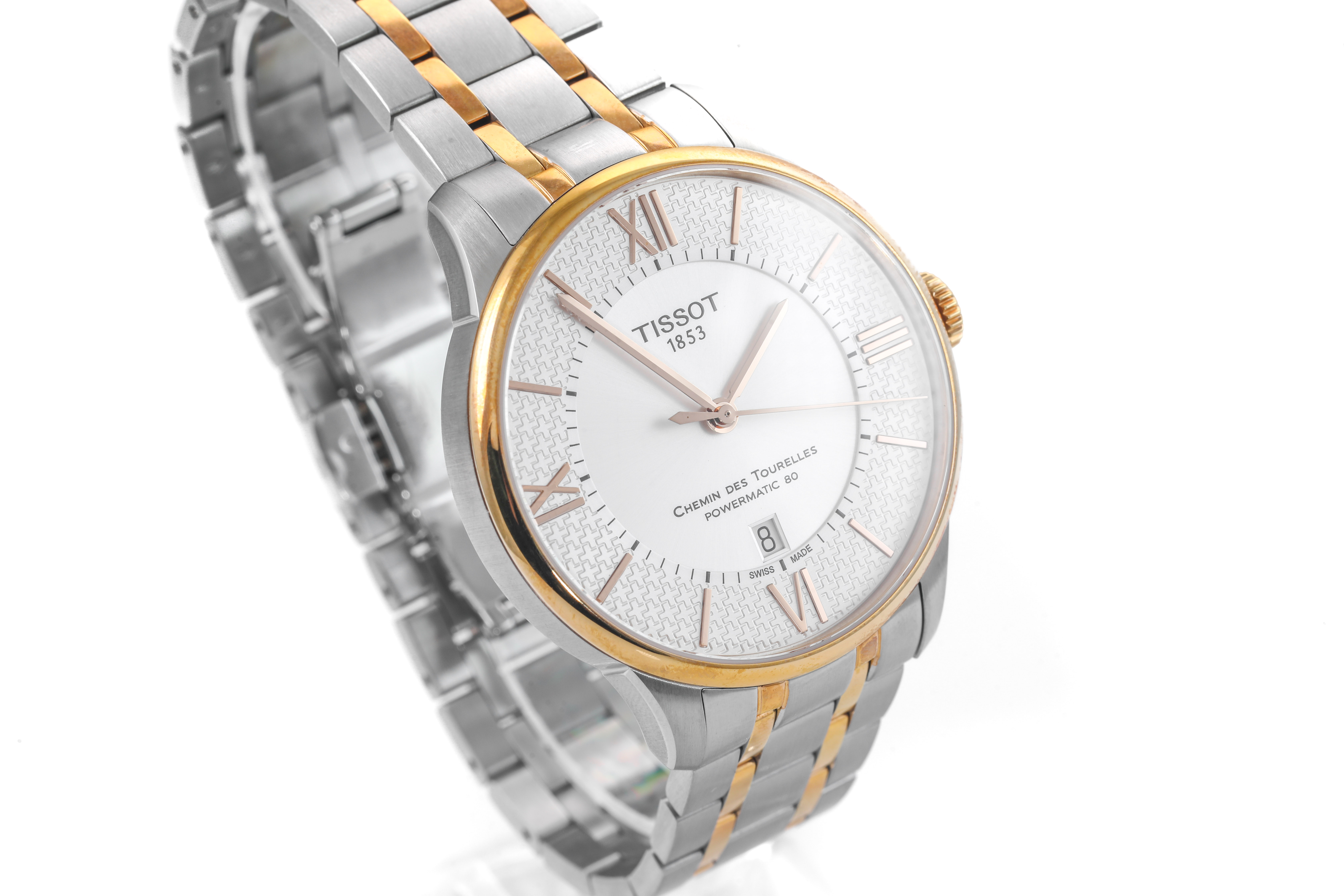 Tissot Chemin Des Tourelles Powermatic 80 Helvetic Pride Special Edition stainless steel and rose gold PVD automatic mens watch. Silver dial, date, case diameter: 42mm, wrist size: 20cm, Swiss made. Ref# T0994072203801. With Tissot two tone bracelet and clasp. With Tissot 2 year digital warranty (no warranty card provided) - to be registered online and instruction will be provided . (As New)