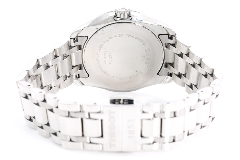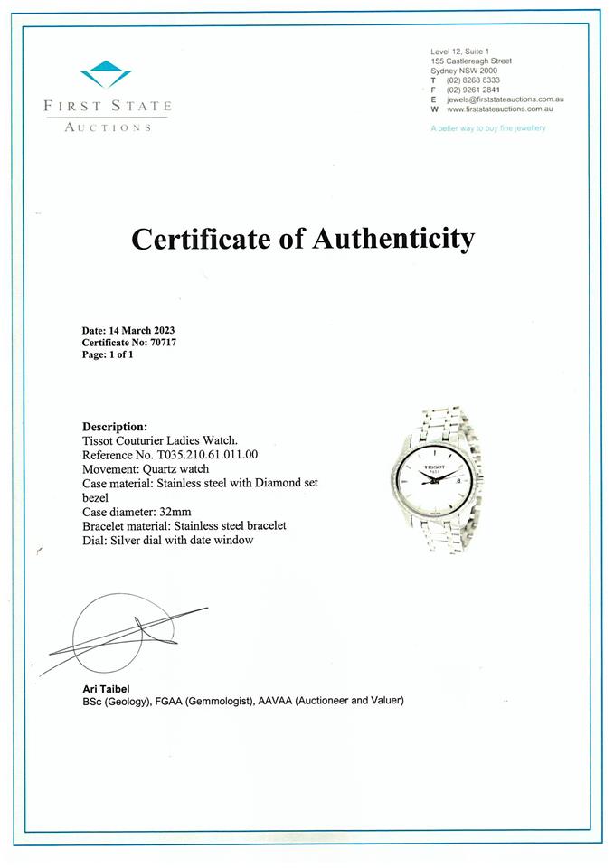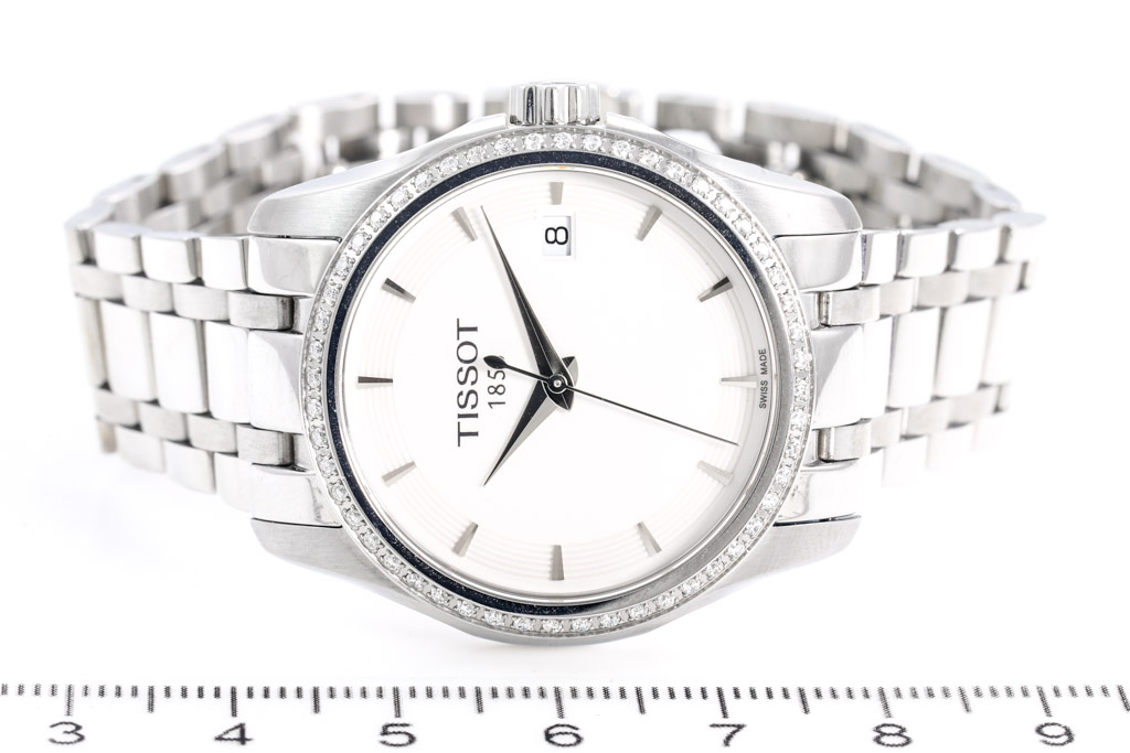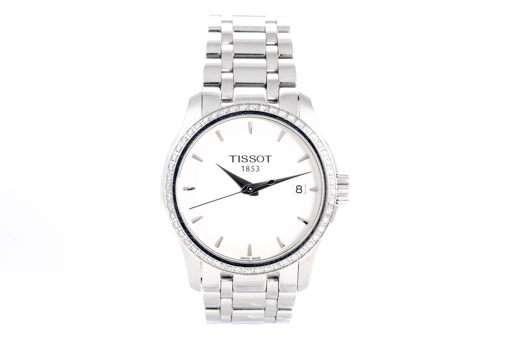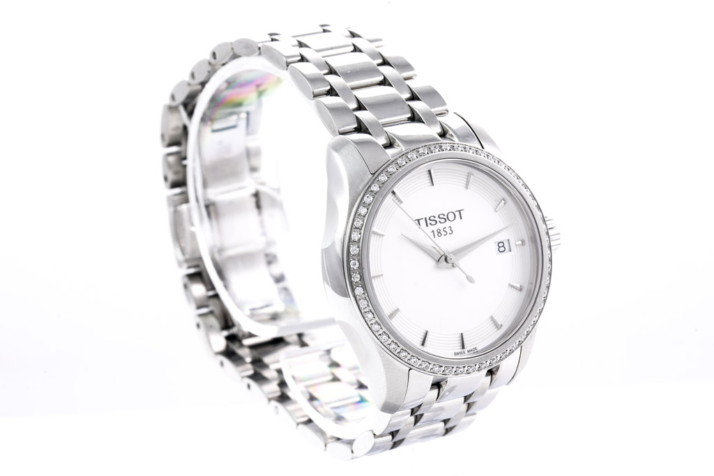 Tissot Couturier stainless steel quartz ladies watch. Silver dial, Diamond set bezel, date, case diameter: 32mm, wrist size: 17.5cm, Swiss made. Ref# T035.210.61.011.00. With Tissot stainless steel bracelet and clasp. With FSA Certificate of Authenticity and Tissot box. 3 month FSA warranty. (As new, Note: scratches on case and bracelet due to being display stock)