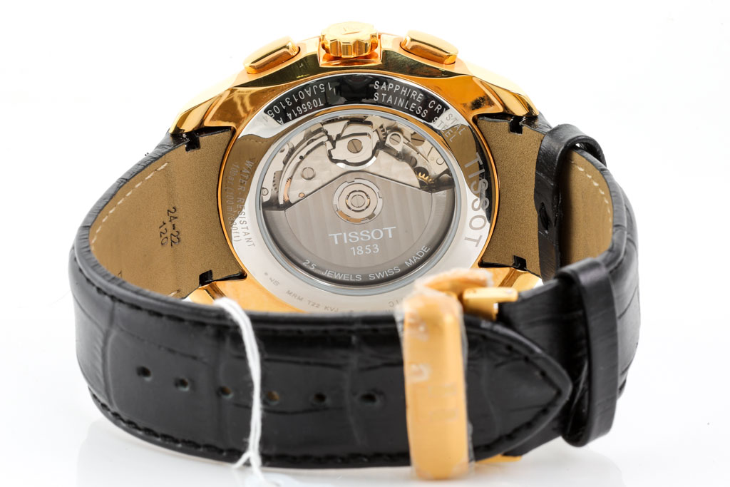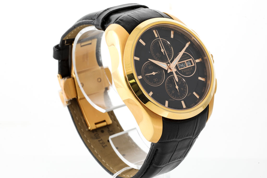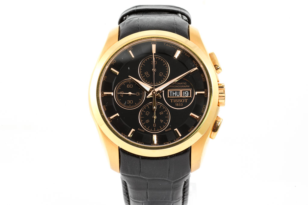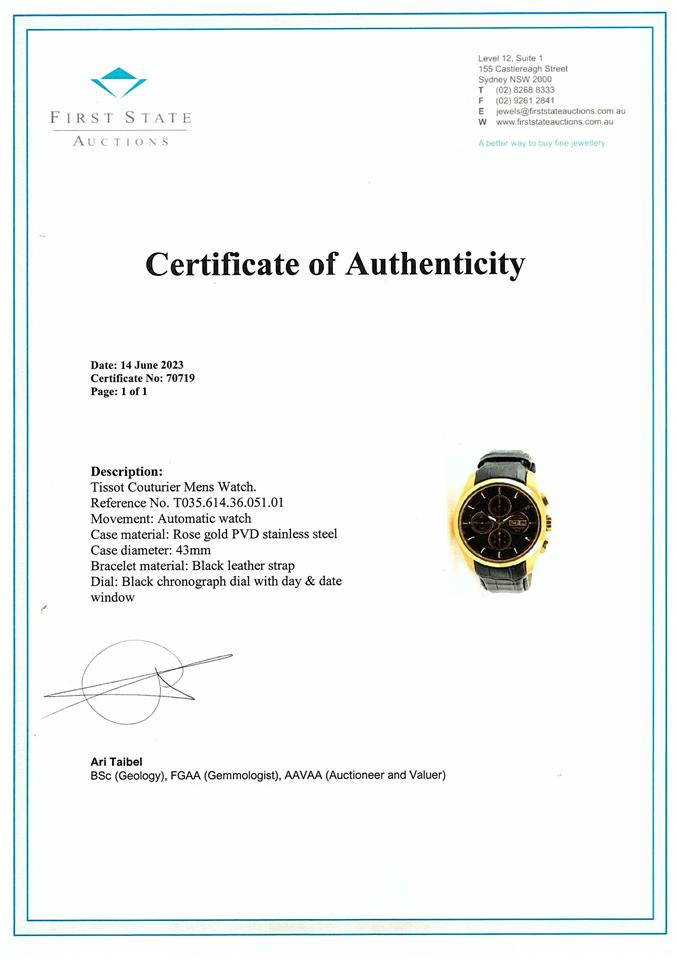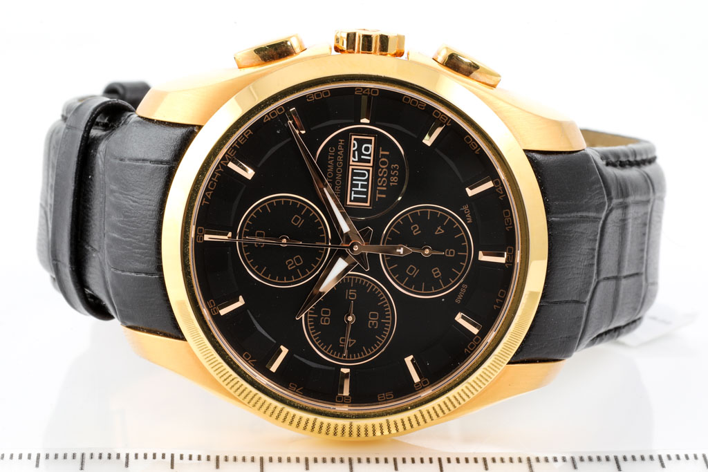 Tissot Couturier rose gold PVD stainless steel automatic mens watch. Black chronograph dial, day & date, case diameter: 43mm, adjustable max wrist size: 18.5cm, Swiss made. Ref# T035.614.36.051.01. With Tissot black leather strap and clasp. With FSA certificate of authenticity and Tissot box. 3 month FSA warranty apply. (As new, Note: scratches on case and light wear on strap due to being display stock)