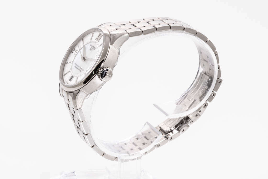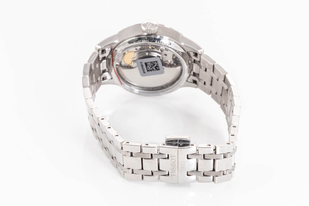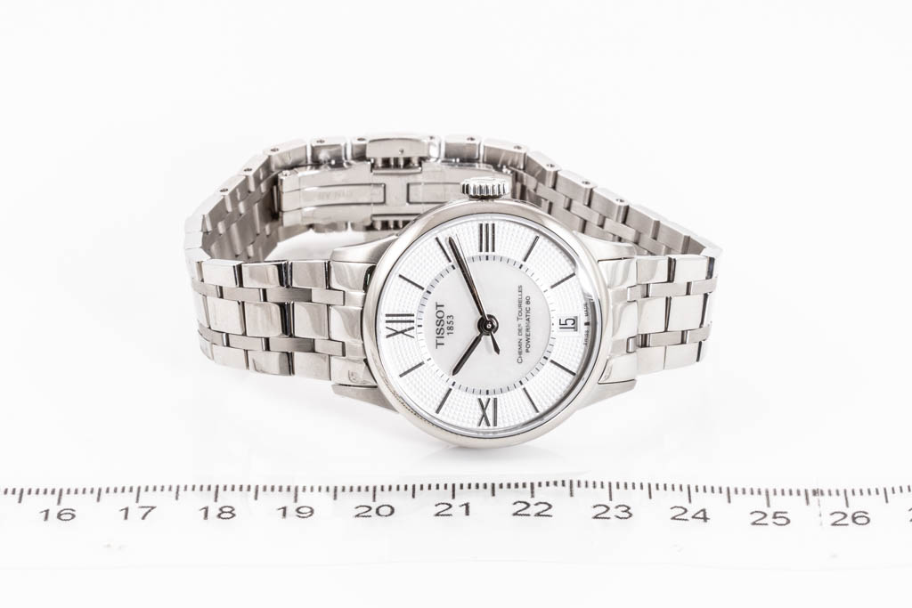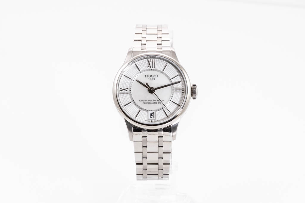 Tissot Chemin Des Tourelles Powermatic stainless steel automatic ladies watch. White with Mother of Pearl dial, date, case diameter: 32mm, wrist size: 18cm, Swiss made. Ref#T0992071111800. With Tissot stainless steel bracelet and clasp. No warranty card provided - warranty to be registered online, instructions will be provided . (As New, Note: minor scratches on case and bracelet due to being display stock)