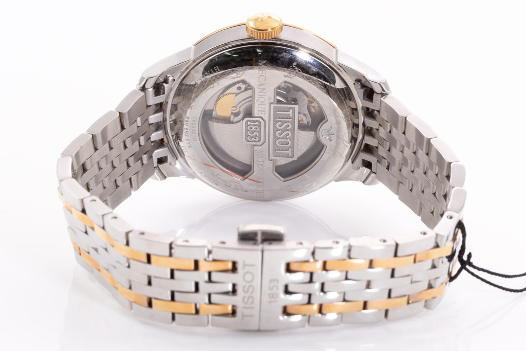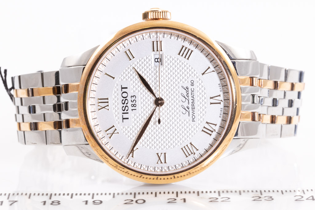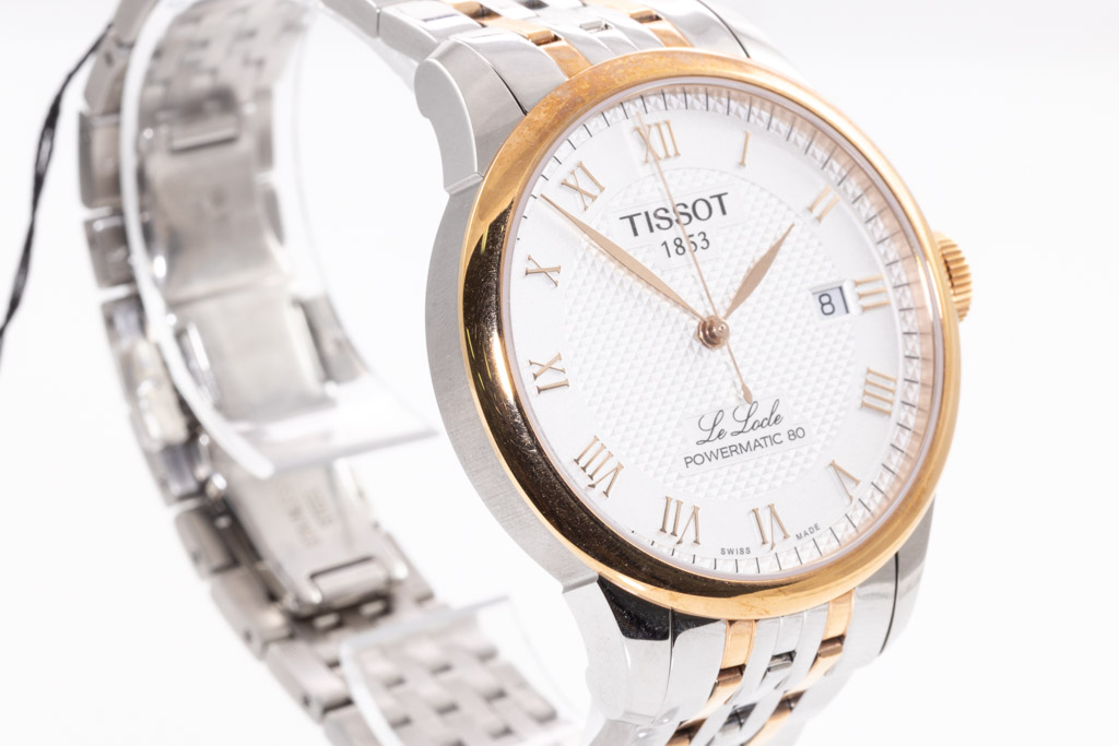 Tissot Le Locle Powermatic 80 rose gold PVD coating with stainless steel automatic men's watch. Silver dial, date, case diameter: 39.3mm, wrist size: 19cm, Swiss made. Ref# T0064072203300. With Tissot two tone bracelet and clasp. With Tissot 2 year International Warranty Card and Tissot box. Longines 2 year warranty applies. (As new, Note: minor scratches on case and bracelet due to being display stock)