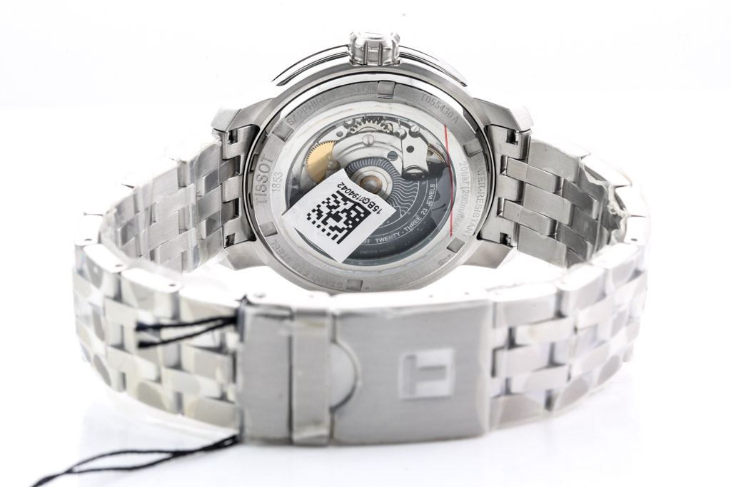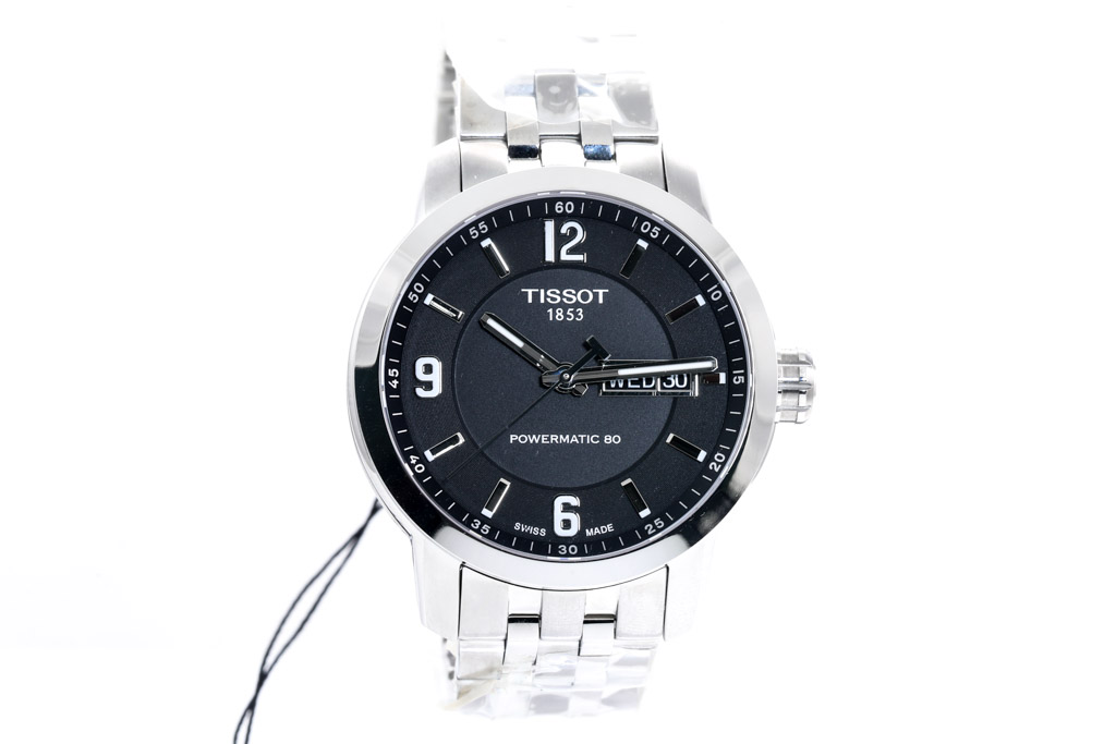 Tissot Powermatic 80 stainless steel automatic men's watch. Black dial, day & date, case diameter: 39mm, wrist size: 20cm, Swiss made. Ref# T0554301105700. With Tissot stainless steel bracelet and clasp. With Tissot 2 year International Warranty Card and Tissot box. Tissot 2 year warranty applies. (As new, Note: minor scratches on case due to being display stock and bracelet in original wrapping)