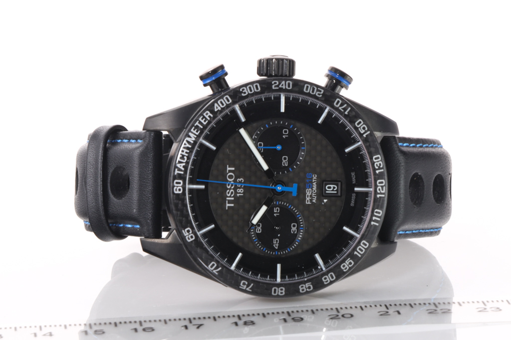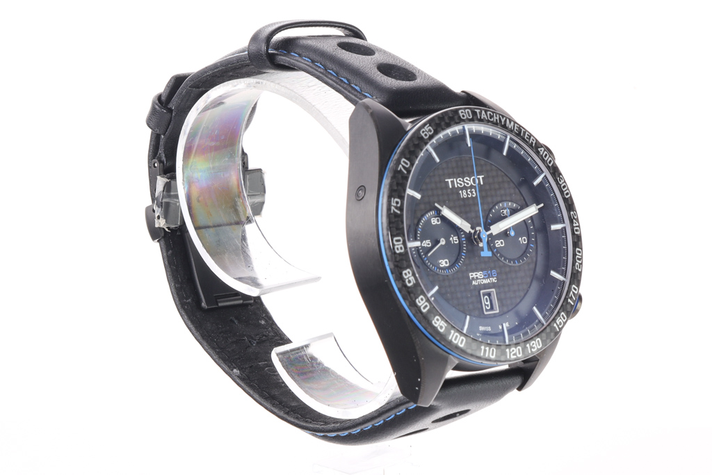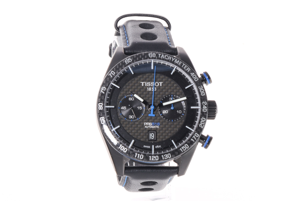 Tissot PRS 516 black PVD stainless steel automatic mens watch. Black chronograph dial, date, case diameter: 45mm, adjustable max wrist size: 21cm, Swiss made. Ref# T100.427.36.201.00. With Tissot black leather strap and clasp. With FSA Certificate of Authenticity and Tissot box. 3 month FSA warranty. (As new, Note: minor scratches on case and wear on strap due to being display stock)