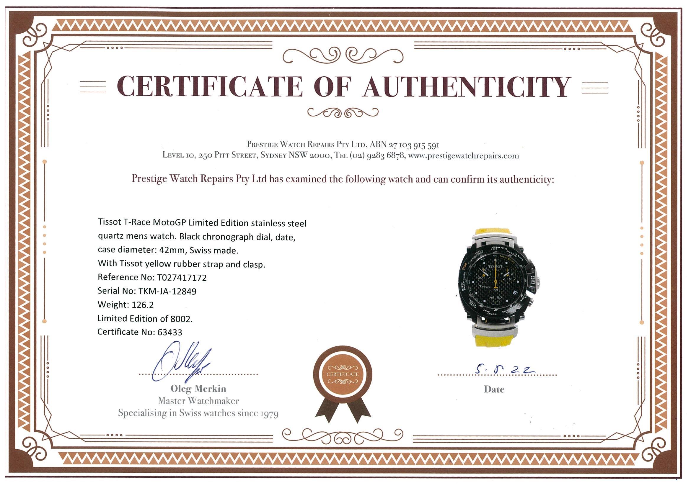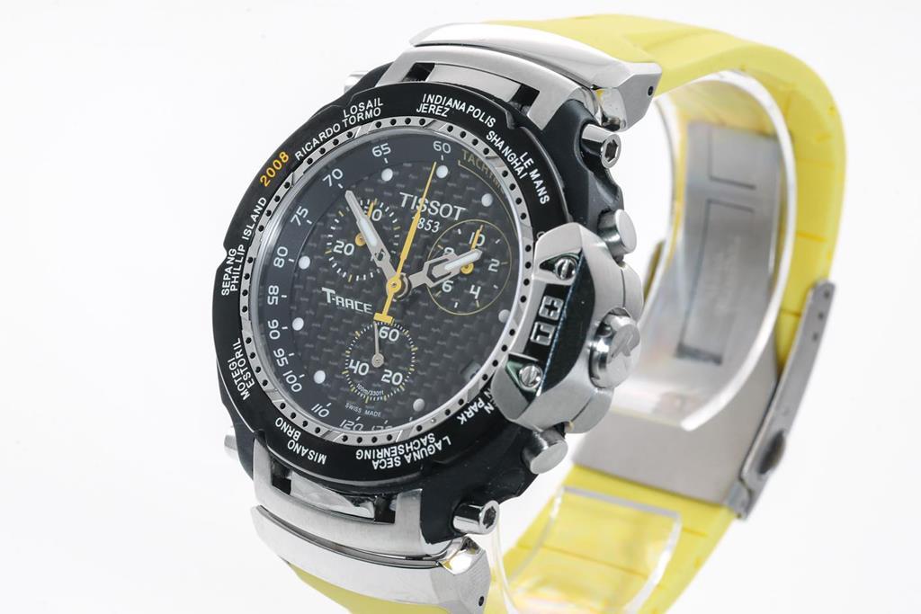 Tissot T-Race MotoGP Limited Edition stainless steel quartz mens watch. Black chronograph dial, date, case diameter: 42mm, wrist size: 19cm, Swiss made. Ref# T027417172. Limited Edition of 8002. With Tissot yellow rubber strap and clasp. With Certificate of Authenticity and Tissot box. 3 month FSA warranty. (Pre-owned)