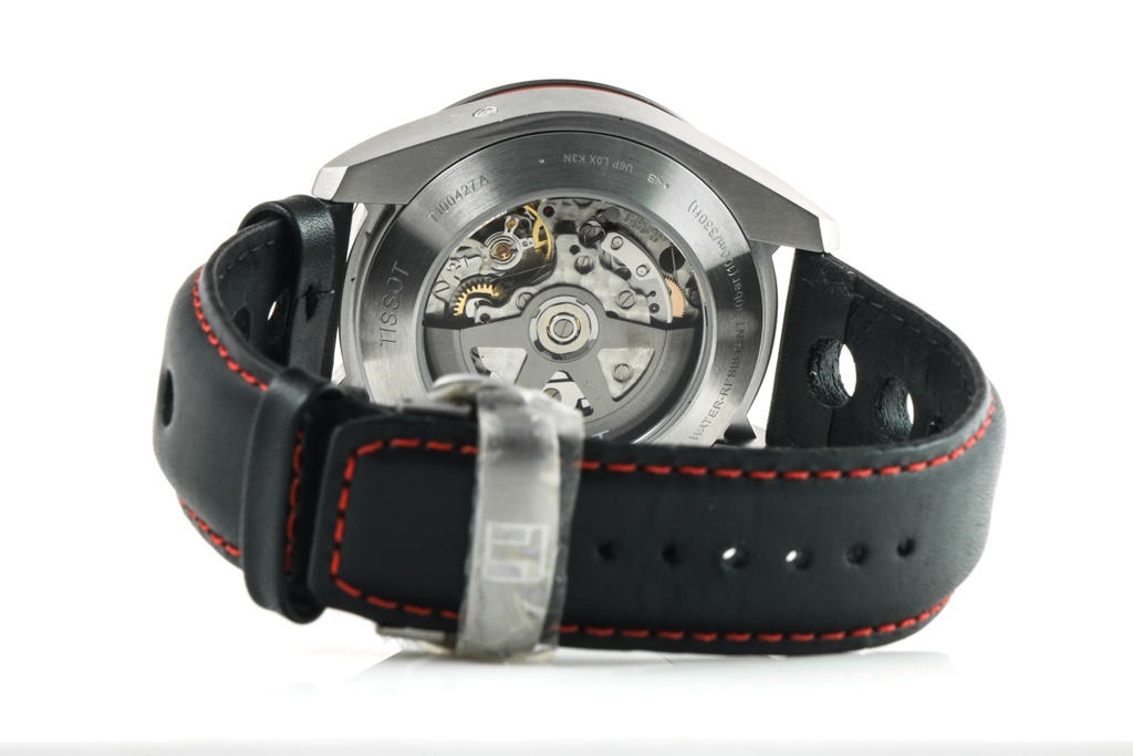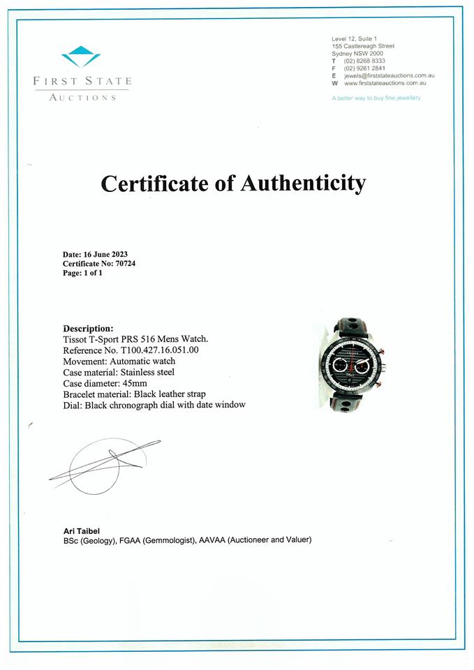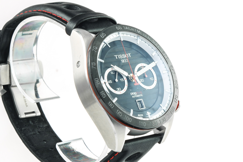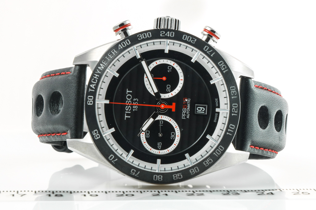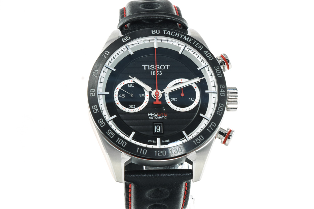 Tissot T-Sport PRS 516 stainless steel automatic mens watch. Black chronograph dial, date, case diameter: 45mm, adjustable max wrist size: 21cm, Swiss made. Ref# T100.427.16.051.00. With Tissot black leather strap and clasp. With FSA Certificate of Authenticity and Tissot box. 3 month FSA warranty. (As new, Note: wear on strap and minor scratches on case due to being display stock)