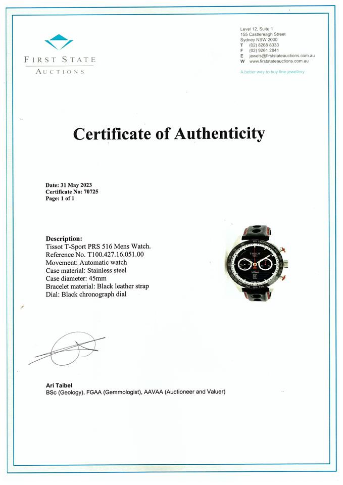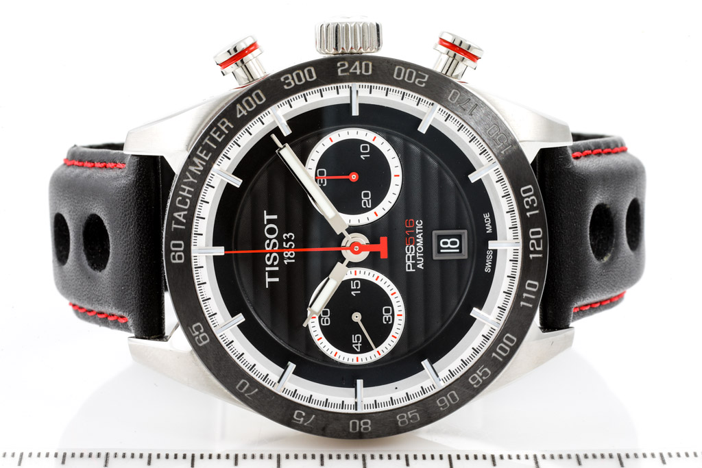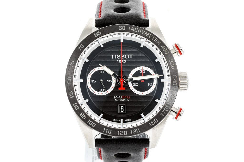Tissot T-Sport PRS 516 stainless steel automatic mens watch. Black chronograph dial, date, case diameter: 45mm, adjustable max wrist size: 21cm, Swiss made. Ref# T100.427.16.051.00. With Tissot black leather strap and clasp. With FSA Certificate of Authenticity and Tissot box. 3 month FSA warranty apply. (As new, Note: wear on strap and minor scratches on case due to being display stock)