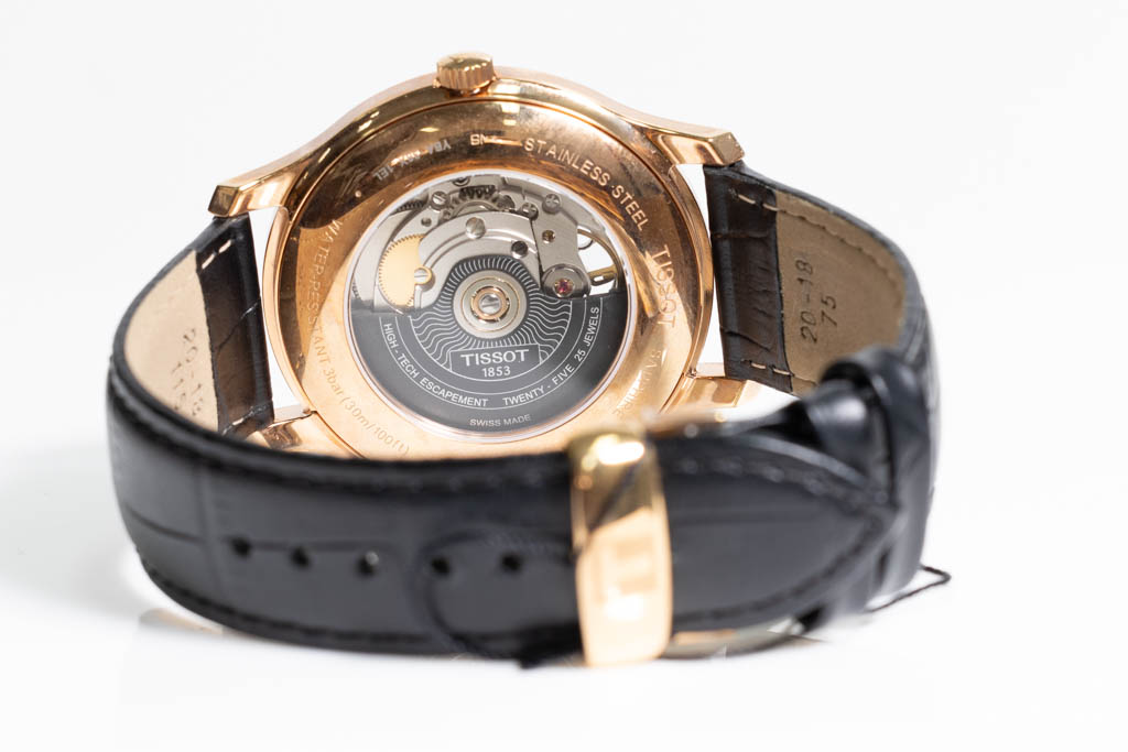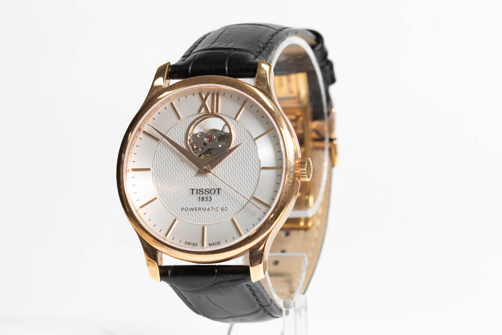 Tissot Tradition Powermatic 80 Open Heart stainless steel with rose gold PVD coating automatic mens watch. Silver dial, case diameter: 40mm, wrist size: 19cm, Swiss made. Ref#T0639073603800. With Tissot black leather and clasp. No warranty card provided - warranty to be registered online and details will be provided. (As New, Note: Note: scratches & discolouration on case and light wear on strap due to being display stock)