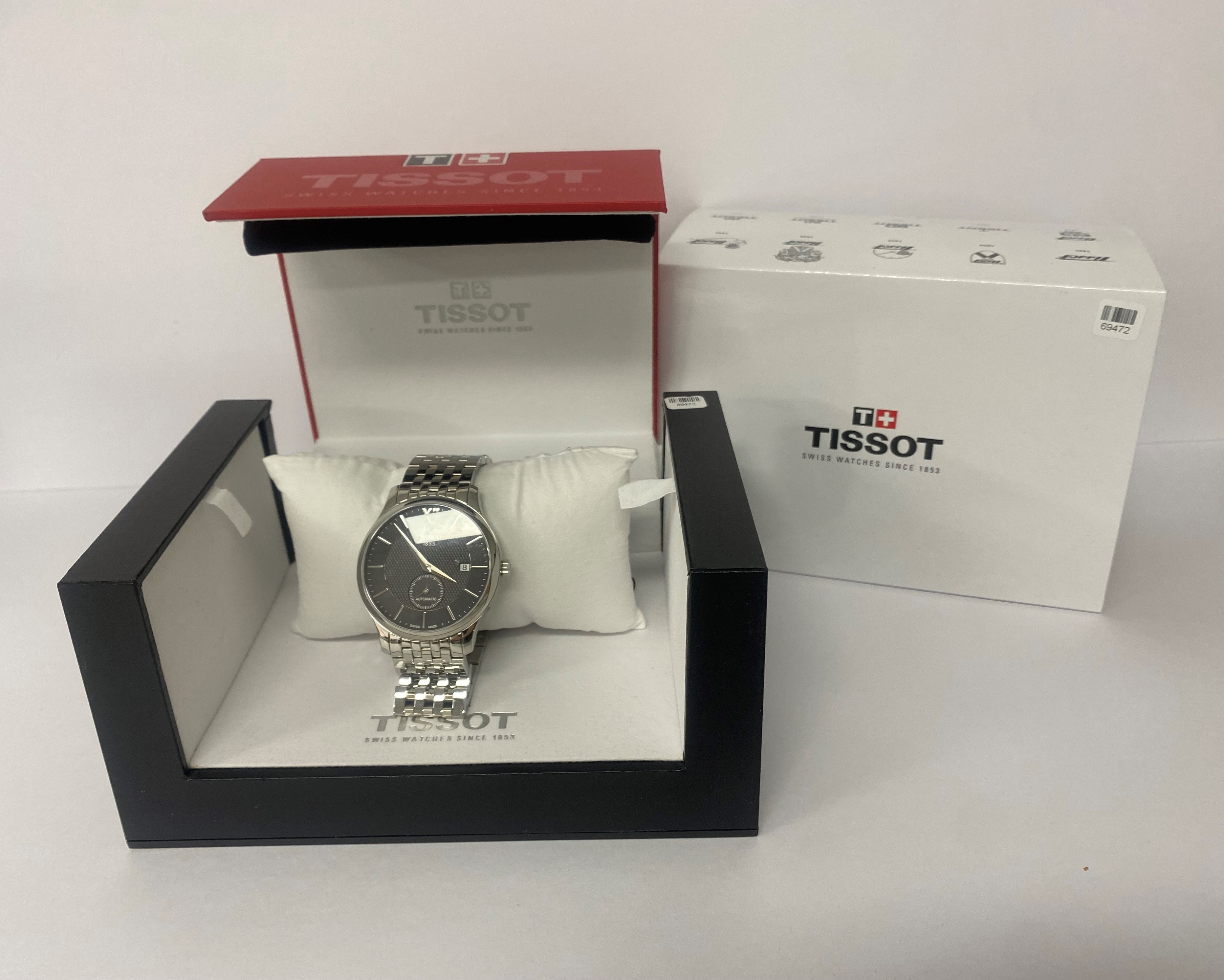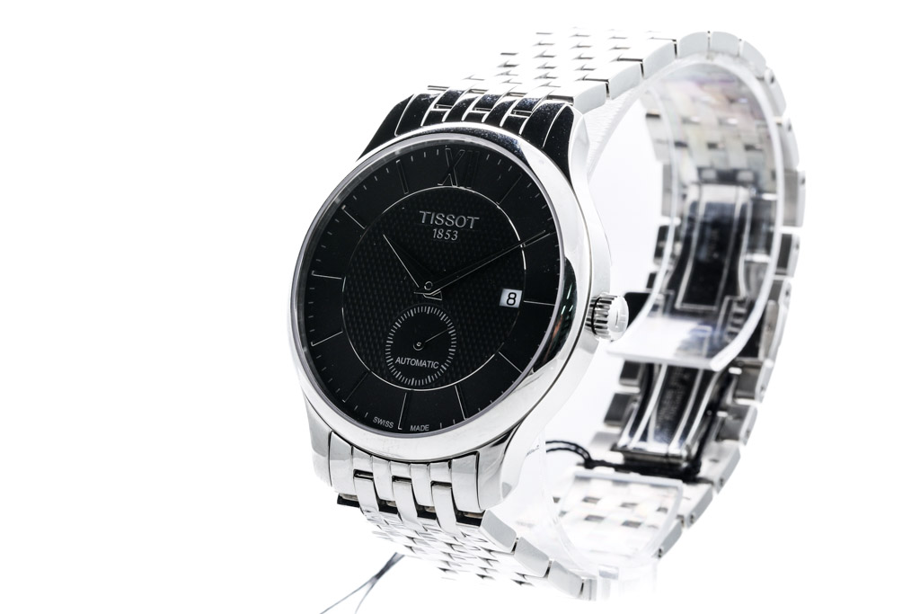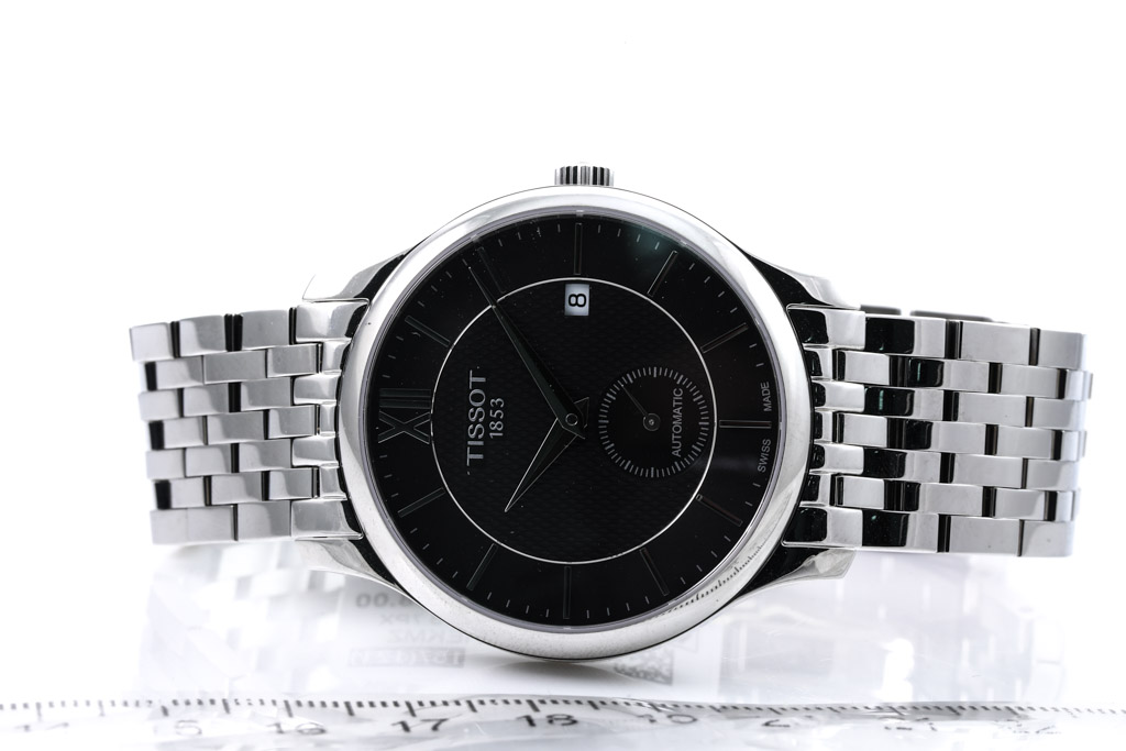Tissot tradition stainless steel automatic mens watch. Black dial, date, small second, case diameter: 40mm, wrist size: 20cm, Swiss made. Ref# T0634281105800. With Tissot stainless steel bracelet and clasp. With Tissot International Warranty card. Tissot 2 year warranty applies. (As New, Note: minor scratches on case and bracelet due to being display stock)