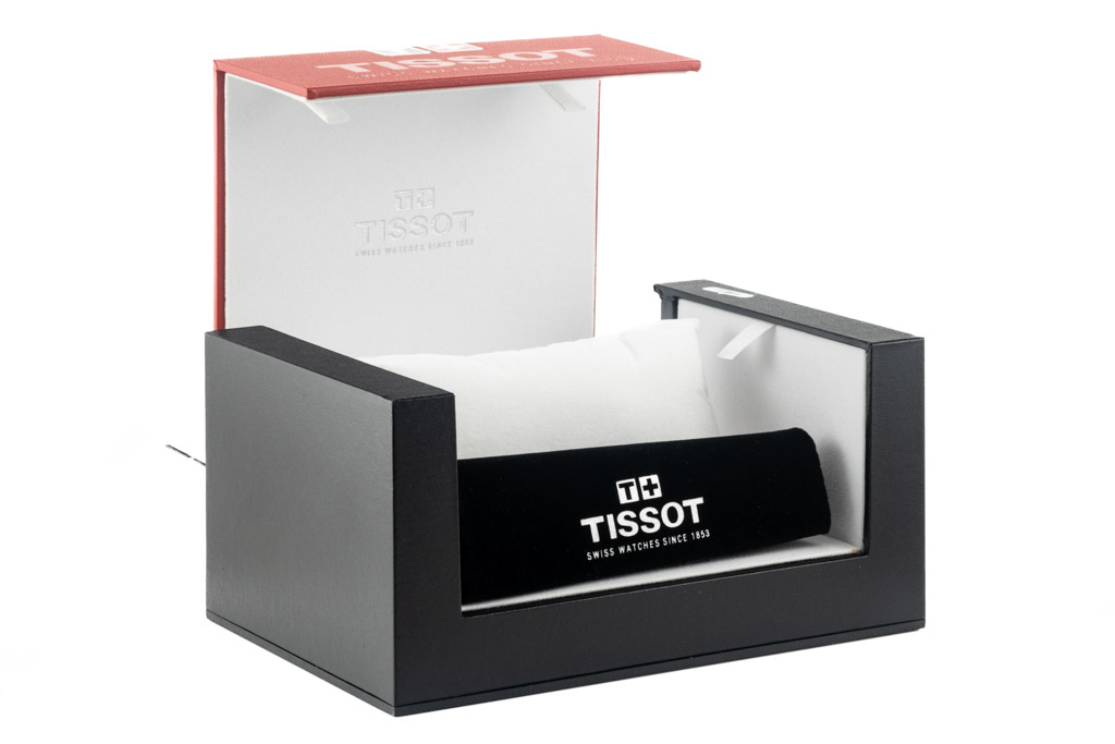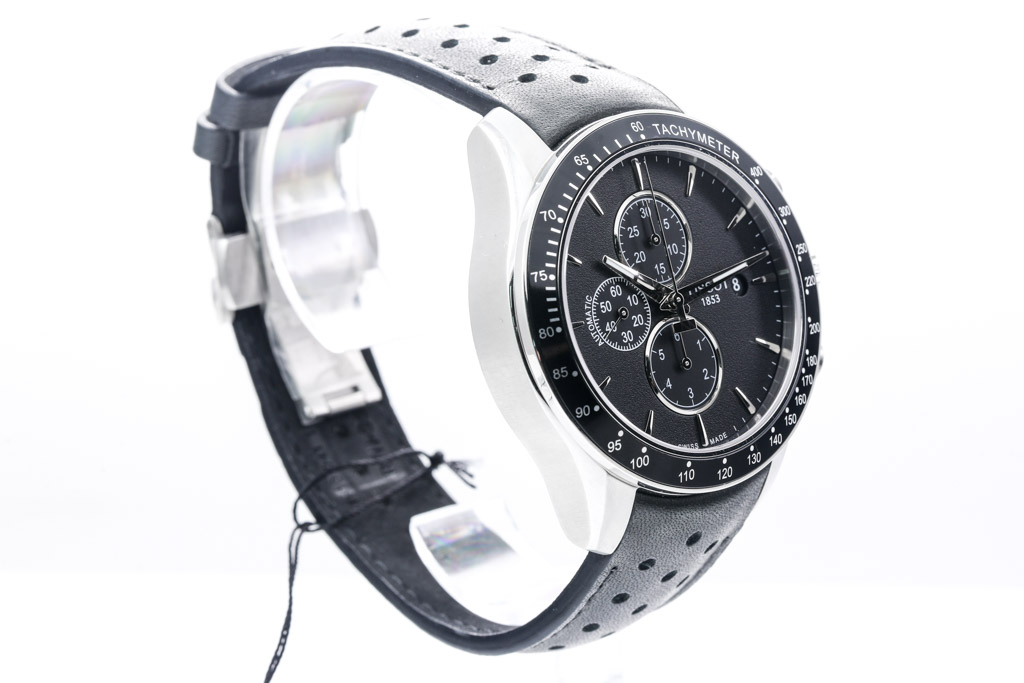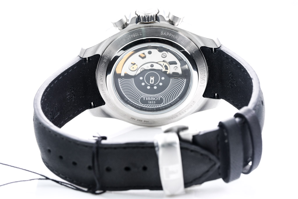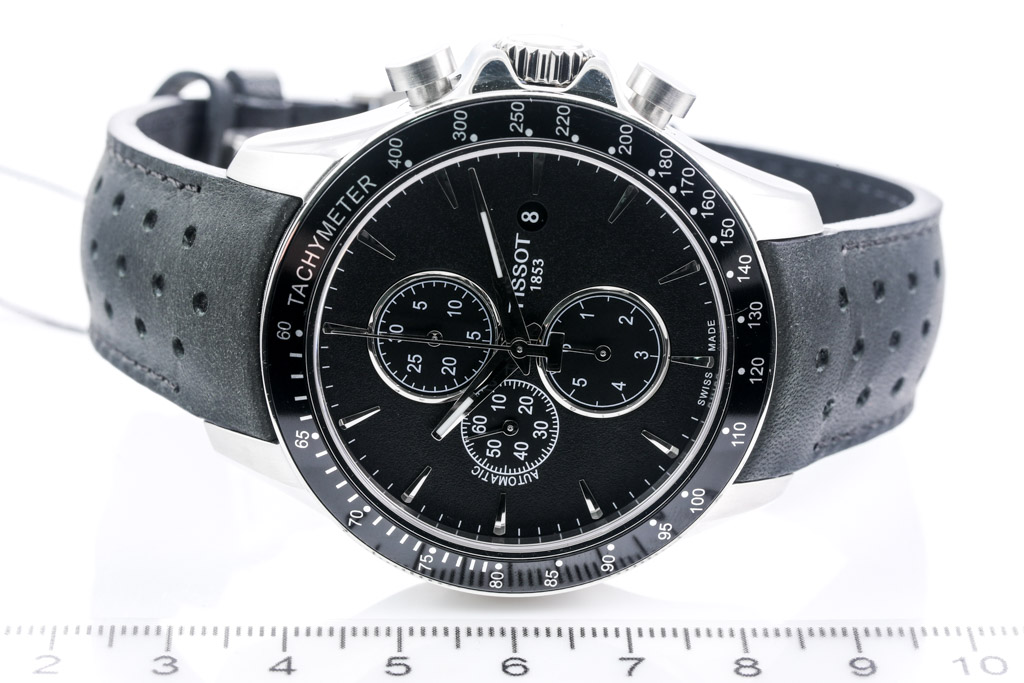 Tissot V8 stainless steel automatic mens watch. Black chronograph dial, date, case diameter: 45mm, wrist size: 20.5cm, Swiss made. Ref# T1064271605100. With Tissot black leather strap and clasp. With Tissot 2-Year International Warranty Card and Tissot box. (As New, Note: light wear on strap and minor scratches on case due to being display stock)