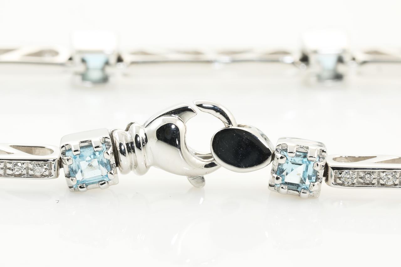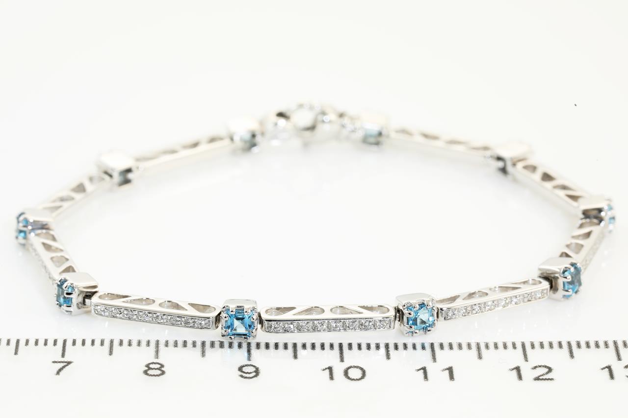 Topaz and Diamond bracelet with 10 square cut Blue Topaz stones totalling approximately 2.20cts diamonds totalling approximately 0.60cts. 18ct white gold. Length 18.5cm. Weight: 12.5g (Pre-owned)