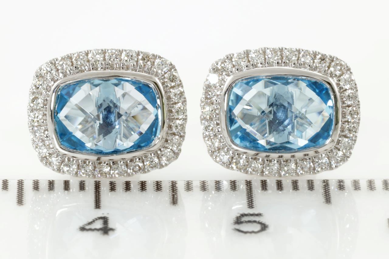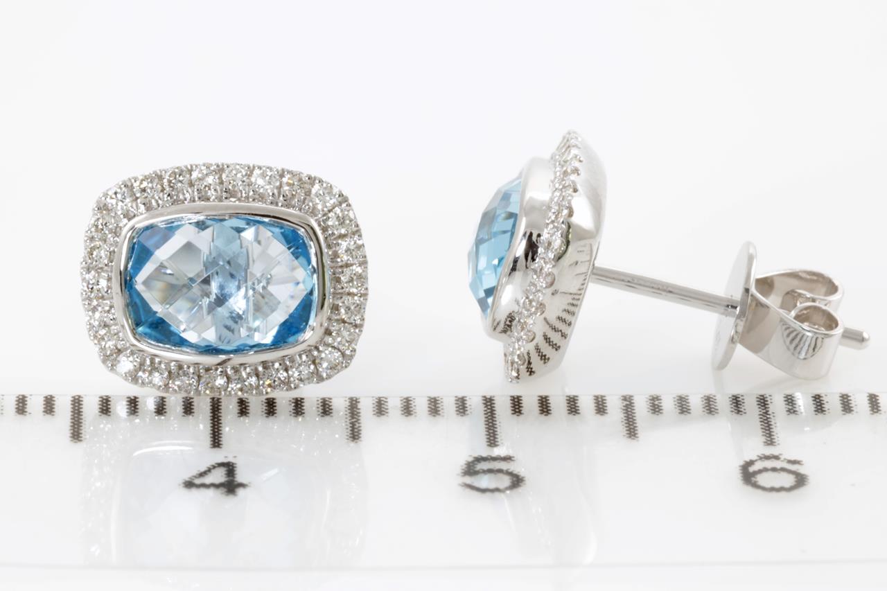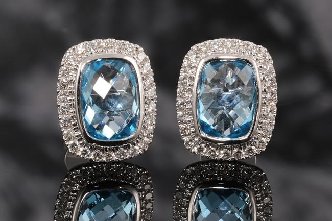 Topaz and Diamond earrings with cushion cut Topaz totalling 2.17cts and Diamonds totalling 0.24cts. 14ct white gold. Weight: 2.6g. (New)
