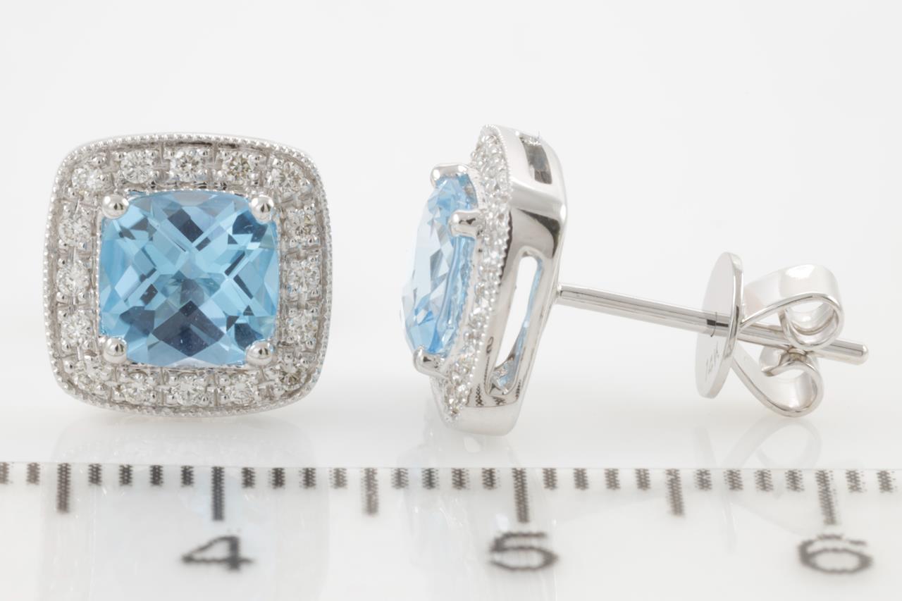Topaz and Diamond earrings with cushion cut Topaz totalling 1.95cts and Diamonds totalling 0.19cts. 14ct white gold. Weight: 2.6g. (New)