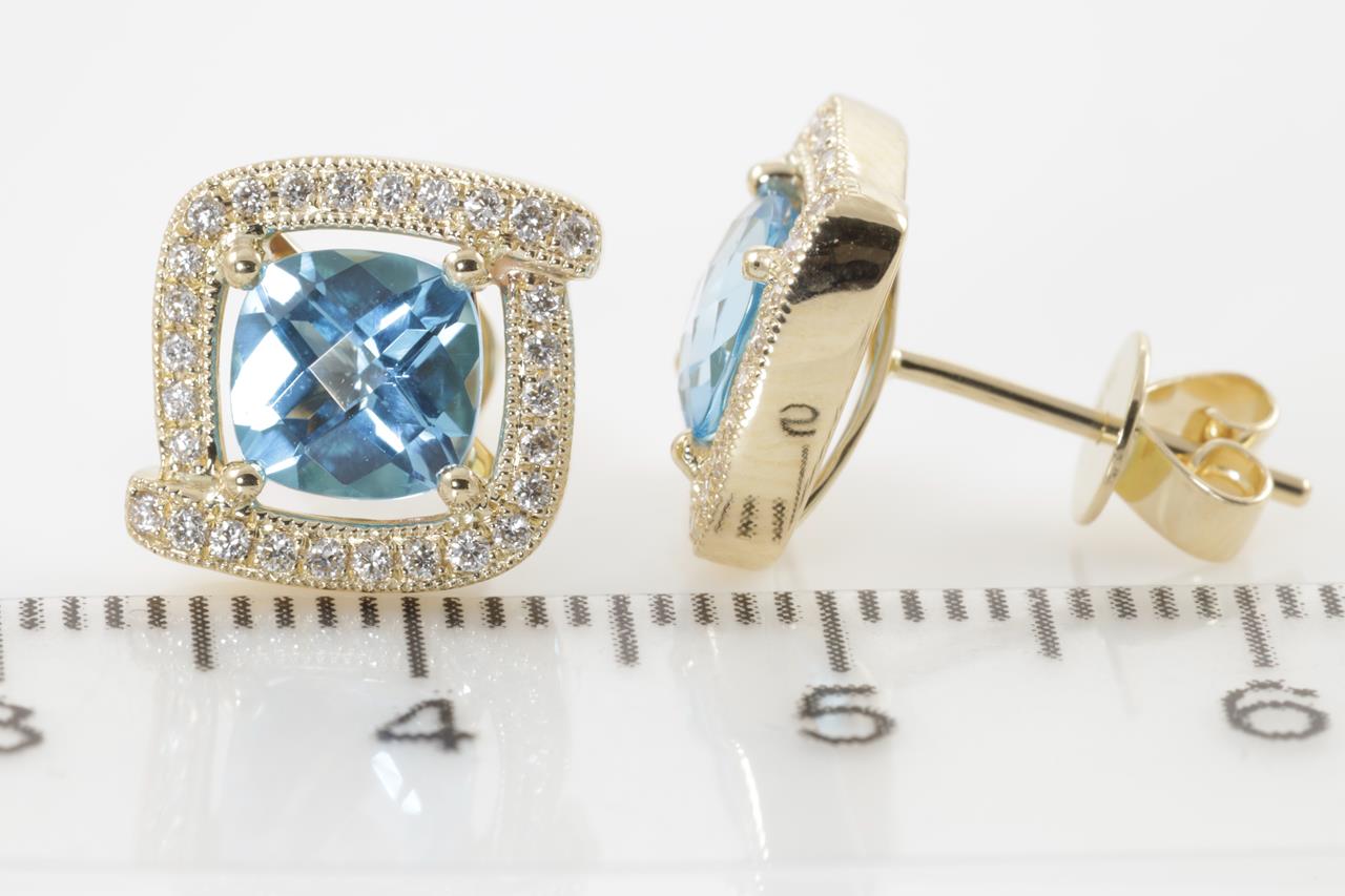 Topaz and Diamond earrings with cushion cut Topaz totalling 2.06cts and Diamonds totalling 0.21cts. 14ct yellow gold. Weight: 3.4g. (New)