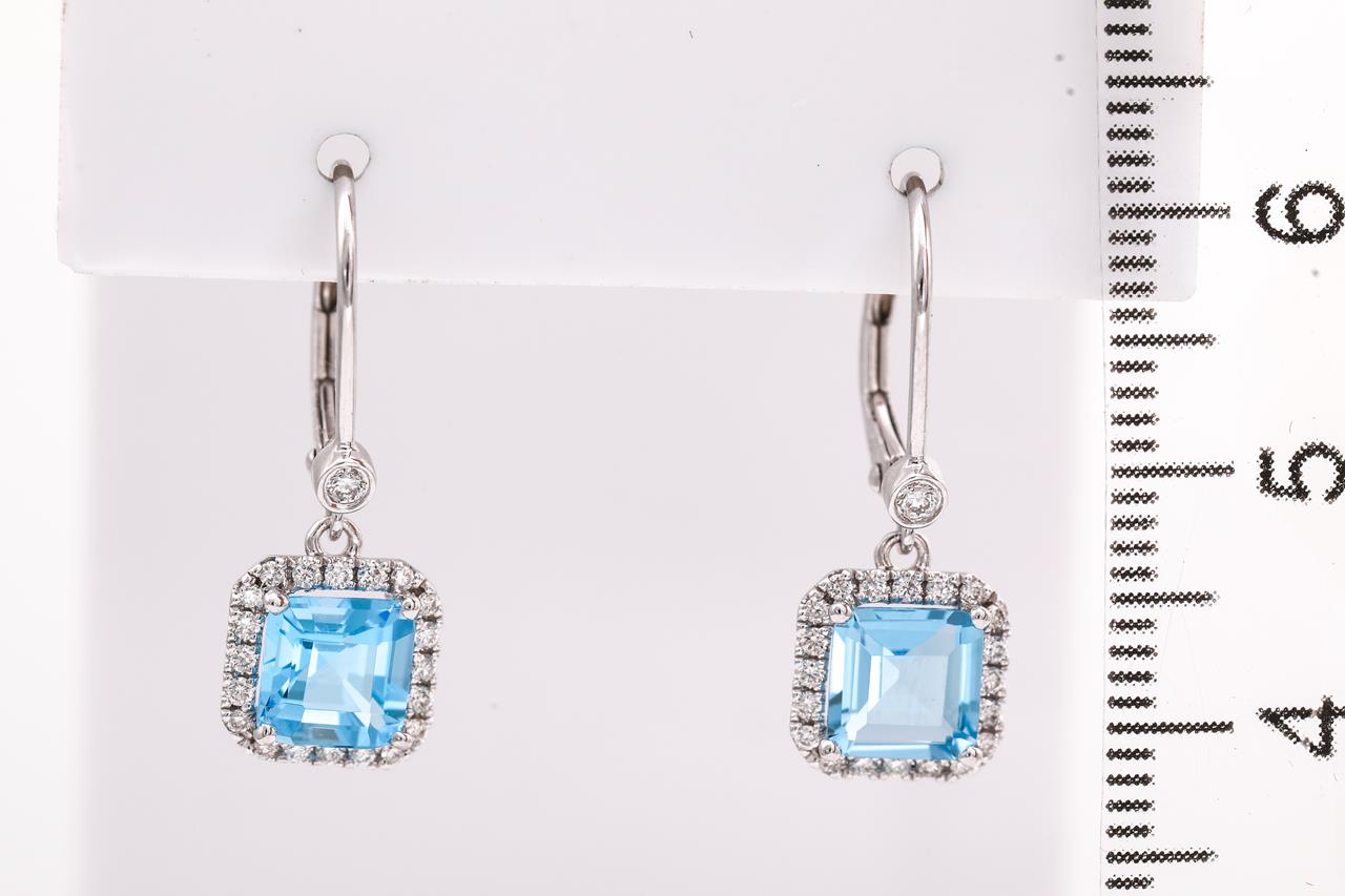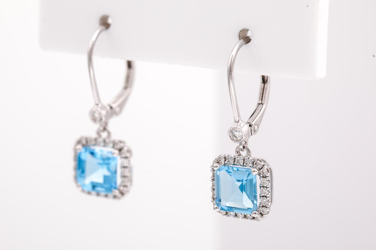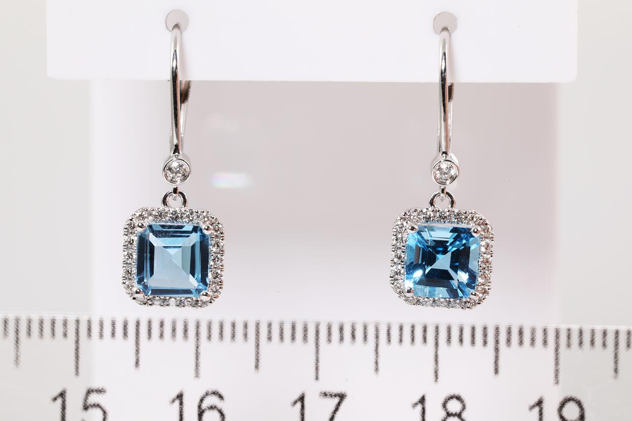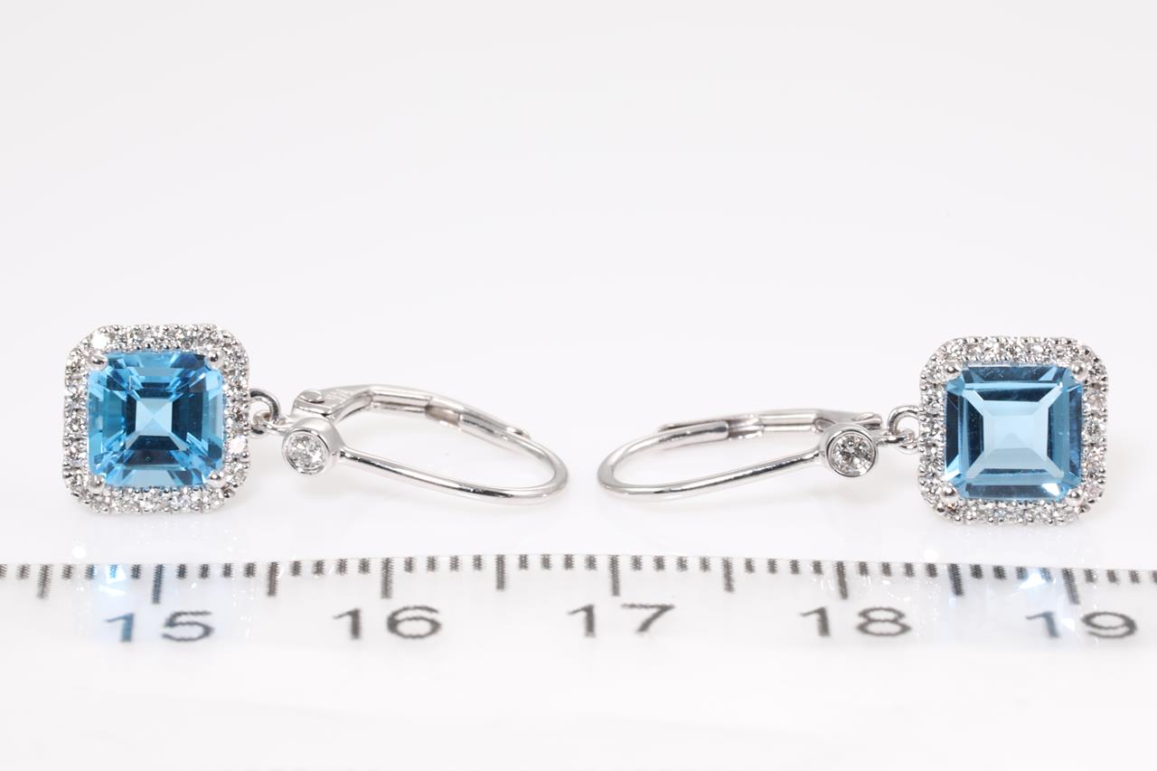 Topaz and Diamond leverback earrings with emerald cut Topaz totalling 2.16cts and Diamonds totalling 0.25cts. 14ct white gold. Weight: 2.3g. (New)