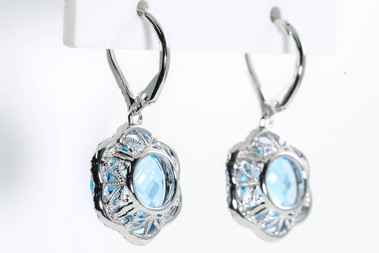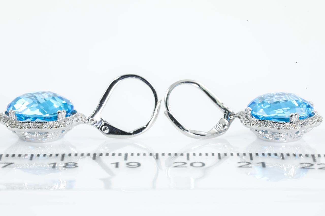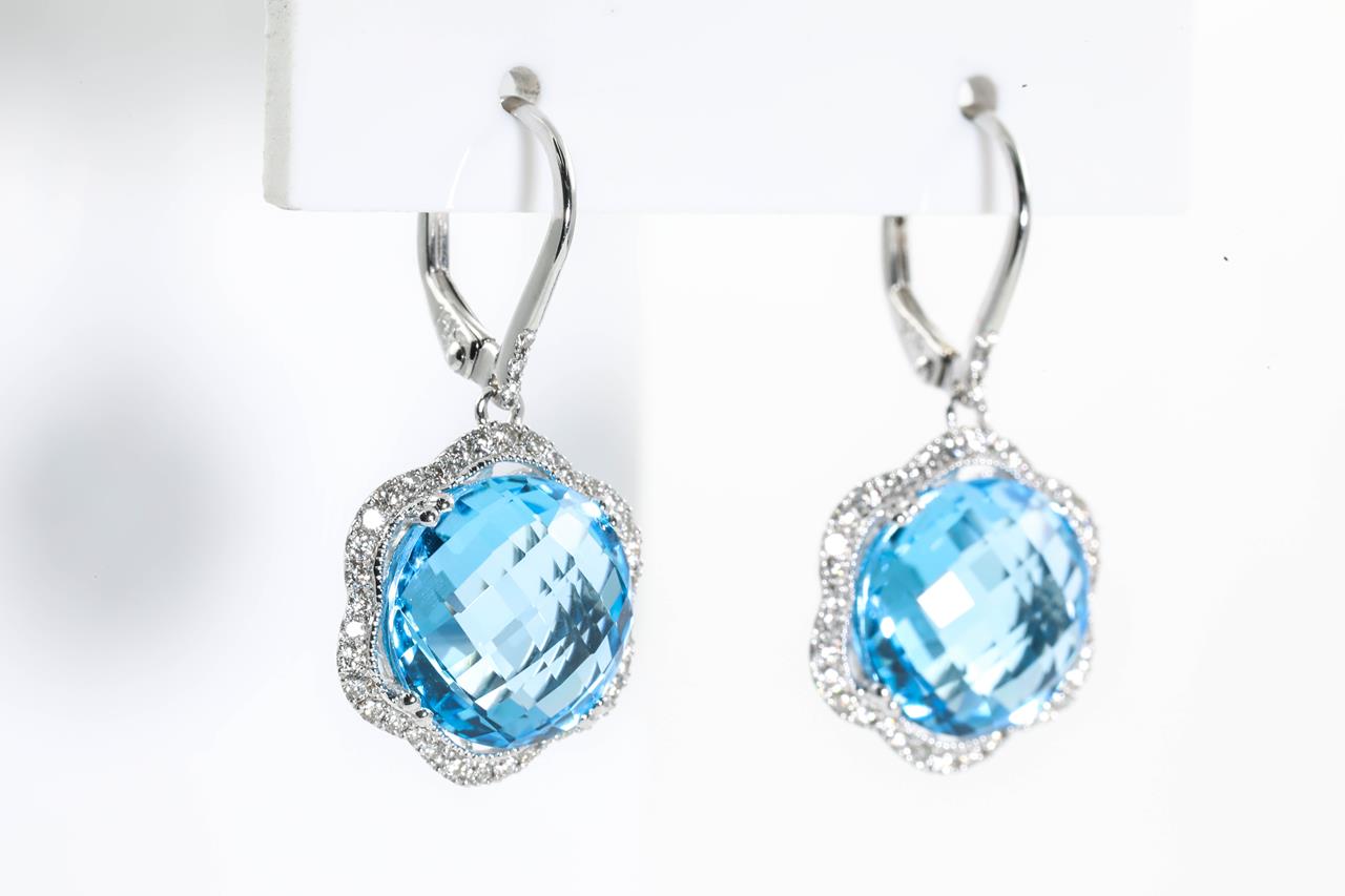 Topaz and Diamond leverback earrings with round checkerboard cut blue Topaz totalling 10.85cts and Diamonds totalling 0.39cts (Estimated grading: H SI). 14ct white gold. Weight: 5.3g. (New)