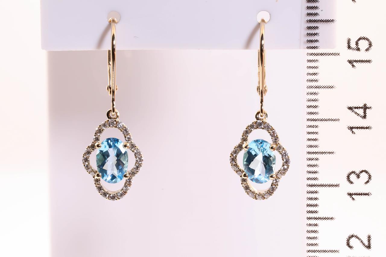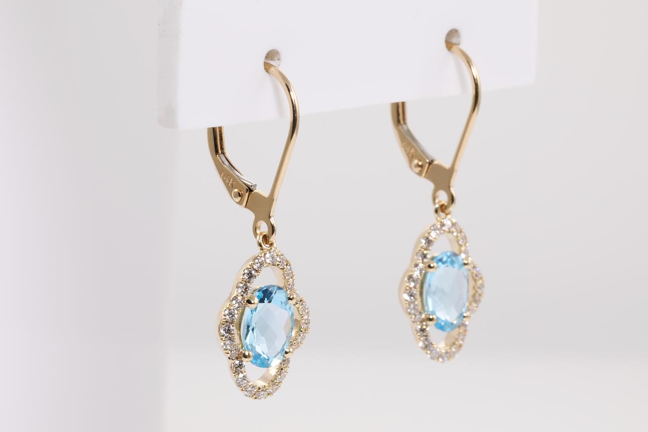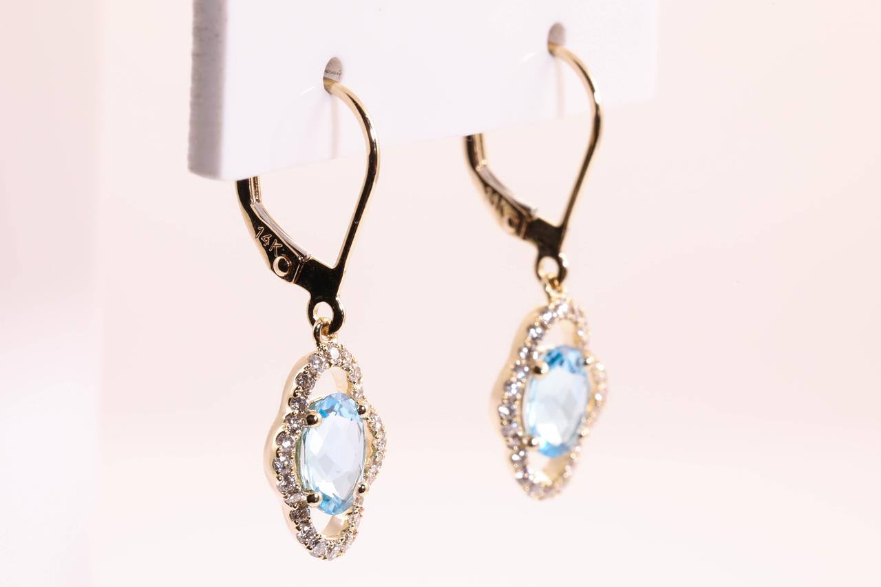 Topaz and Diamond leverback earrings with oval shape Topaz totalling 1.63cts and Diamonds totalling 0.31cts (Estimated grading: H SI). 14ct yellow gold. Weight: 2.2g. (New)
