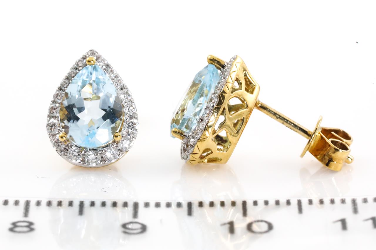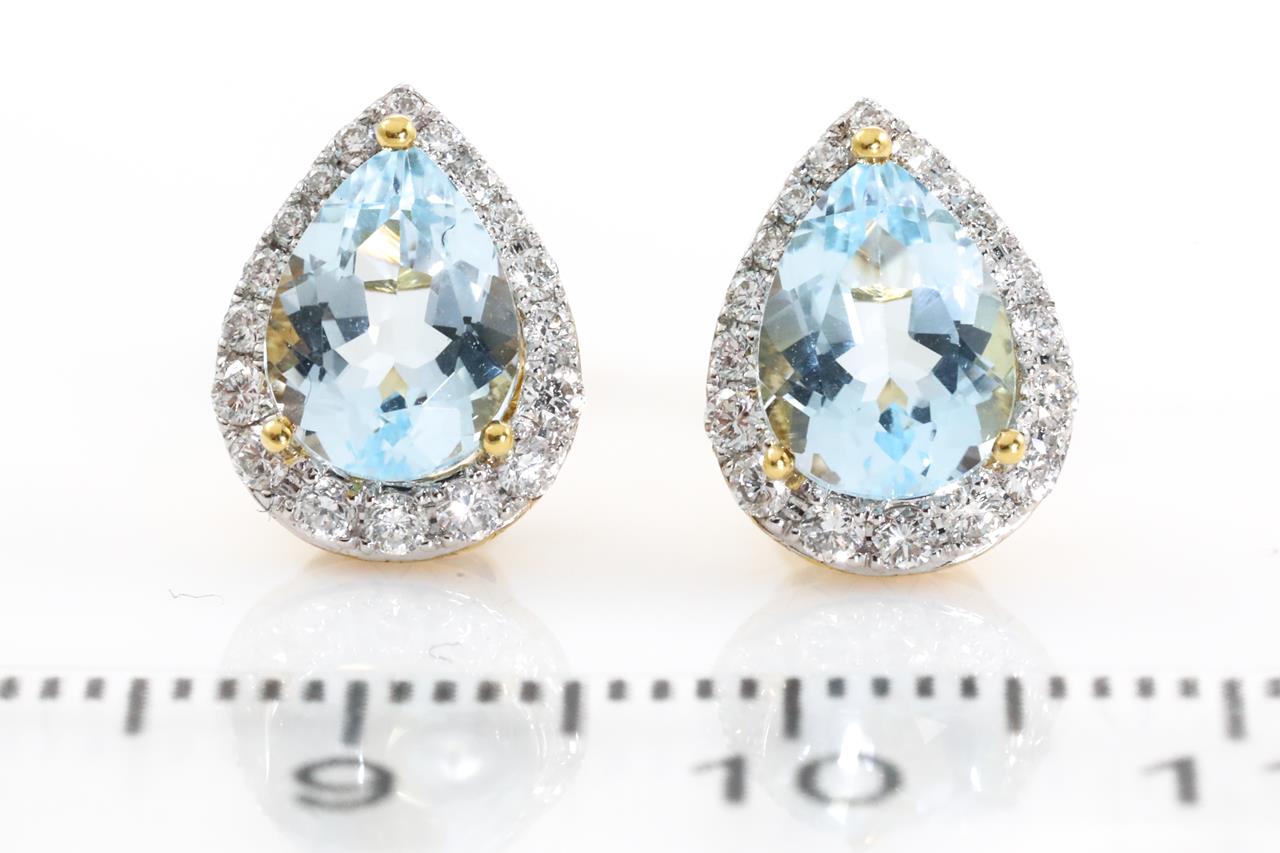 Topaz Earrings with pear shaped blue Topaz totalling 3.00cts and round Diamonds totalling approximately 0.55cts (Estimated grading: G SI). 18ct yellow gold. Weight 3.3g. (Pre-owned)