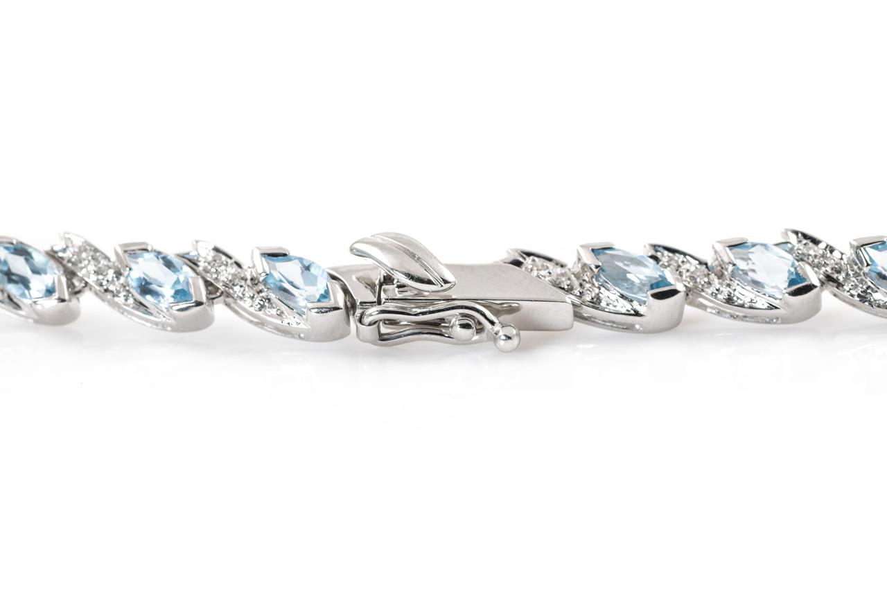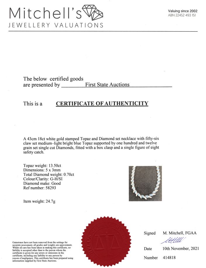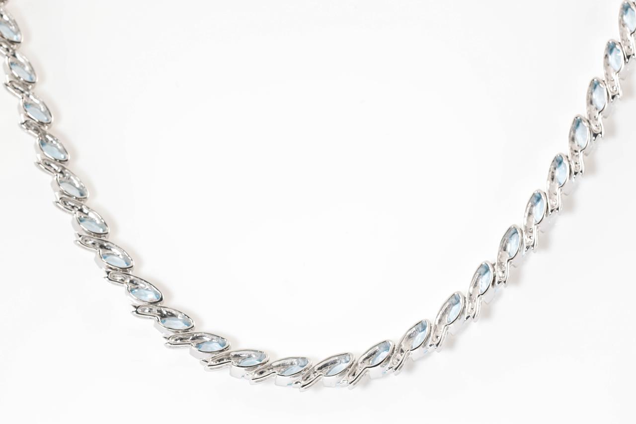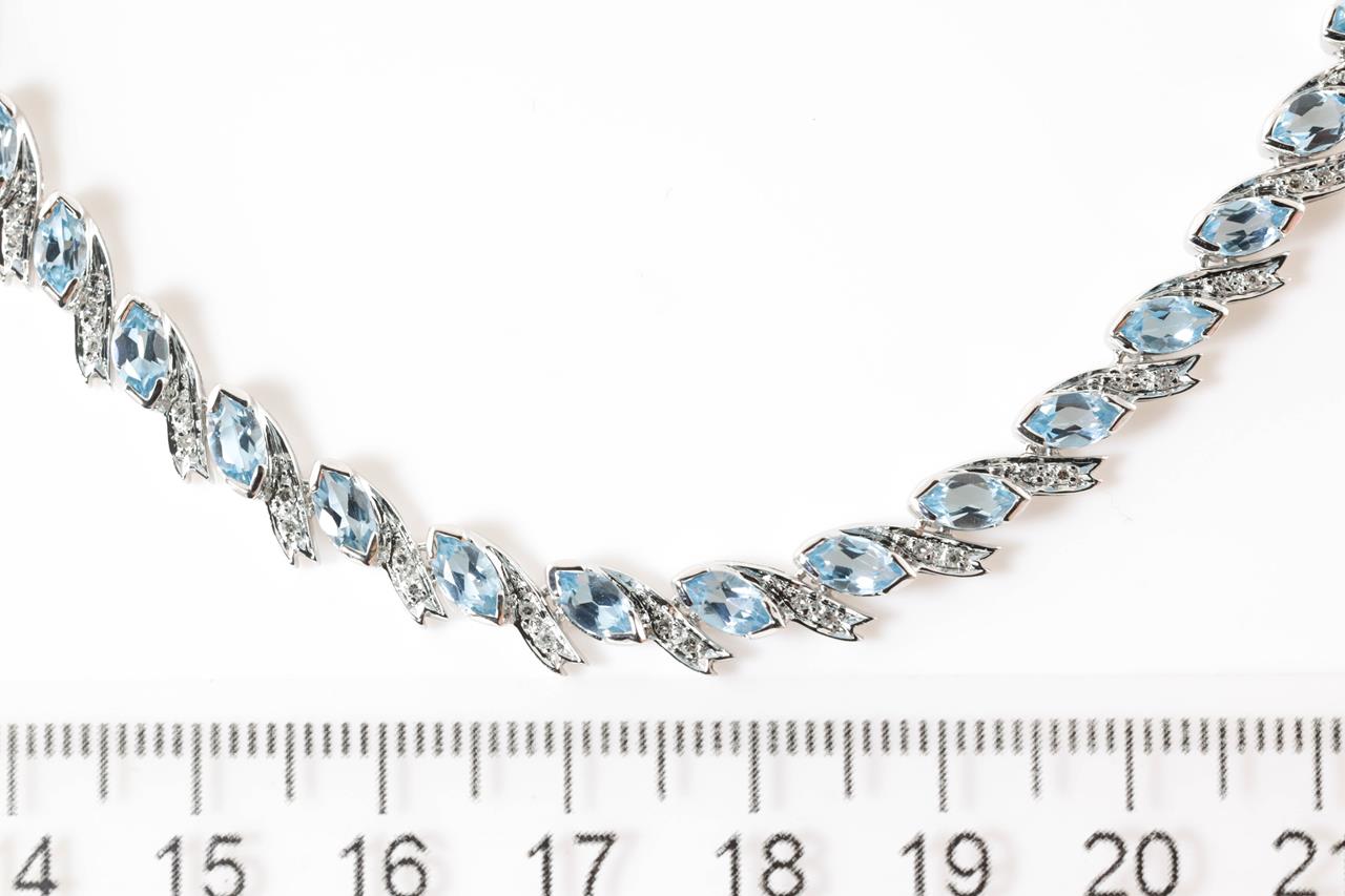 Topaz and Diamond necklace with marquise cut Topaz totalling 13.50cts and Diamonds totalling 0.70cts (Estimated grading: G-H SI). 18ct white gold. Length: 43cm. Weight: 24.7g. With certificate #414818. (Pre-owned)