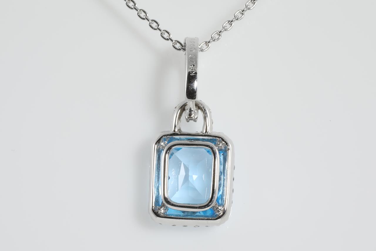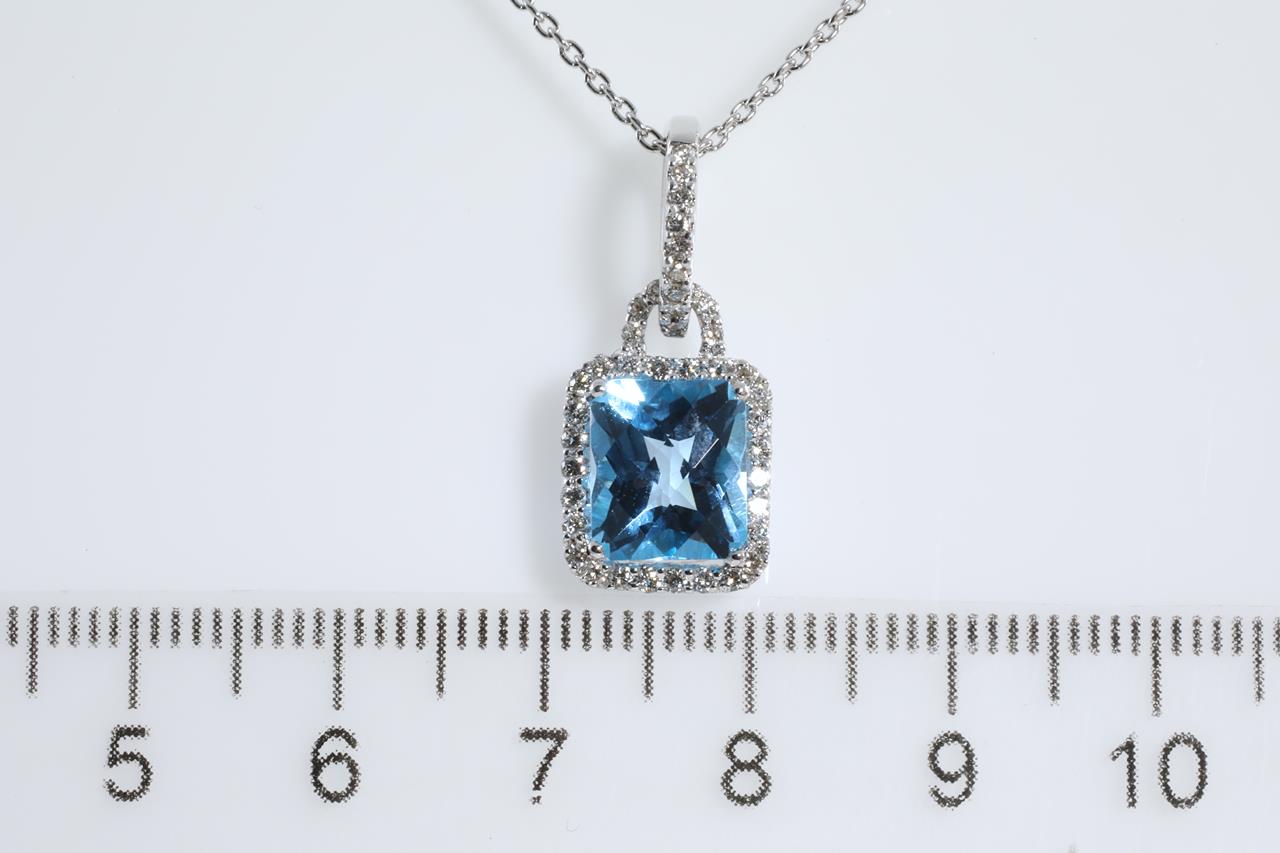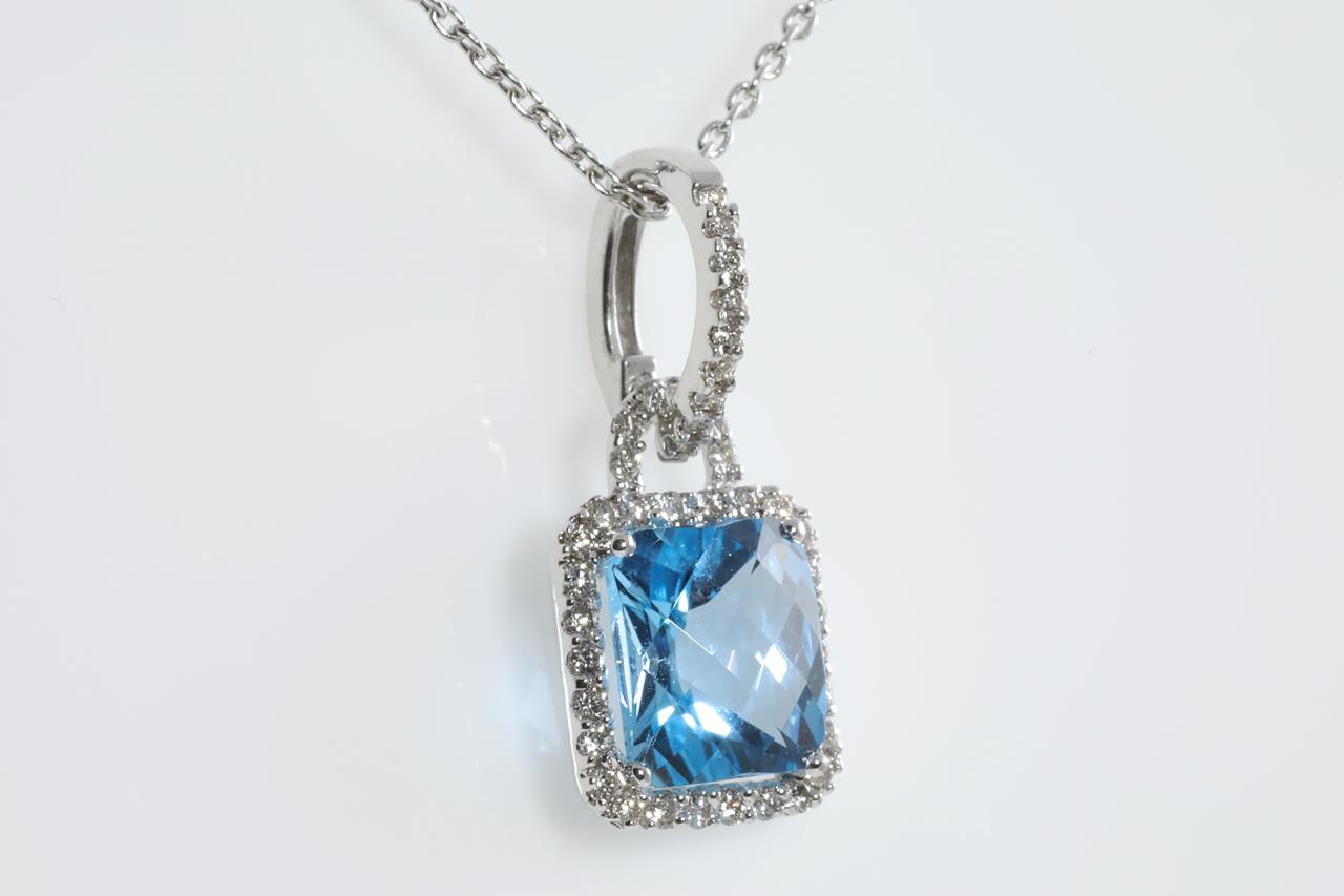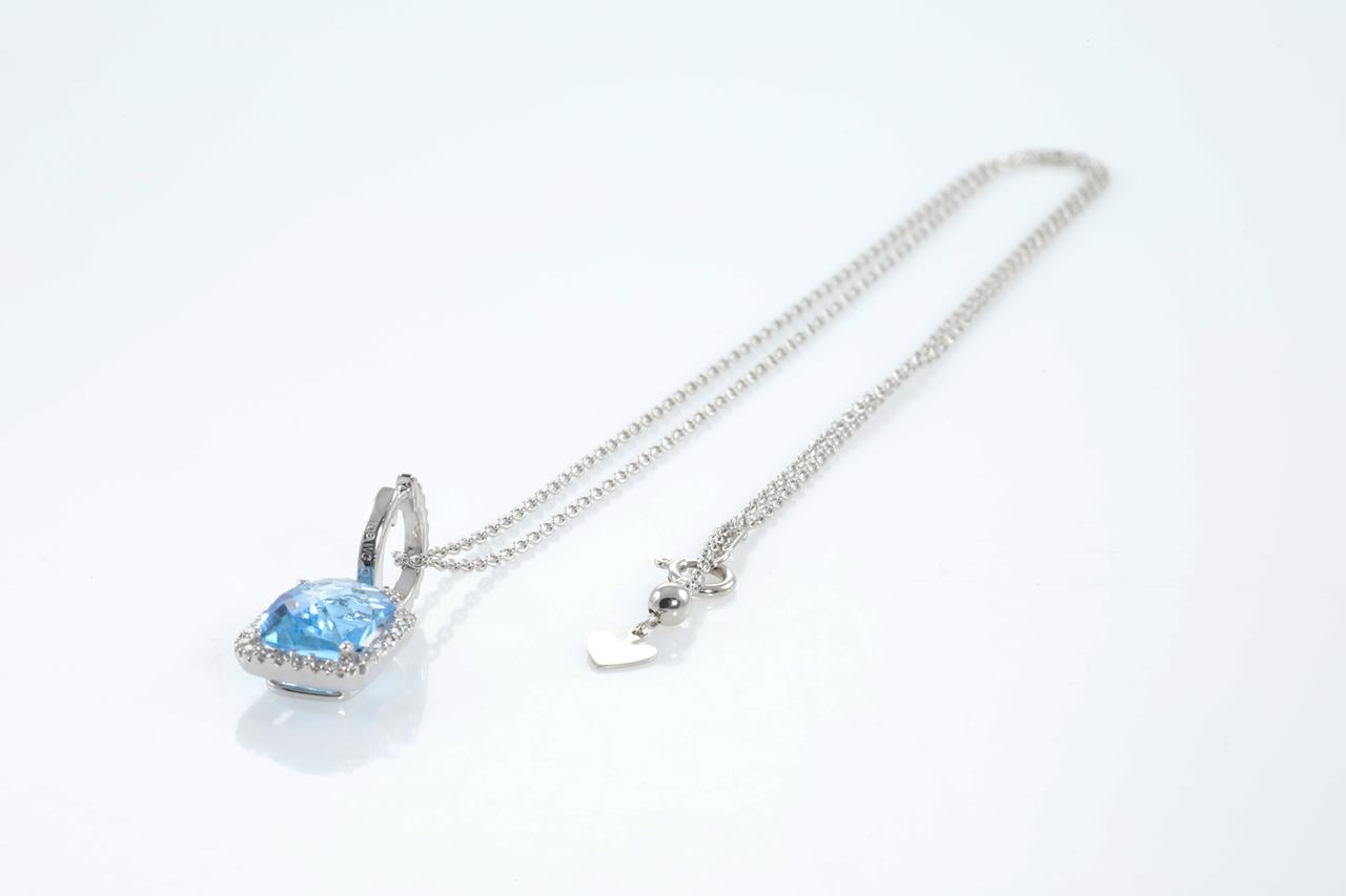 Topaz and Diamond pendant with cushion checkerboard cut Topaz of approximately 3.30ct and round Diamonds totalling 0.65cts (estimated grading: I SI). 18ct white gold with 18ct 45cm adjustable chain. Weight: 5.1g (pre-owned)
