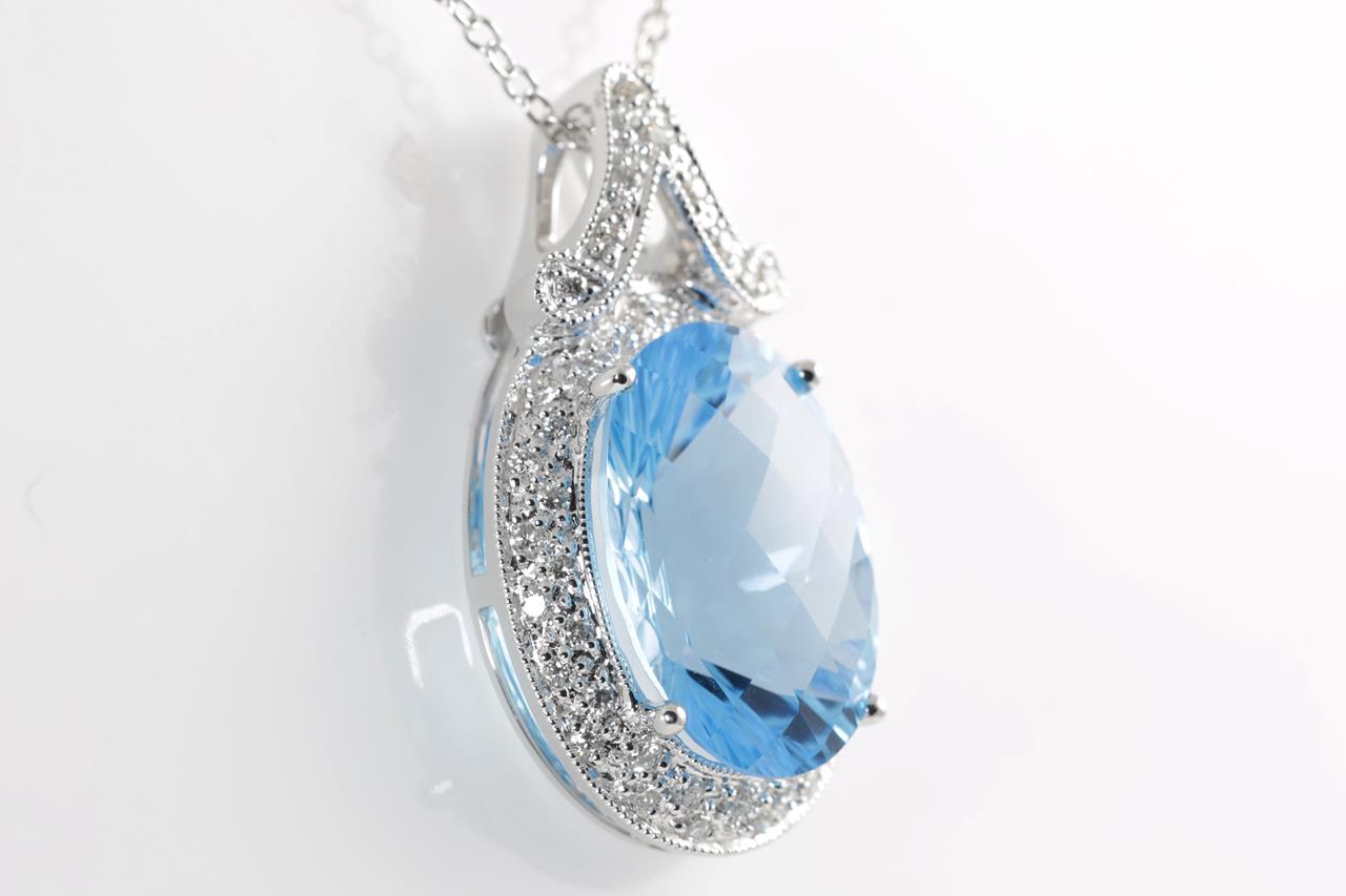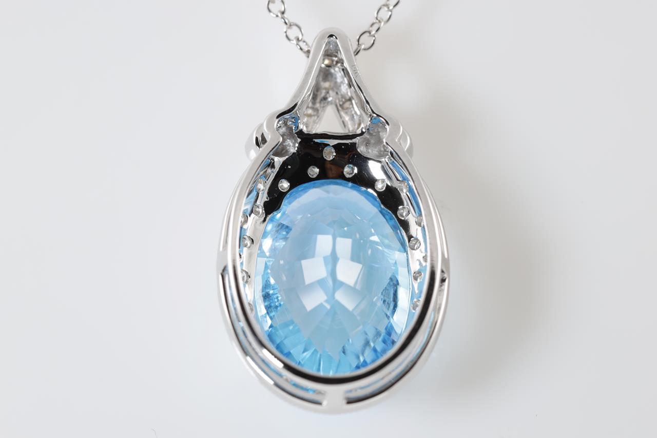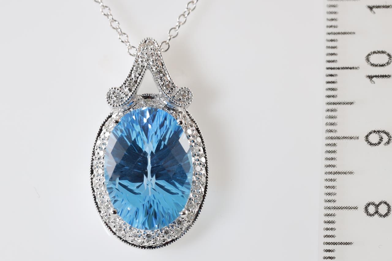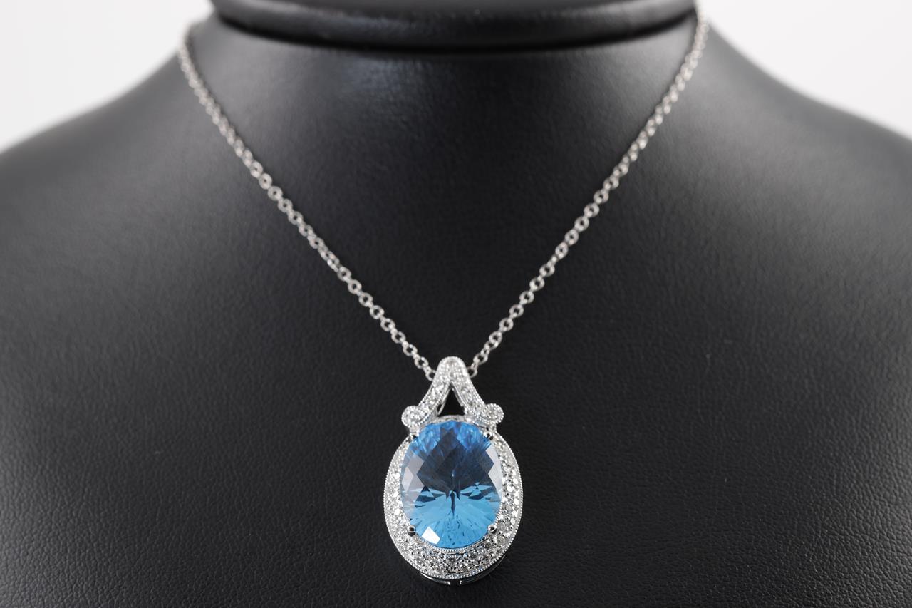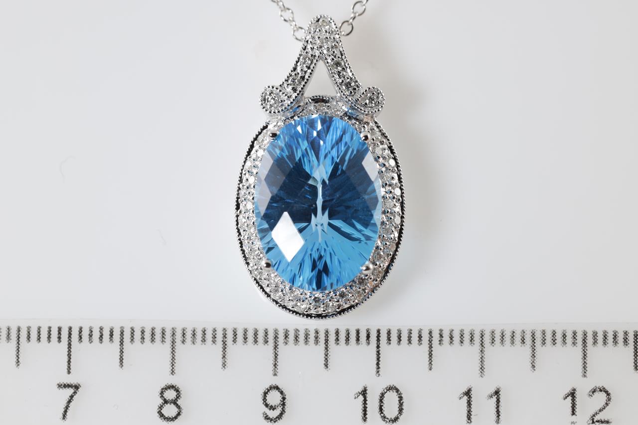 Topaz and Diamond pendant with an oval Topaz of 11.35ct and Diamonds totalling 0.35cts (Estimated grading: H SI). 14ct white gold with 14ct gold 44cm chain. Weight: 7.3g. (New)