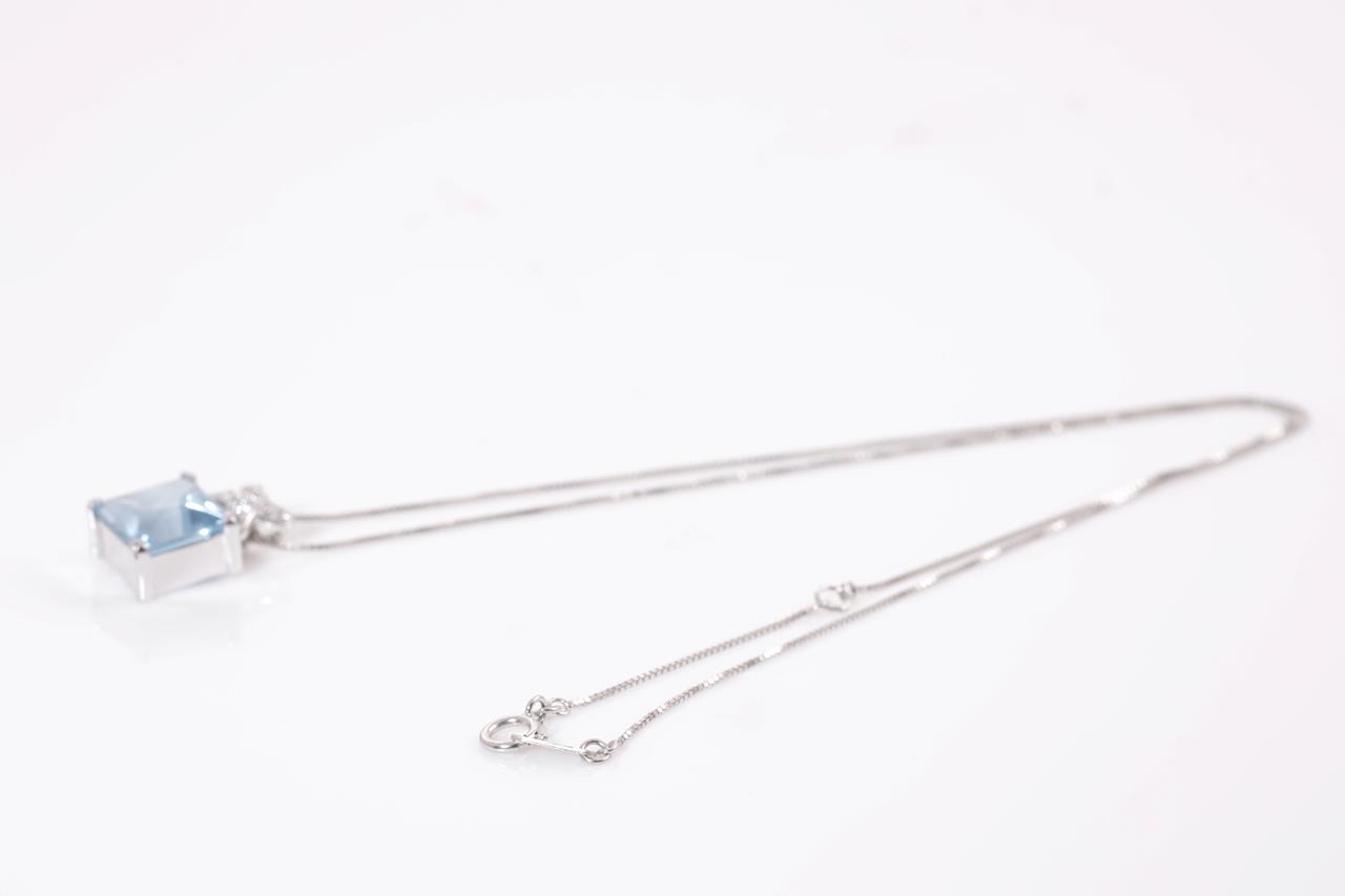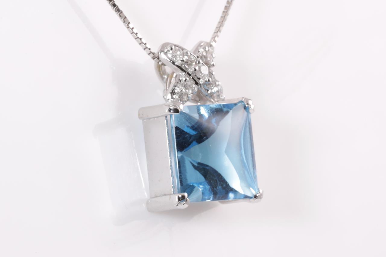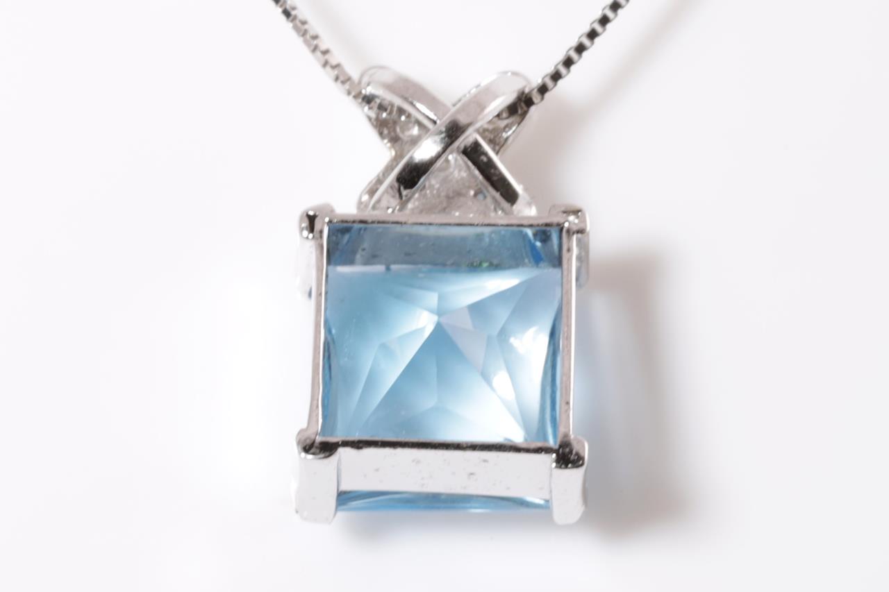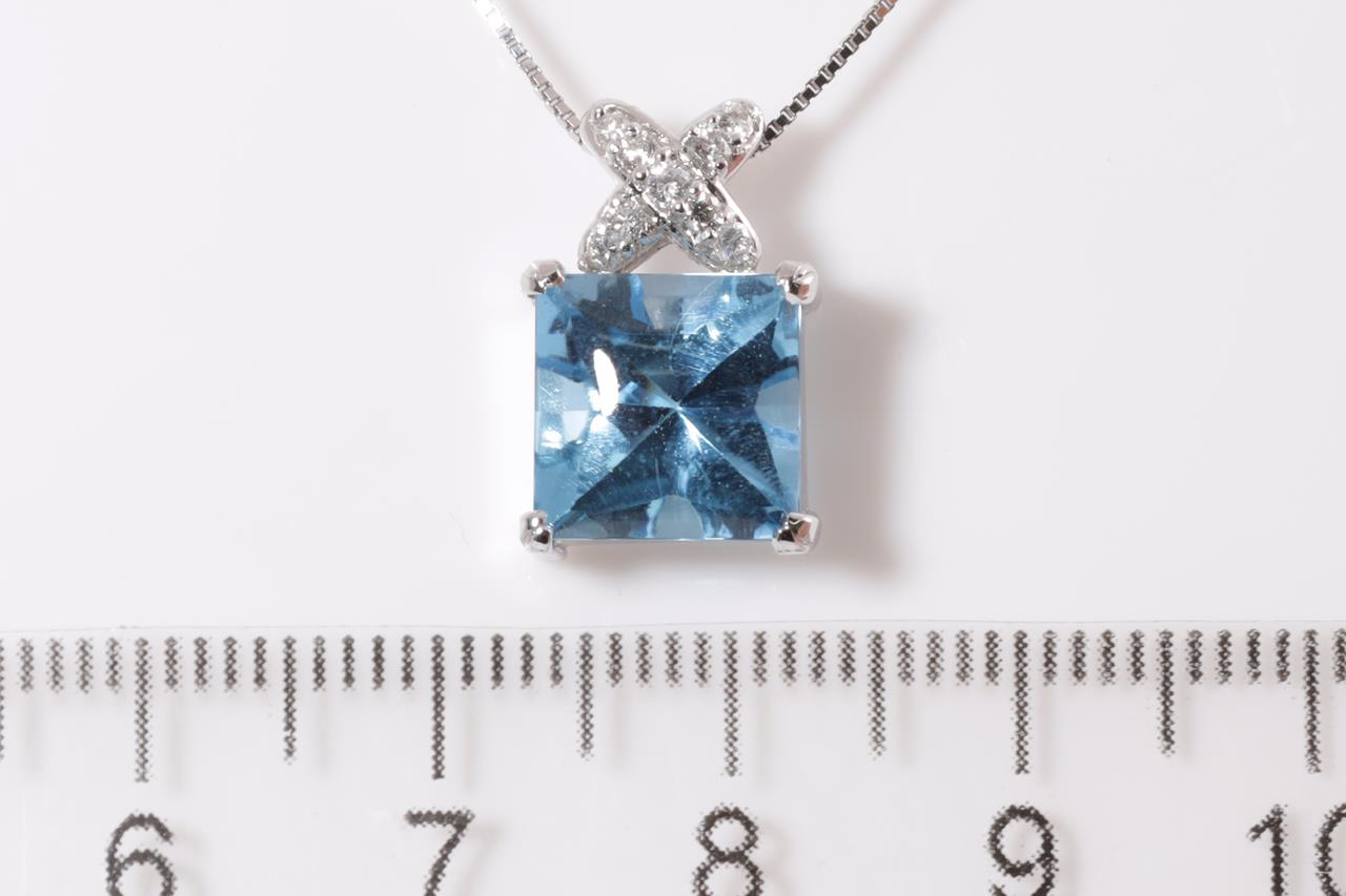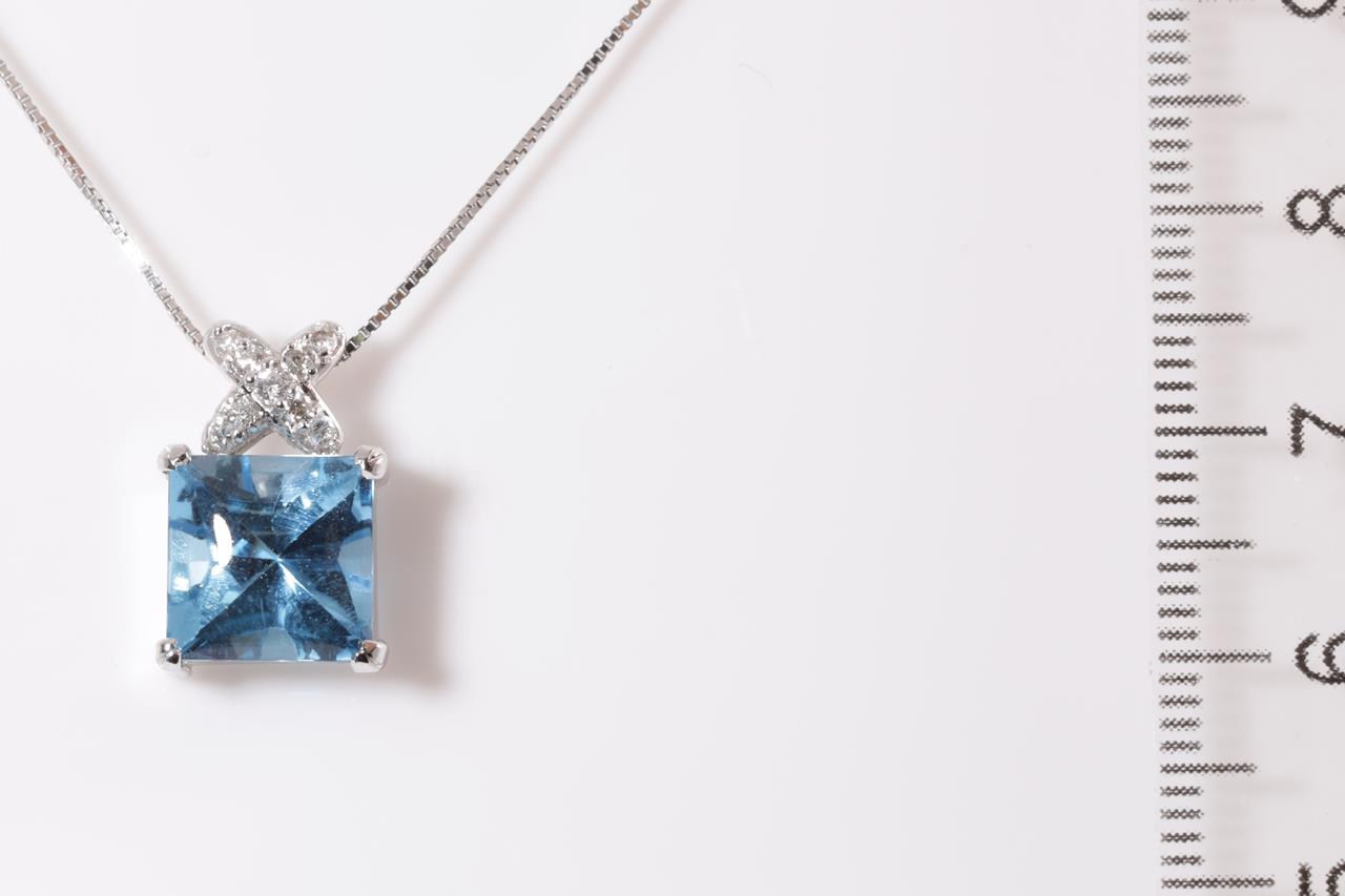 Topaz and Diamond pendant with square shape Topaz of 3.70ct and Diamonds totalling 0.14cts. 18ct white gold with 40cm chain. Weight: 4g (Pre-owned)