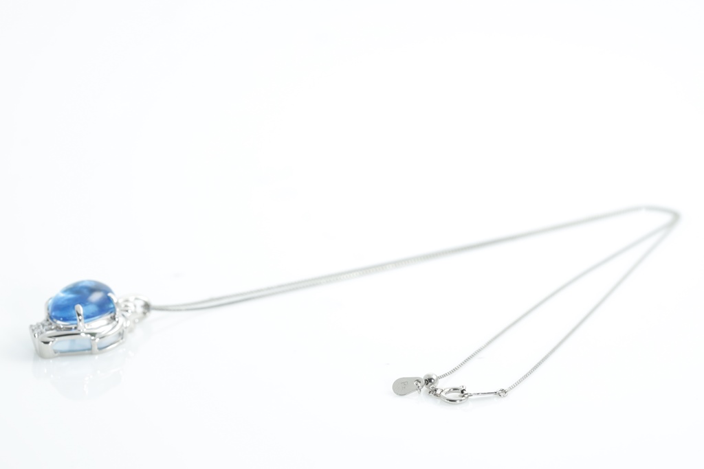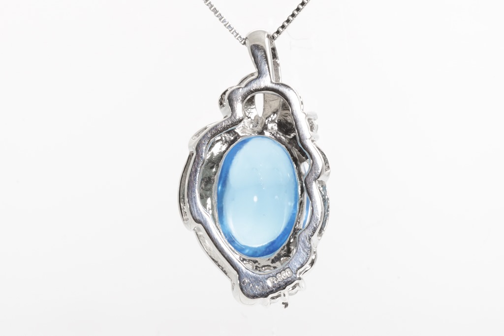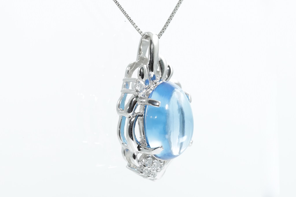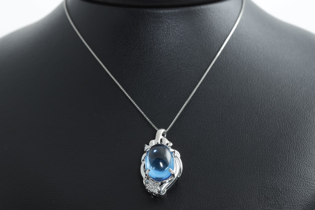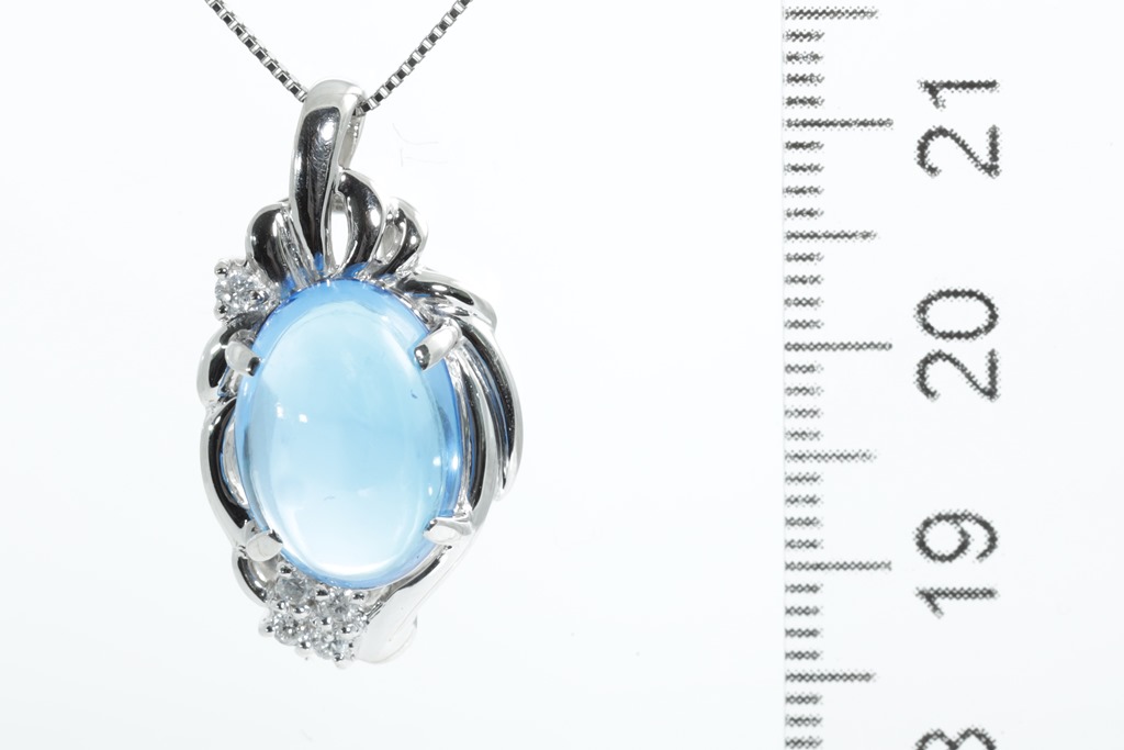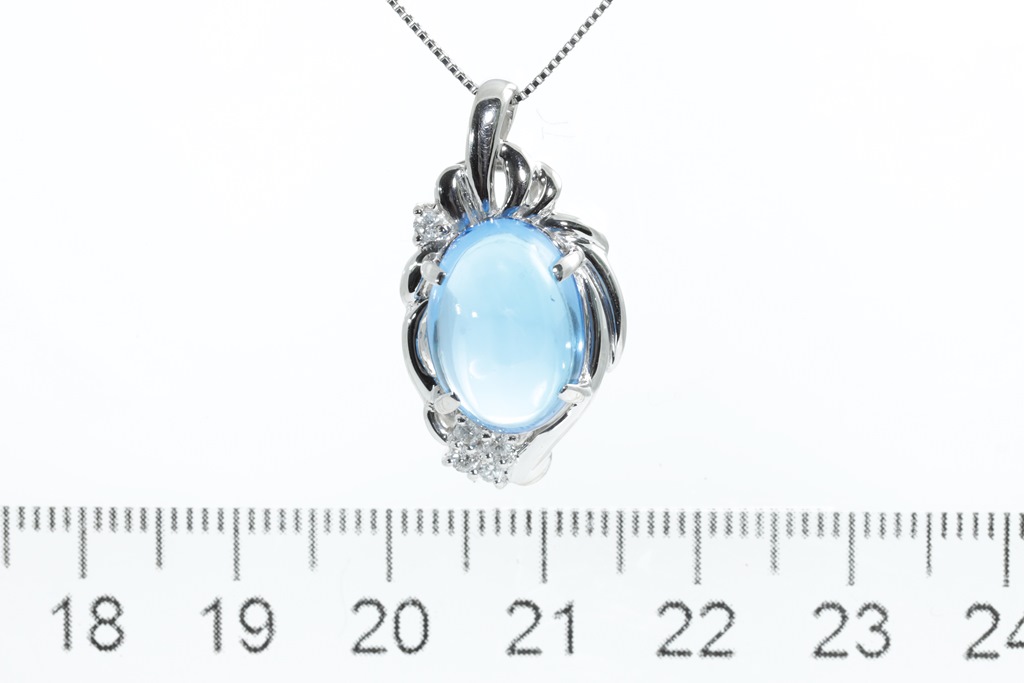 Topaz and Diamond pendant with an oval cabochon cut Topaz of approximately 8.70ct and round Diamonds totalling 0.11cts. Platinum with adjustable 44cm chain. Weight: 9g. (Pre-owned)
