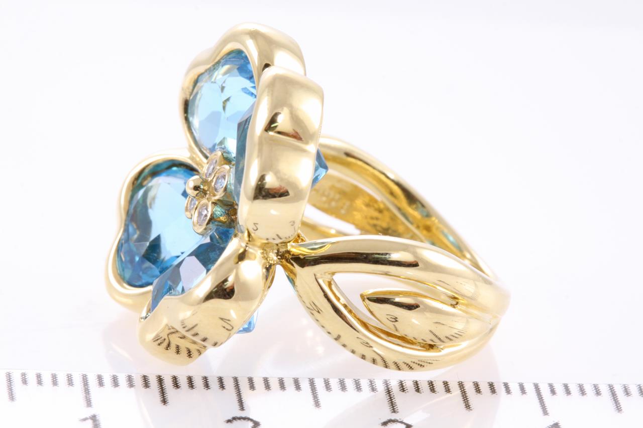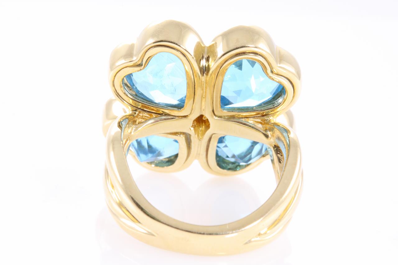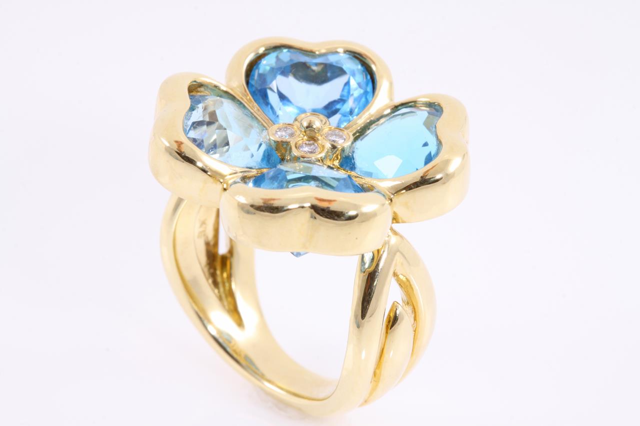 Topaz and Diamond ring with 4 Heart shaped Blue Topaz and Diamonds. 18ct yellow gold. Ring size L - Ring resizing is not recommended. Weight: 18.4g (Pre-owned)