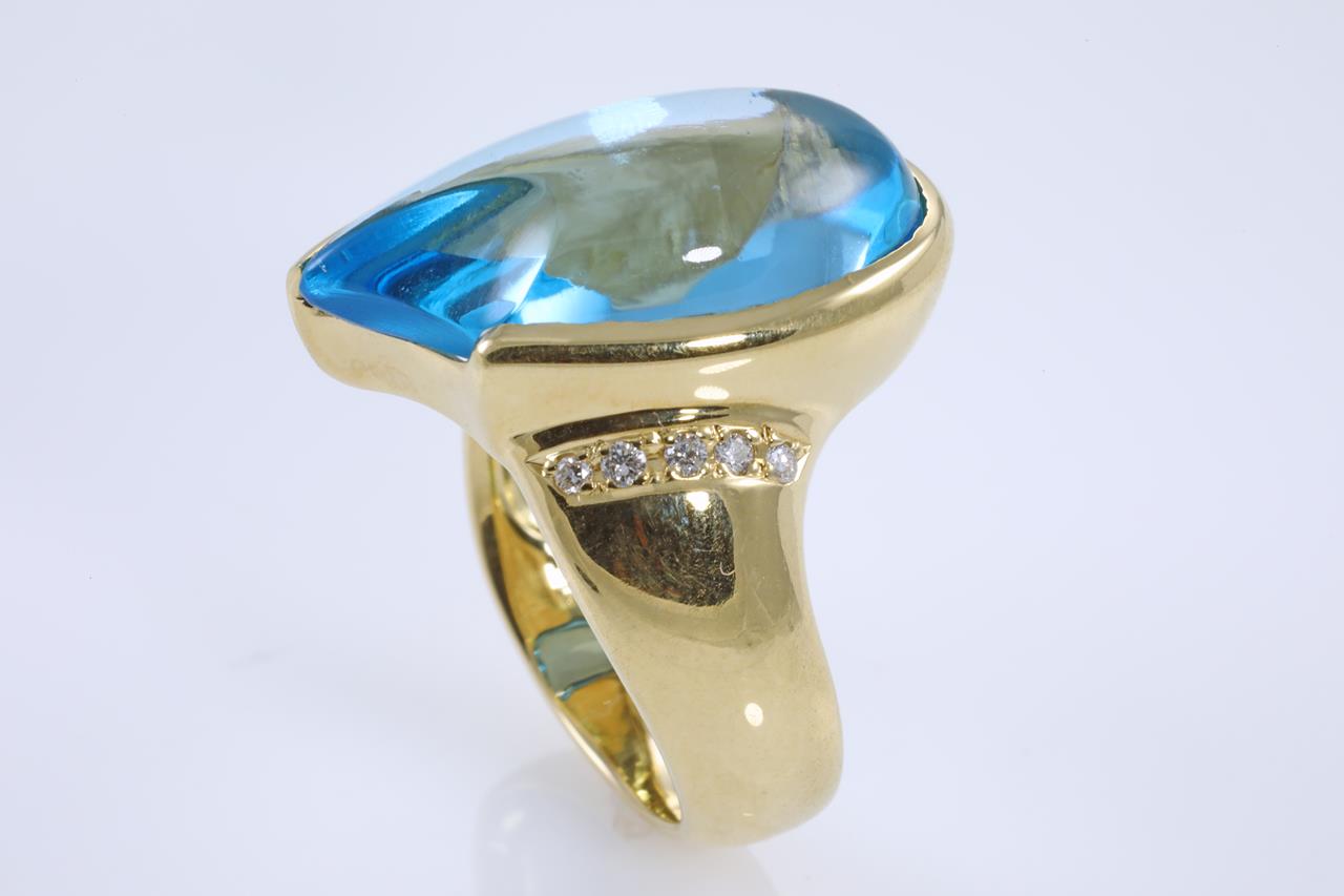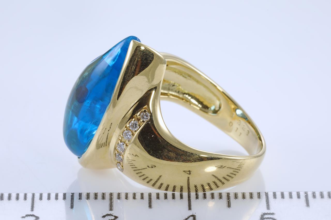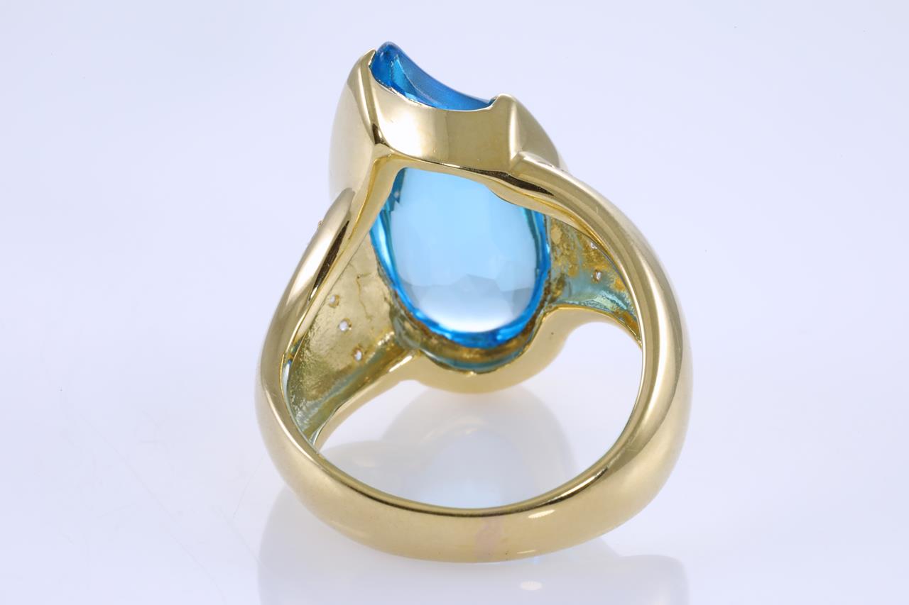 Topaz and Diamond ring with fancy shape shape blue Topaz of 13.23ct and Diamonds totalling 0.11cts. 18ct yellow gold. Ring size M. Weight: 12g (Pre-owned)