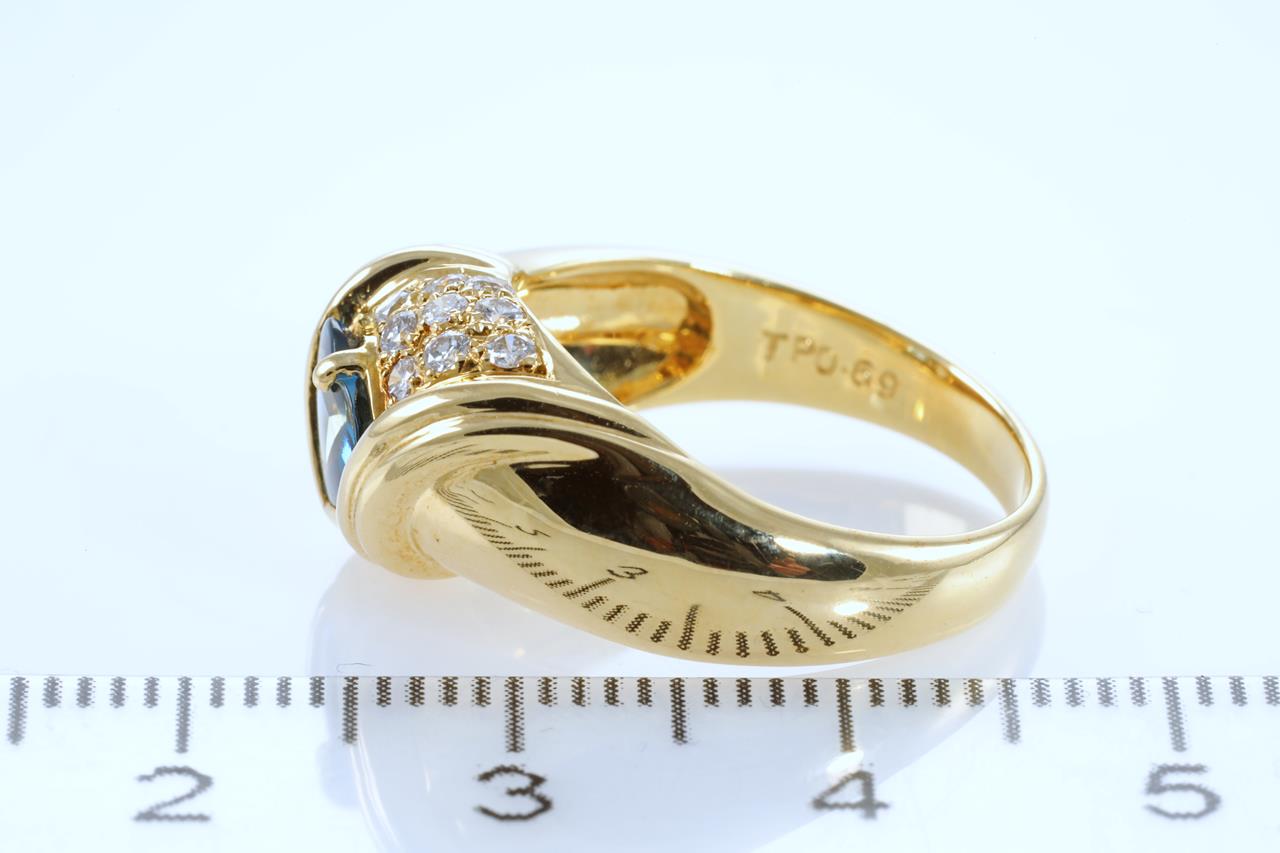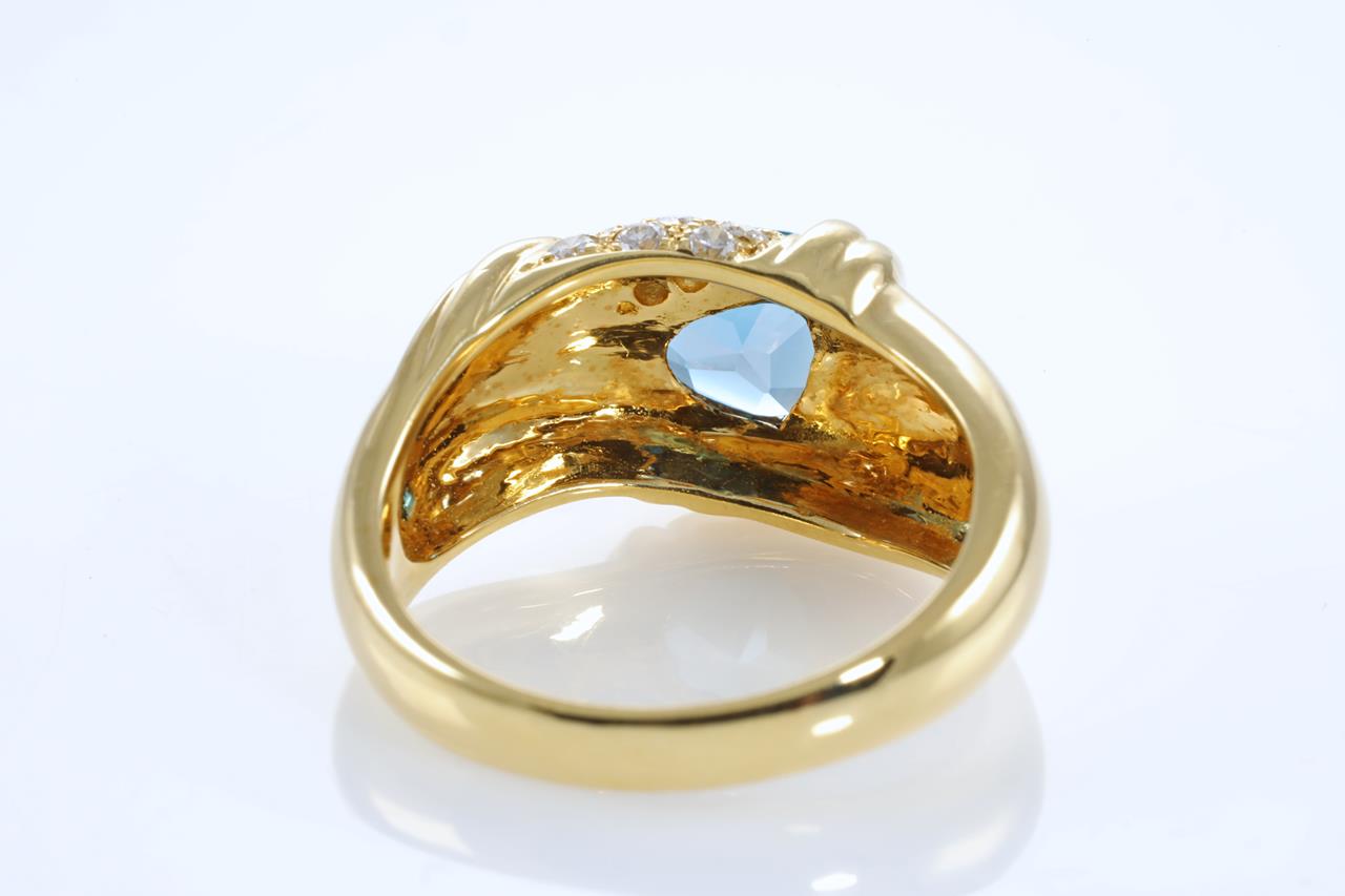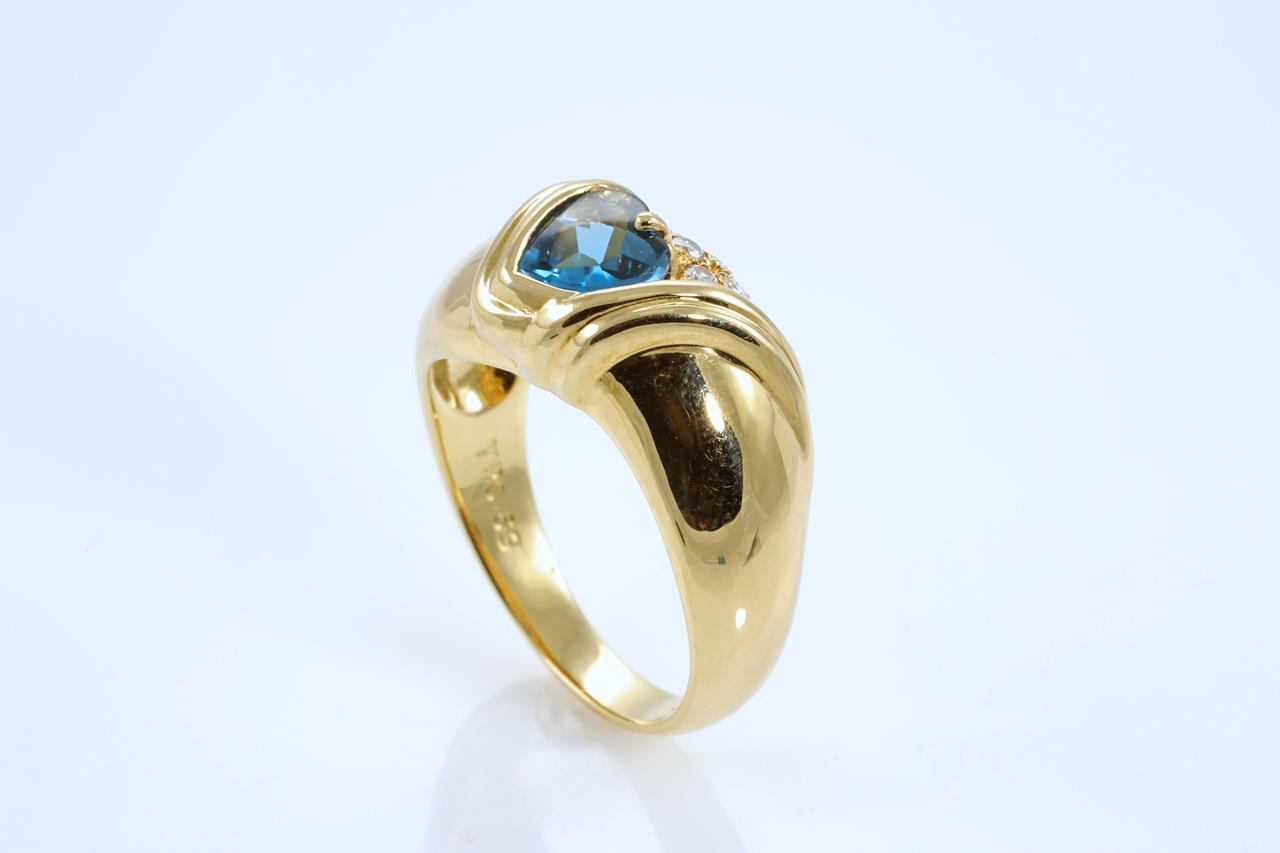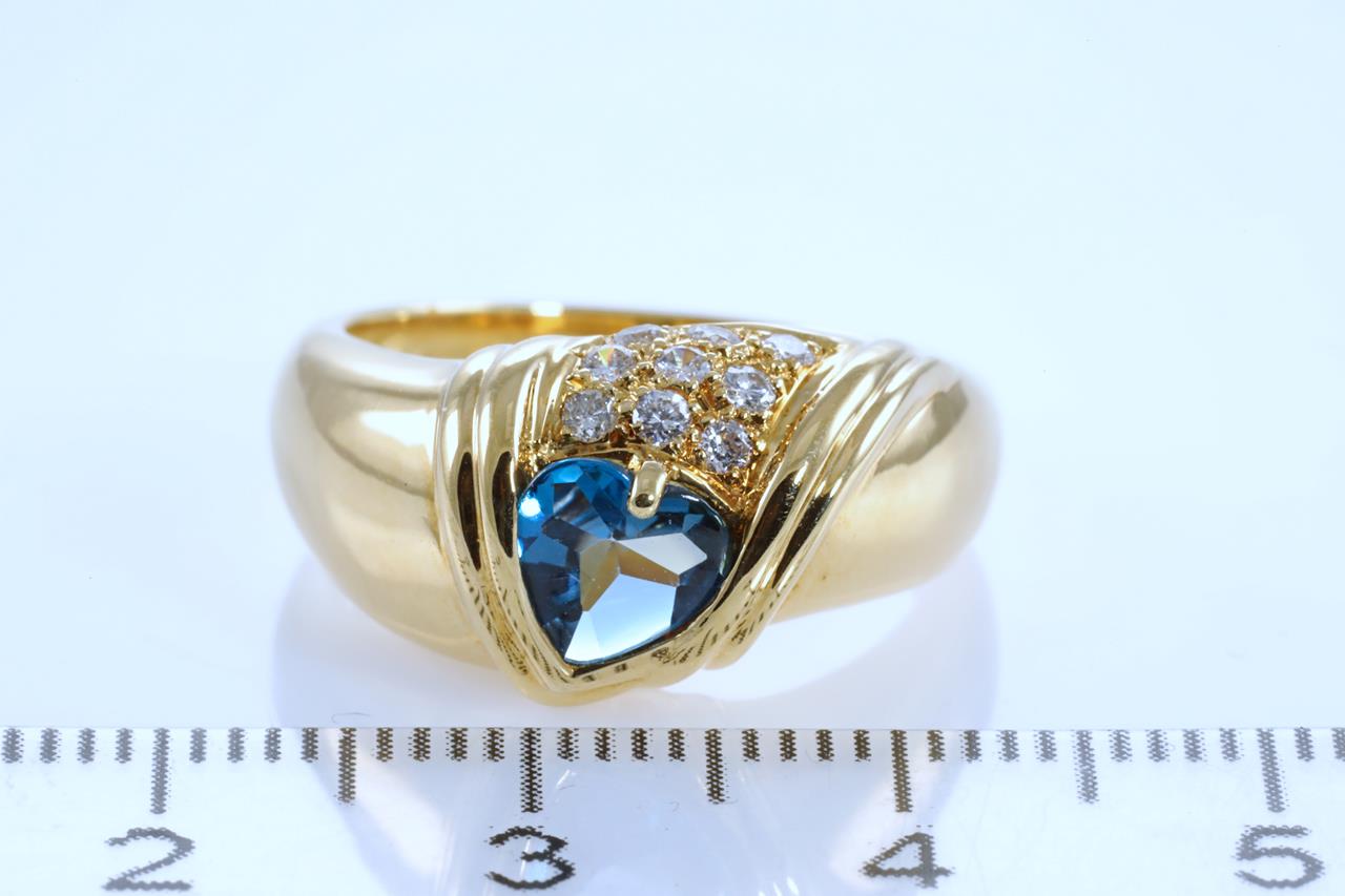 Topaz and Diamond ring with a heart shape blue Topaz of 0.69cts and shoulder Diamonds totalling 0.17cts. 18ct yellow gold. Ring size M. Weight: 6.8g. (Pre-owned)
