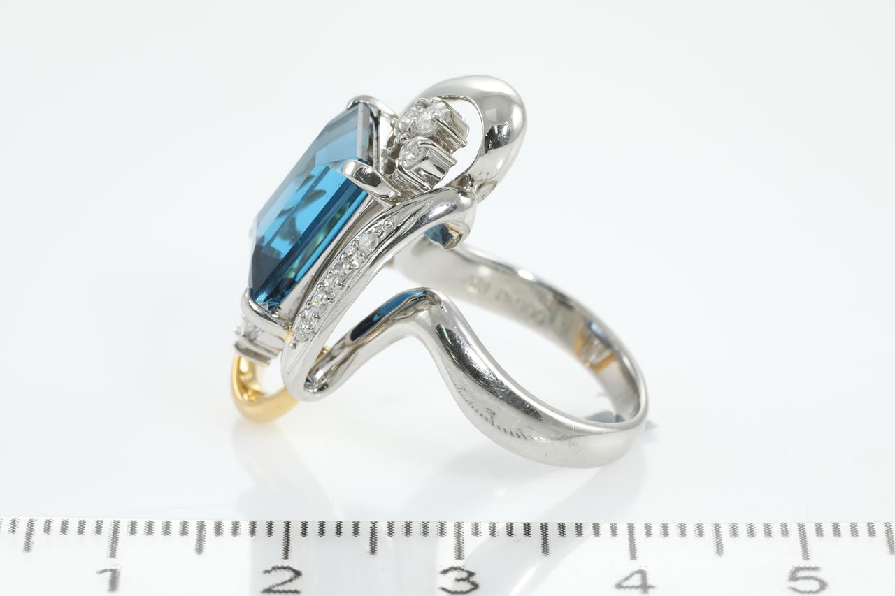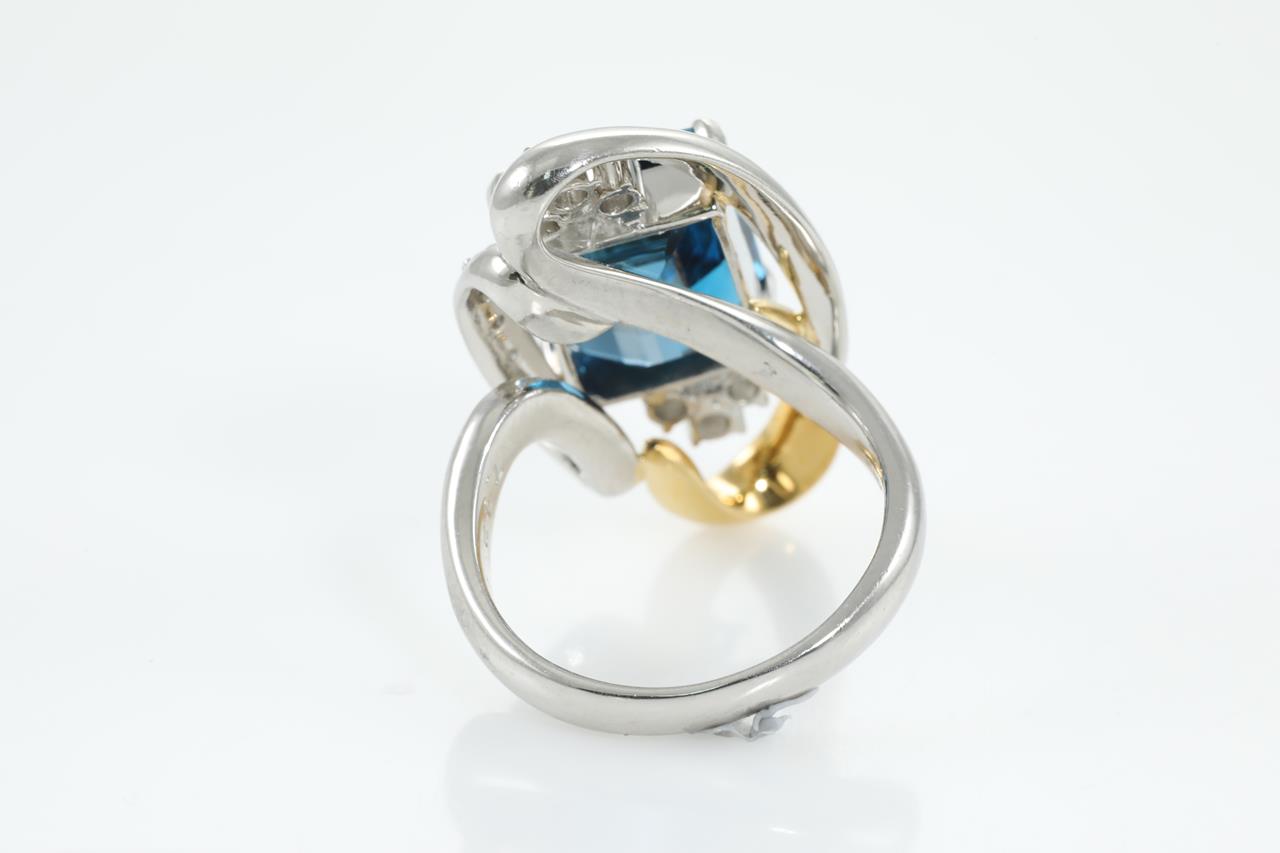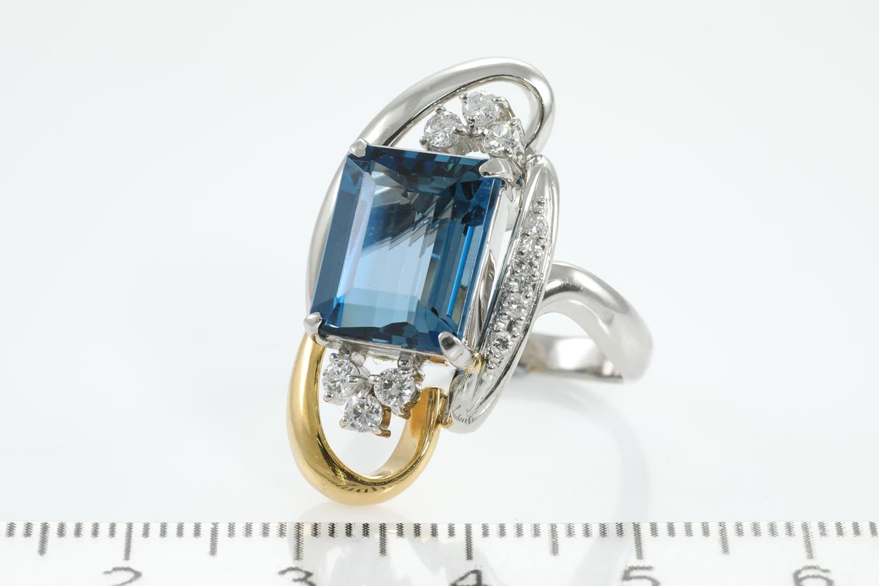 Topaz and Diamond ring with an emerald cut London Blue Topaz of 7.92ct and Diamonds totalling 0.33cts (Estimated grading: G-H P1). 18ct yellow gold & platinum. Ring size L. Weight: 14.3g (Pre-owned)