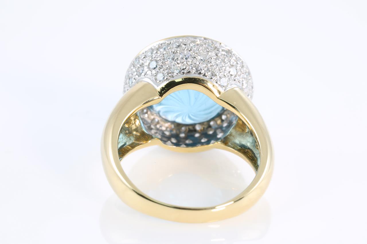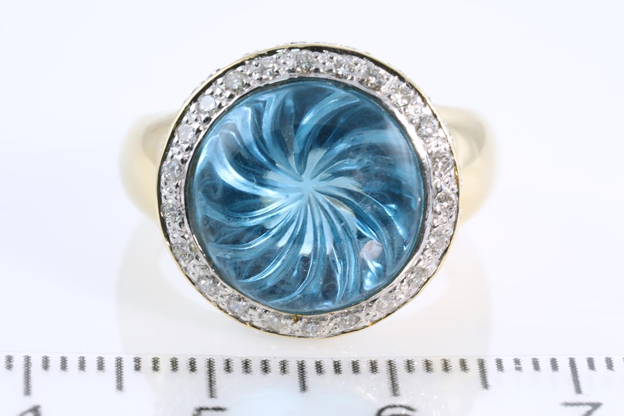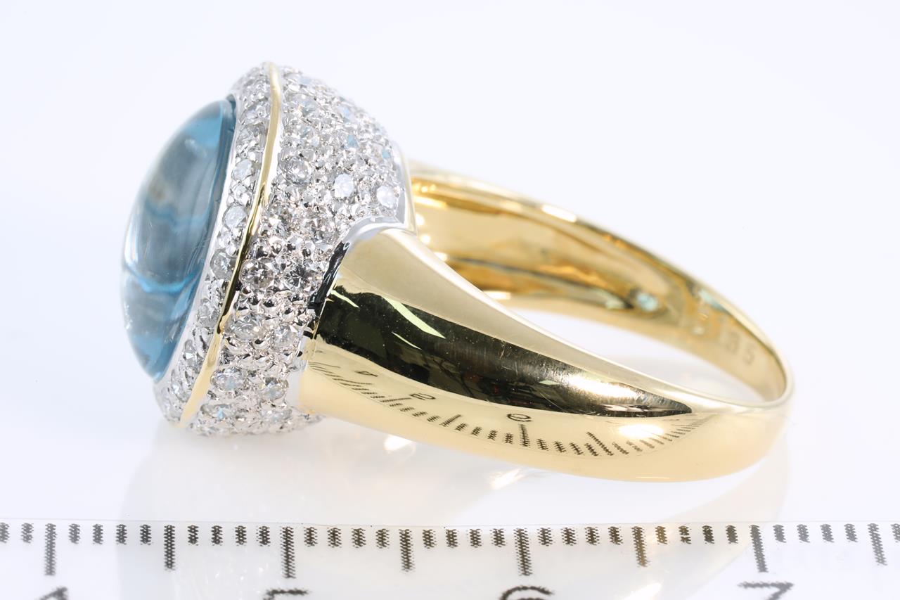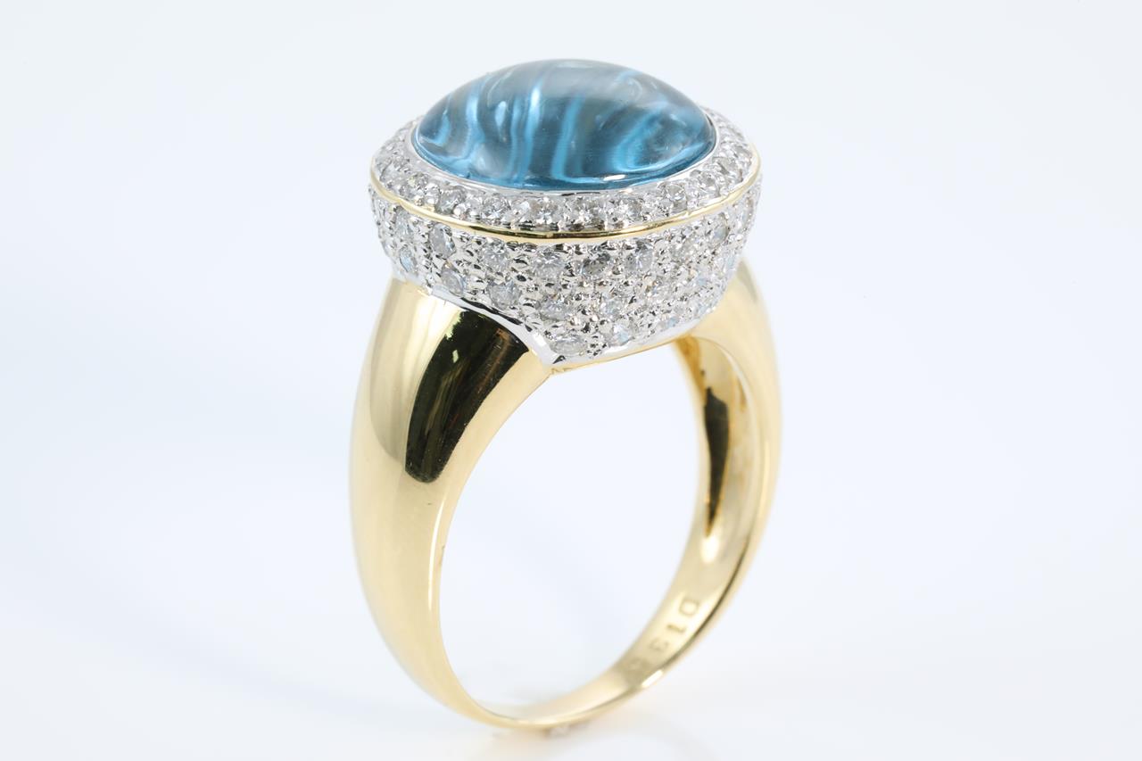 Topaz and Diamond ring with round cabochon cut Topaz and round Diamonds totalling 1.35cts (Estimated grading: H VS-SI). 18ct yellow gold. Ring size O1/2 - Ring resizing is not recommended. Weight: 11.1g (Pre-owned)