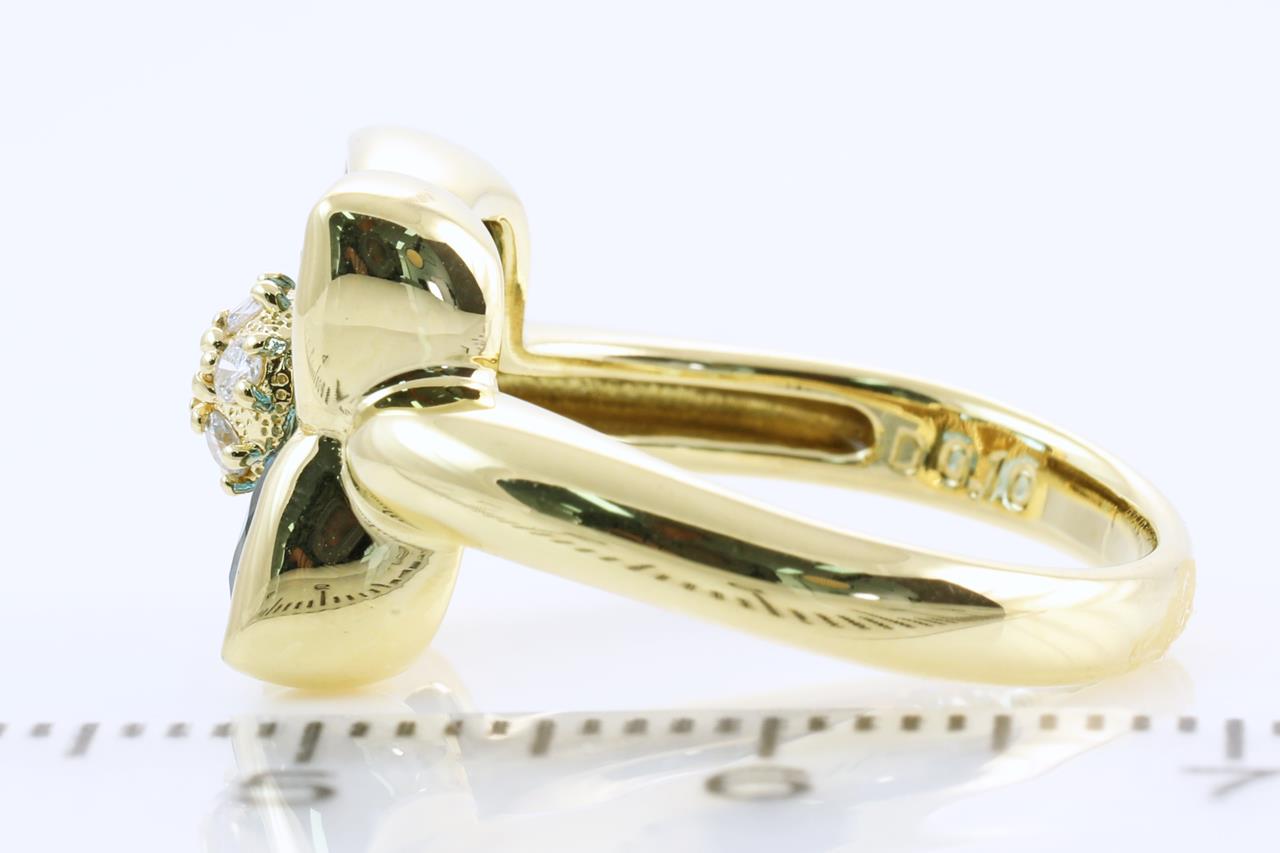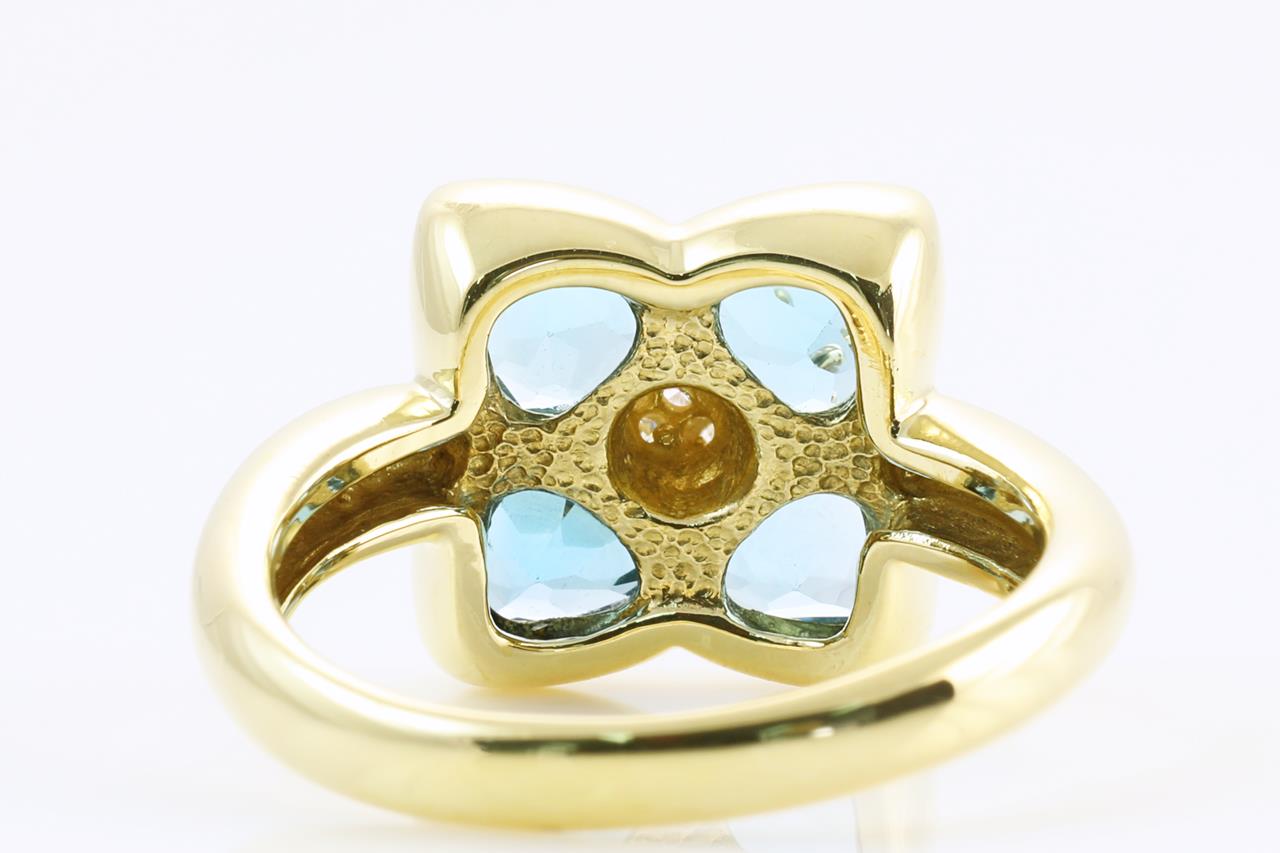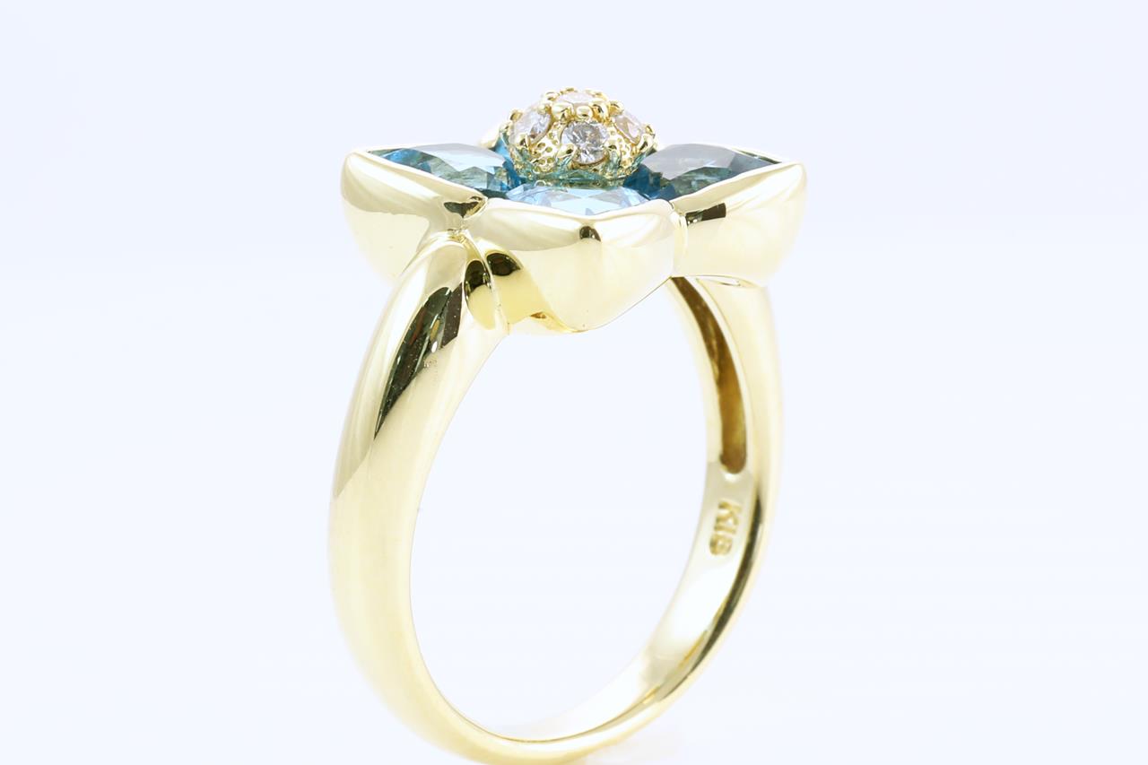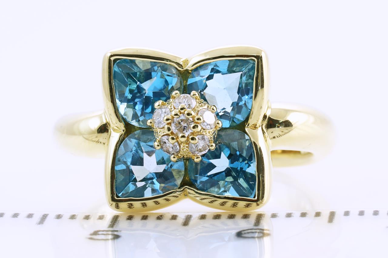 Topaz and Diamond ring with 4 pear shape Blue Topaz and Diamonds totalling 0.10cts. 18ct yellow gold. Ring size: L - It is not recommened to resize this ring. Weight: 6.6g (Pre-owned)