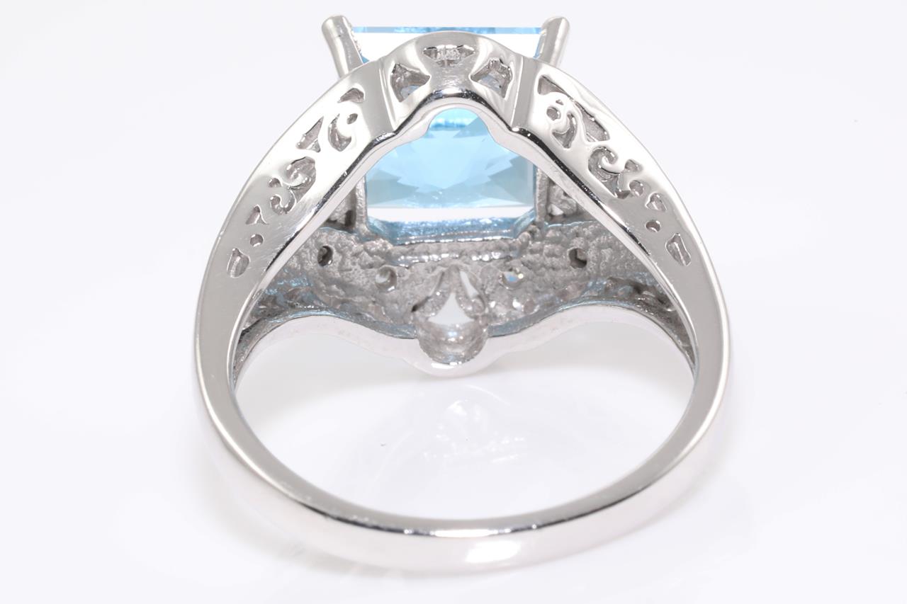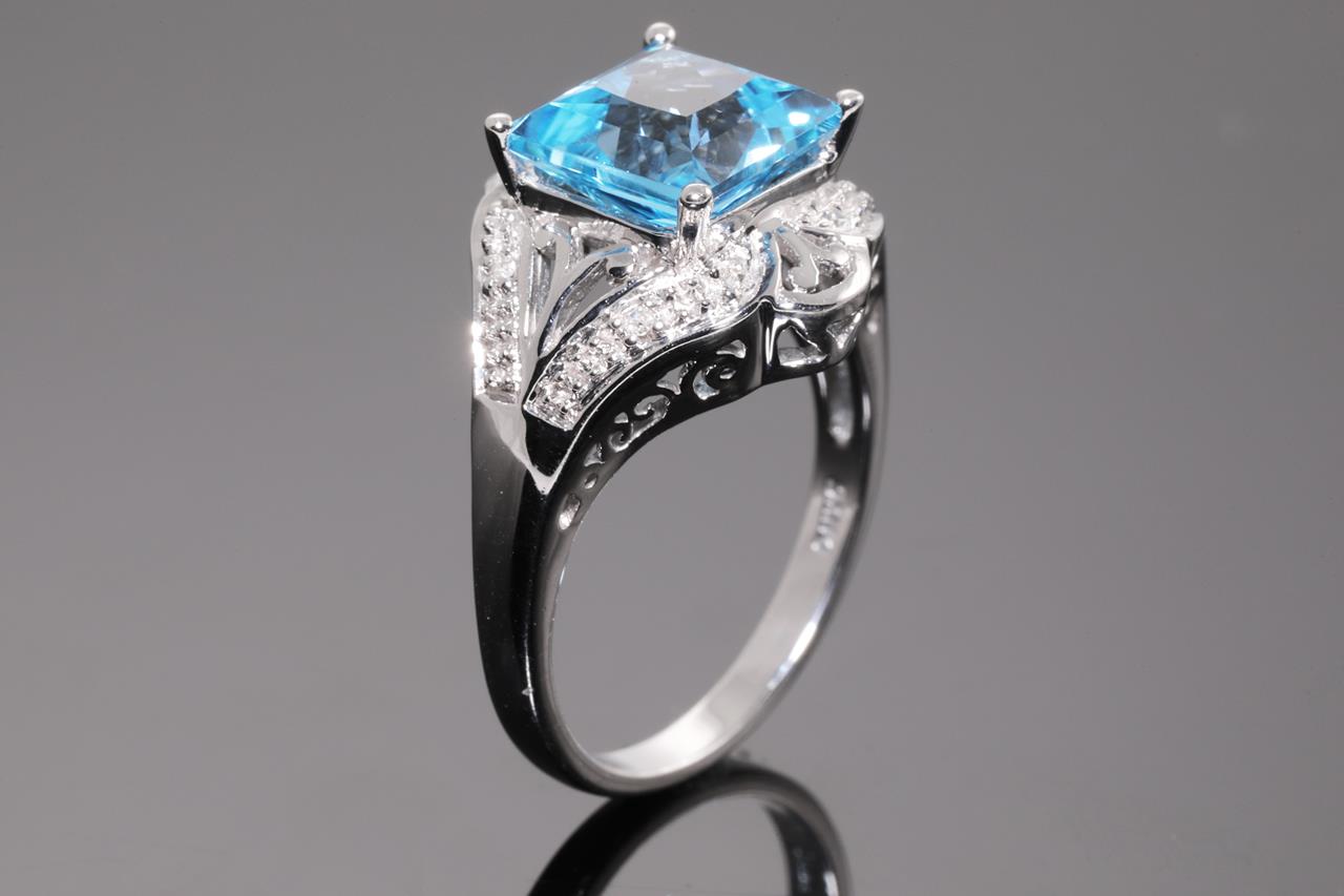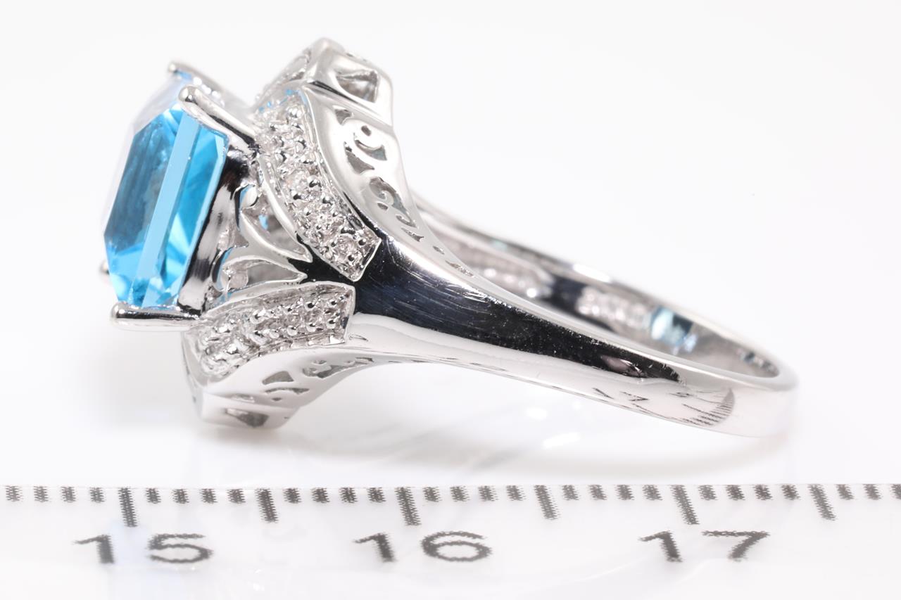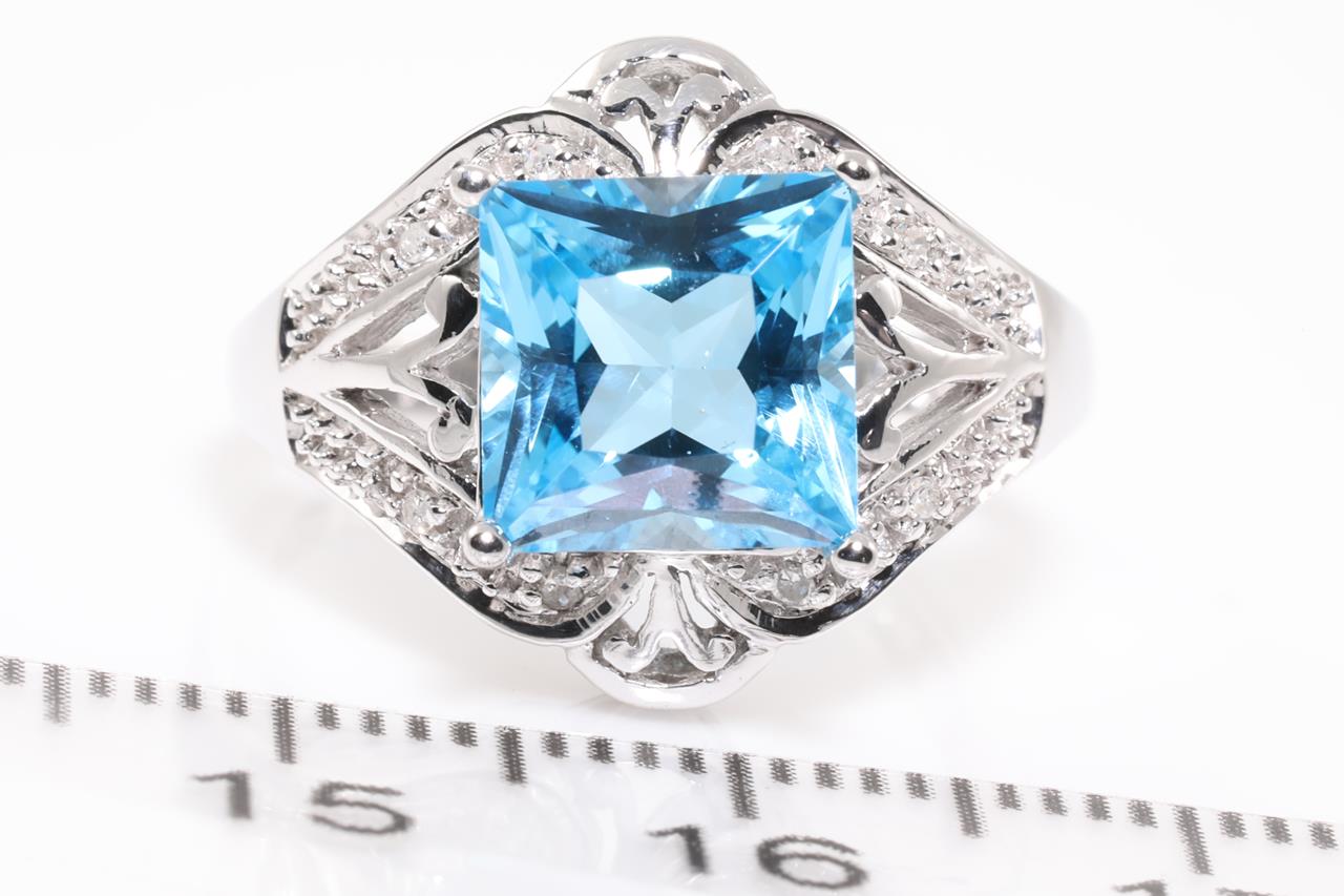 Topaz and Diamond Ring with square cut blue Topaz of approximately 2.70ct and Diamonds totalling approximetaly 0.05cts. 10ct white gold. Ring size L1/2. Weight 4.7g. (Pre-owned)