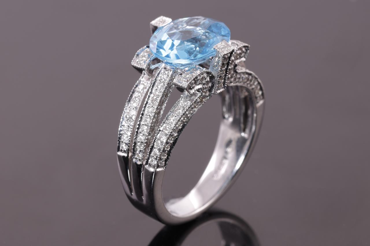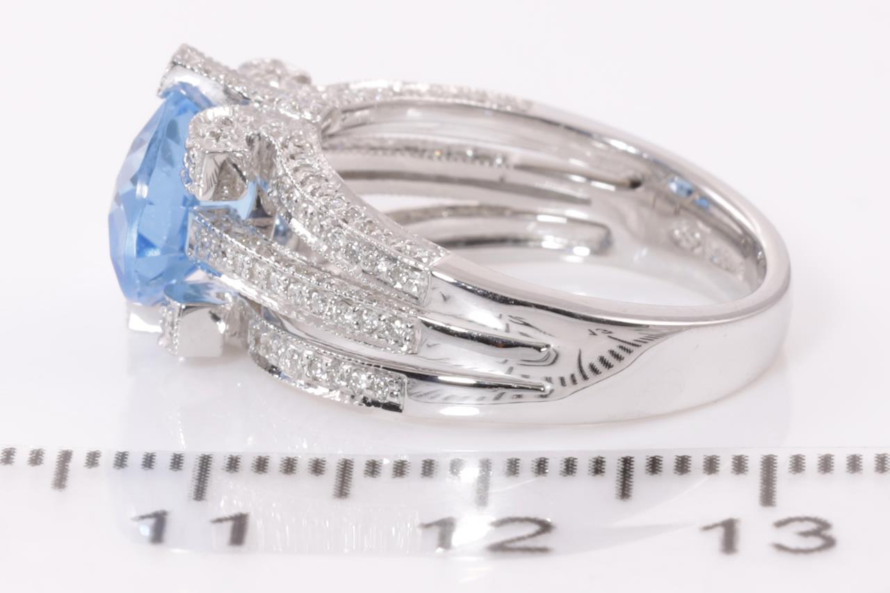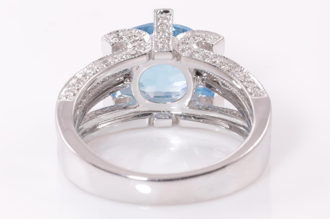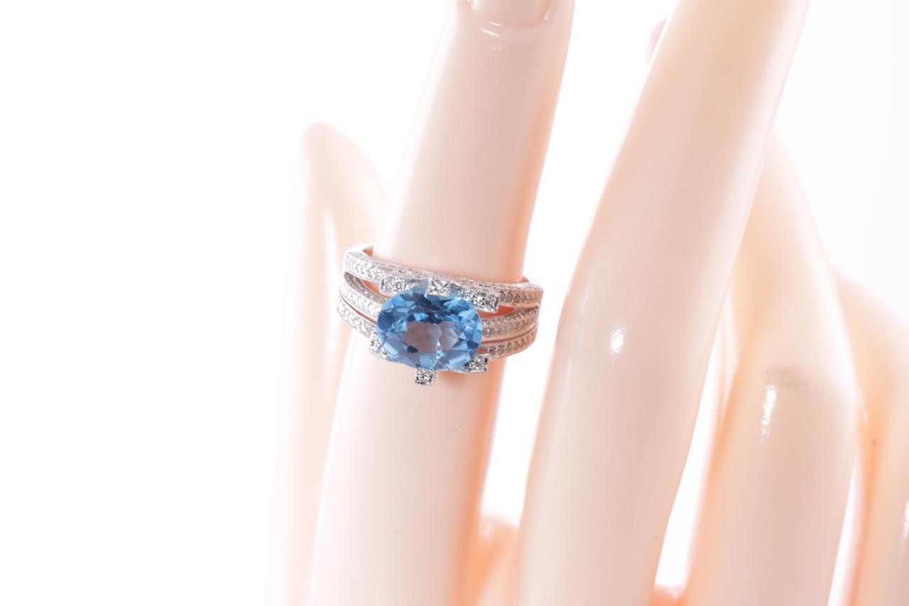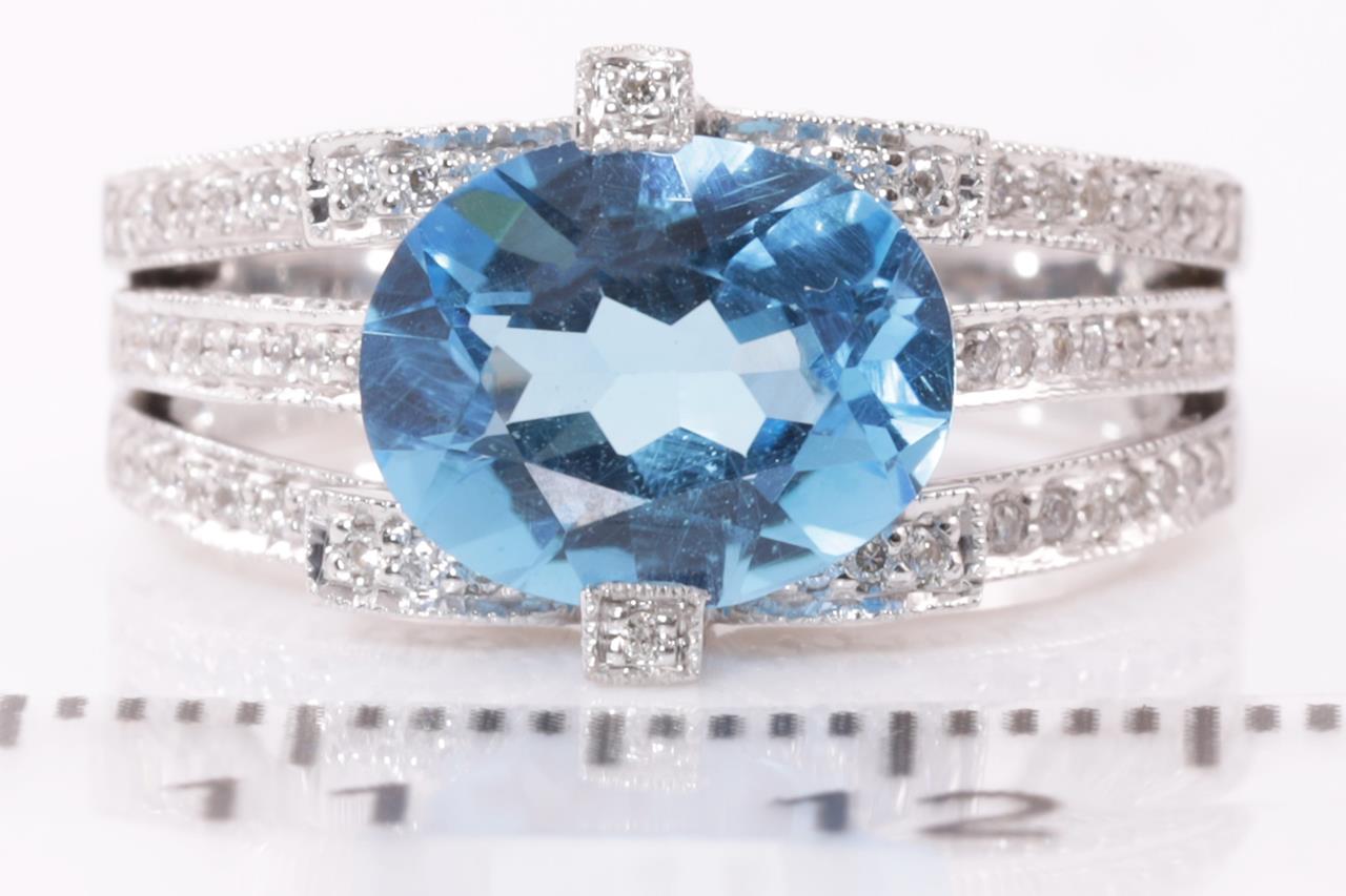 Topaz and Diamond ring with centre oval shape blue Topaz of 3.07cts and Diamonds totalling 0.52cts (Estimated grading: I-J SI-P1). 18ct white gold. Ring size: K1/2 - ring resizing is not recommended. Weight: 7.6g. (Pre-owned)