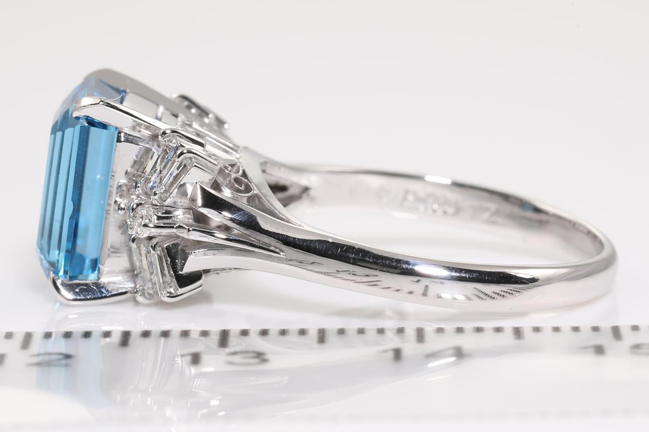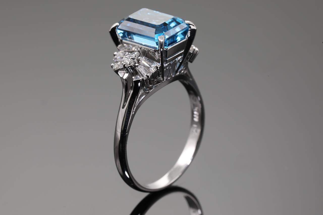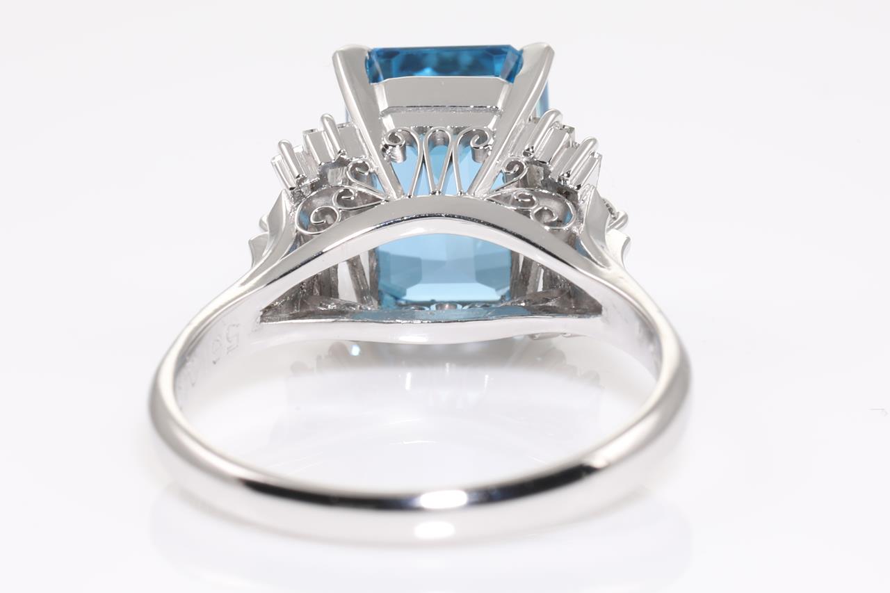 Topaz and Diamond ring with emerald cut blue Topaz of 5.61ct and round & baguette cut Diamonds toalling 0.46cts (Estimated grading: H SI). Platinum. Ring size: P. Weight: 7.5g. (Pre-owned)