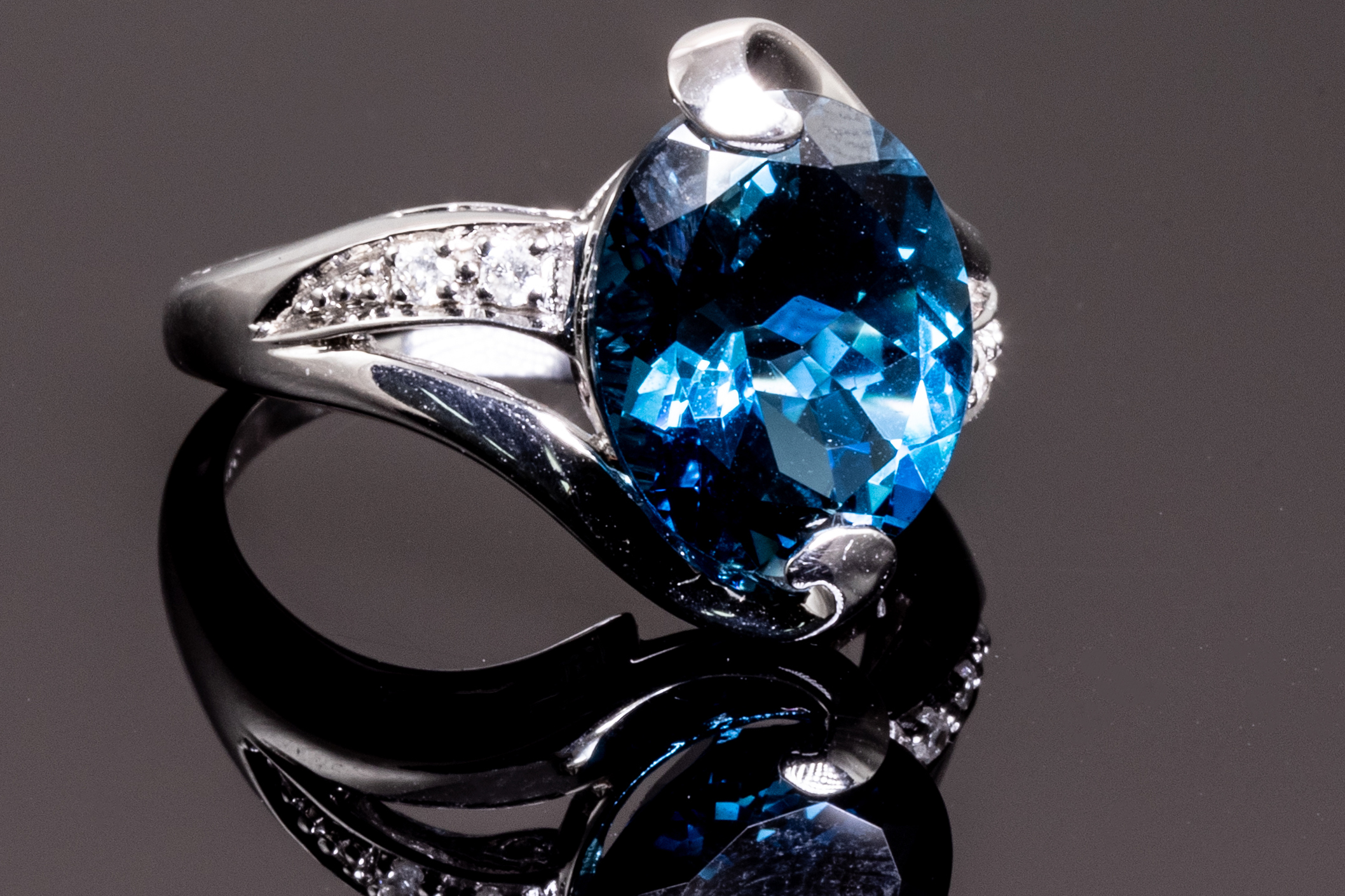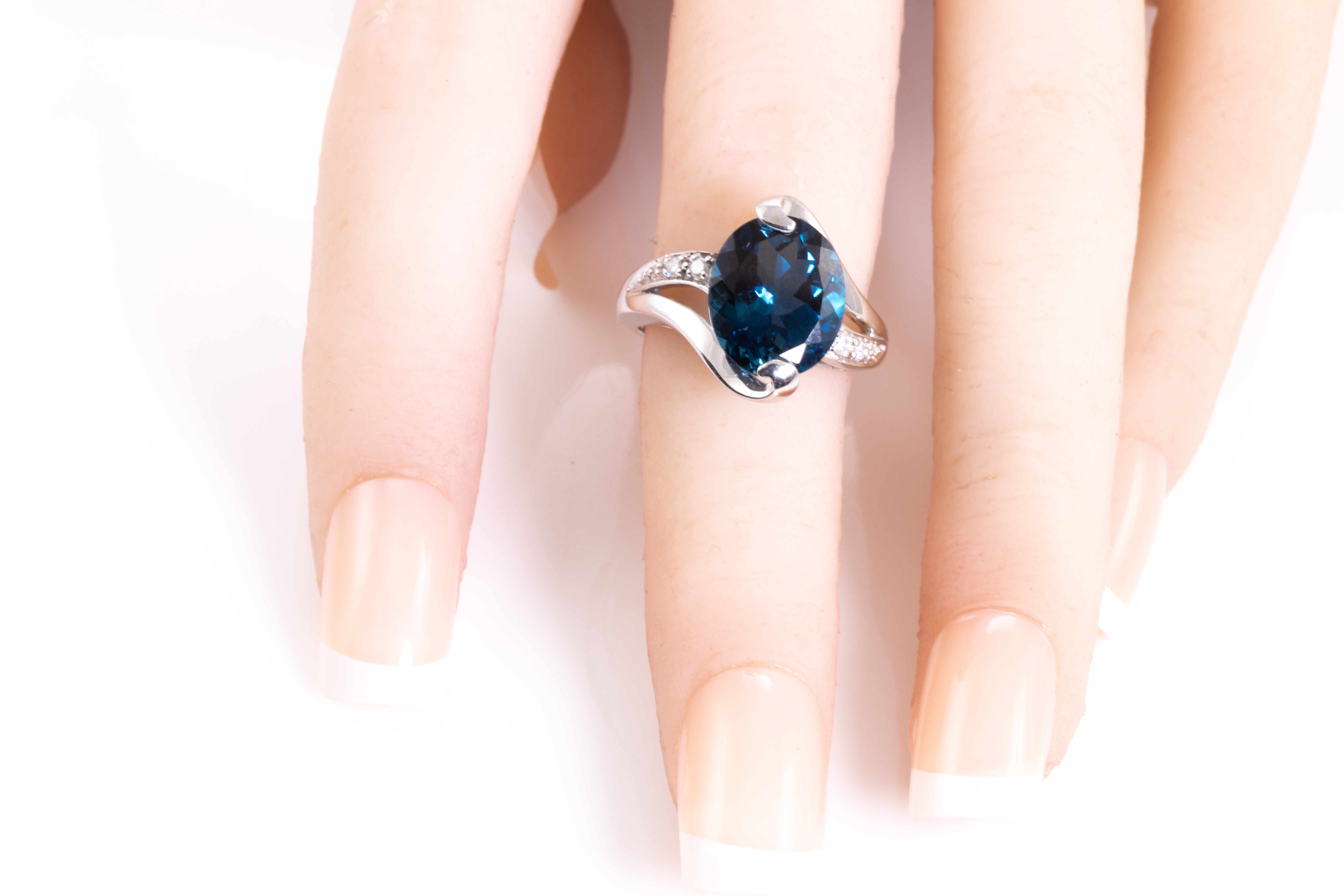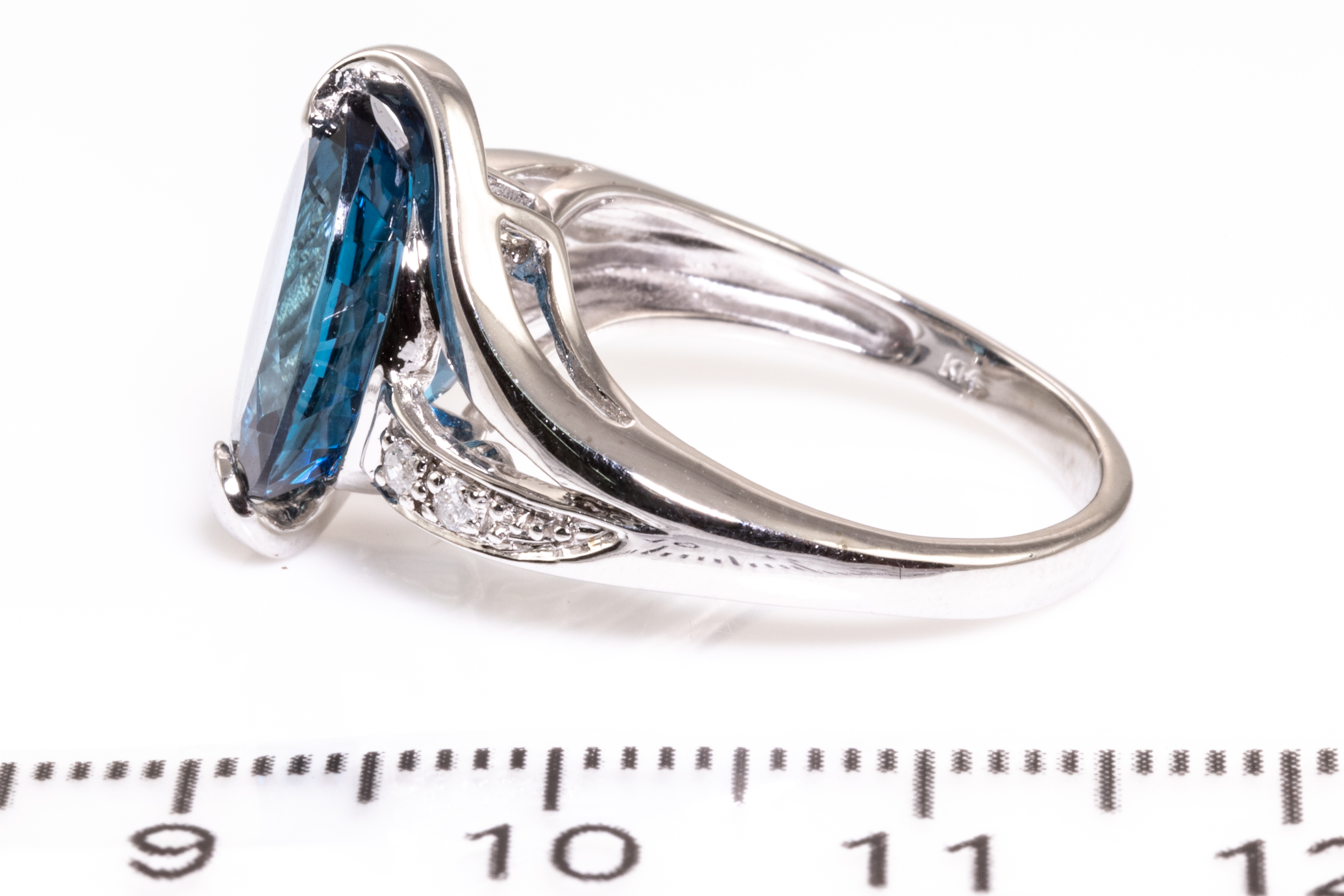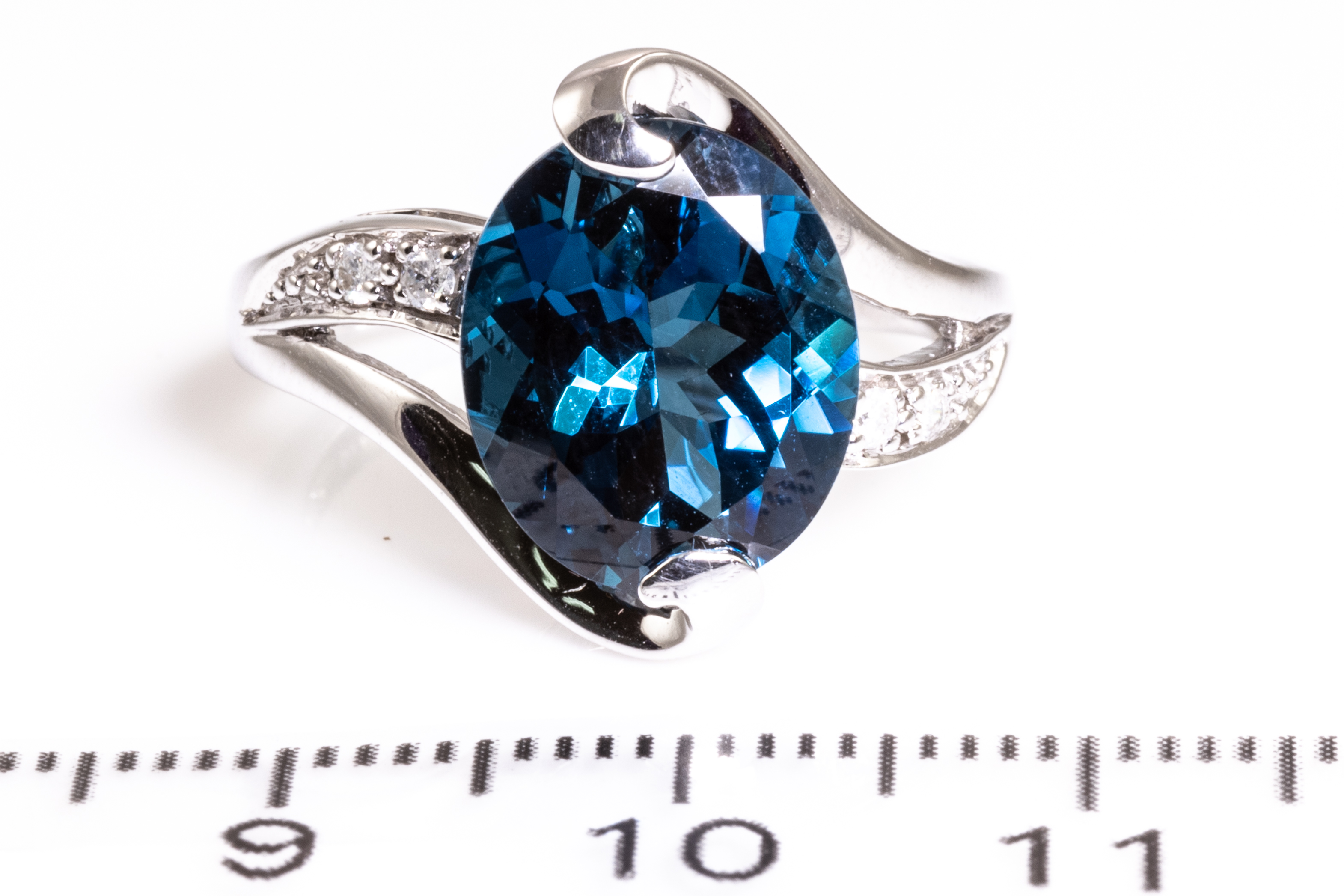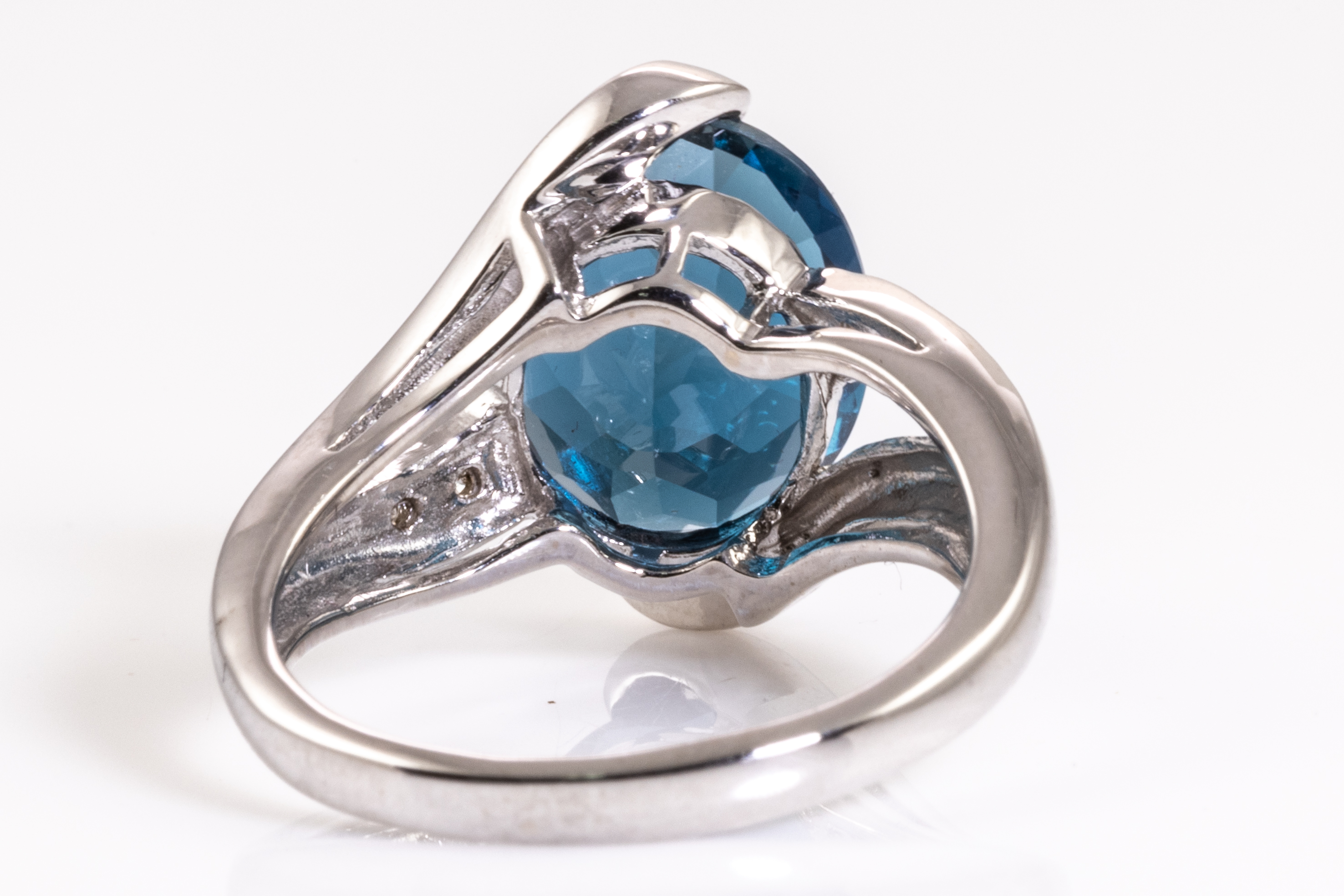 Topaz and Diamond ring with oval shape blue Topaz of approximately 5.35ct and round Diamonds totalling approximately 0.08cts. 14ct white gold. Ring size L1/2 - ring resizing is not recommended. Weight: 4.8g. (Pre-owned)