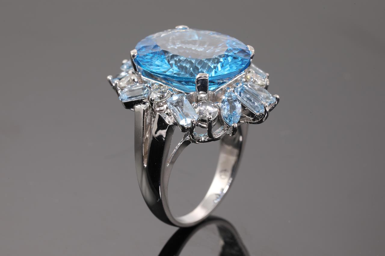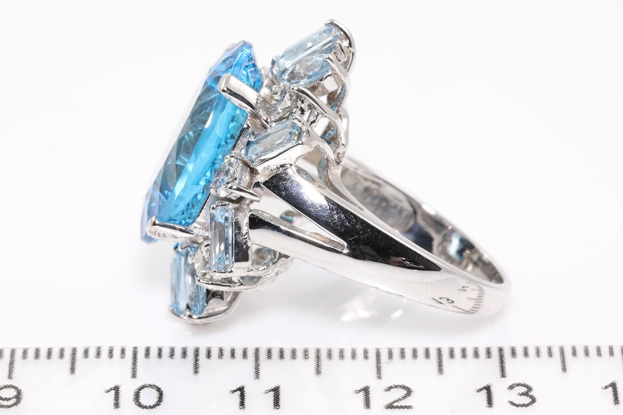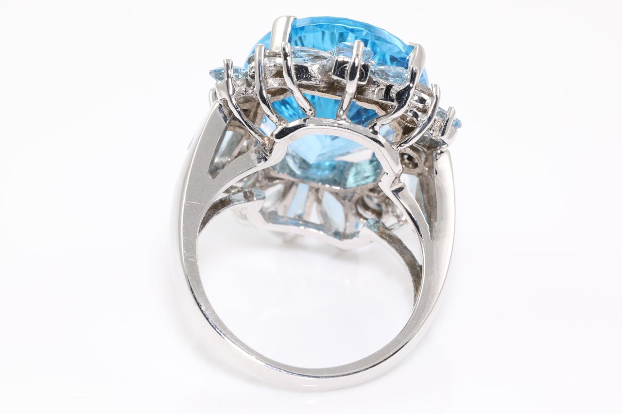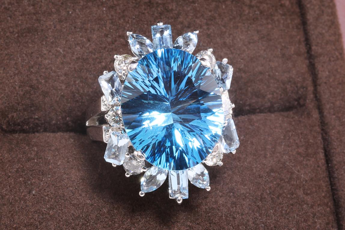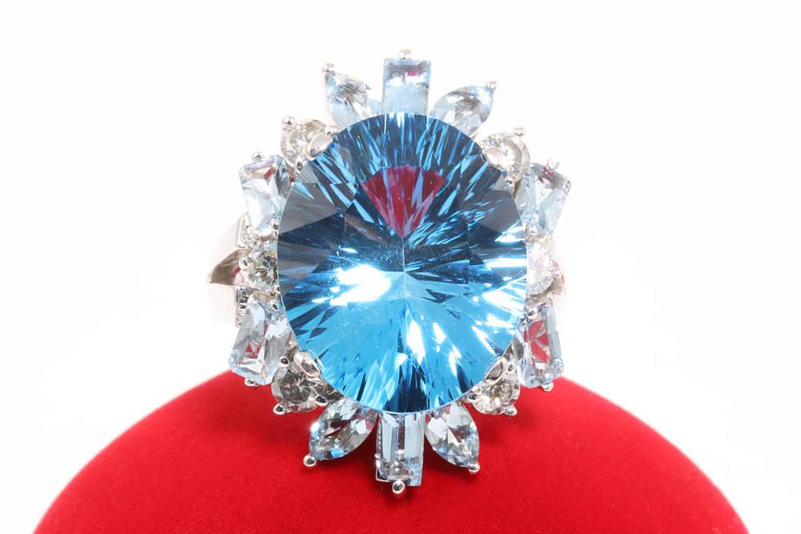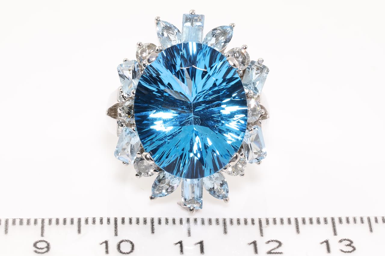Topaz, Aquamarine and Diamond ring with a centre oval fancy cut Topaz of 17.39ct, Aquamarines totalling 1.70cts and Diamonds totalling 0.86cts (Estimated grading: J-L SI2-P1). 14ct white gold. Ring size P. Weight: 14.2g (Pre-owned)