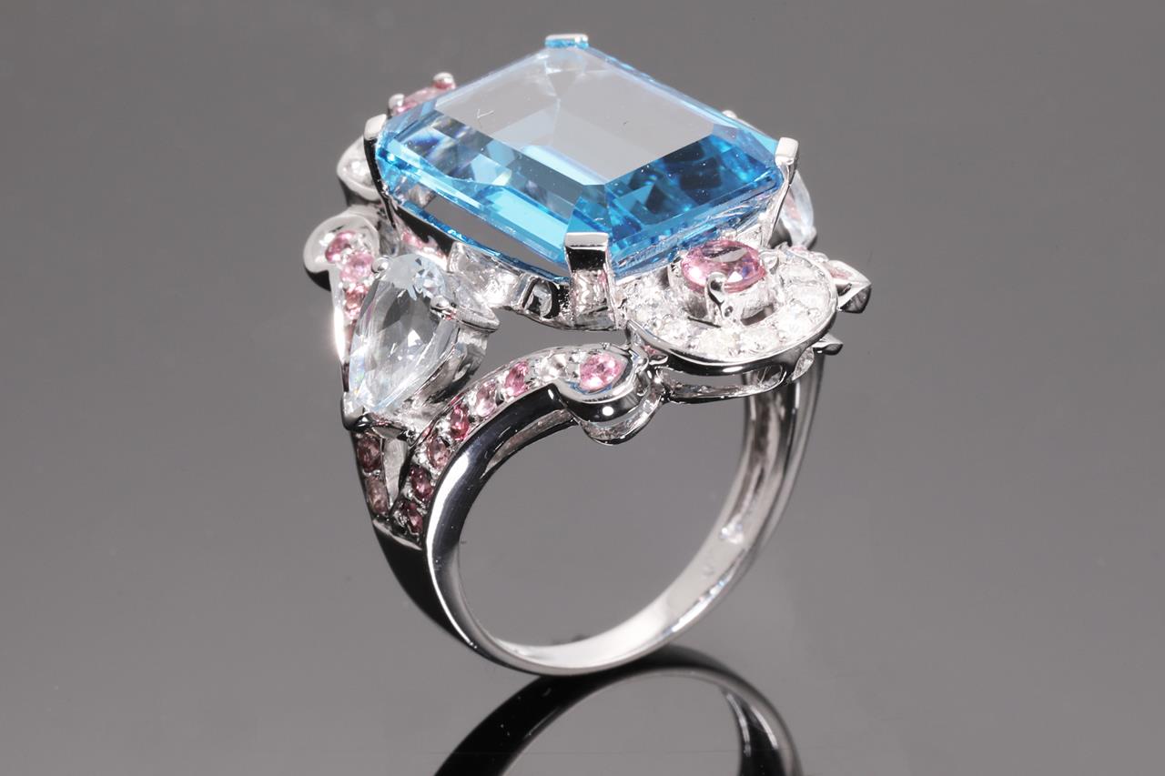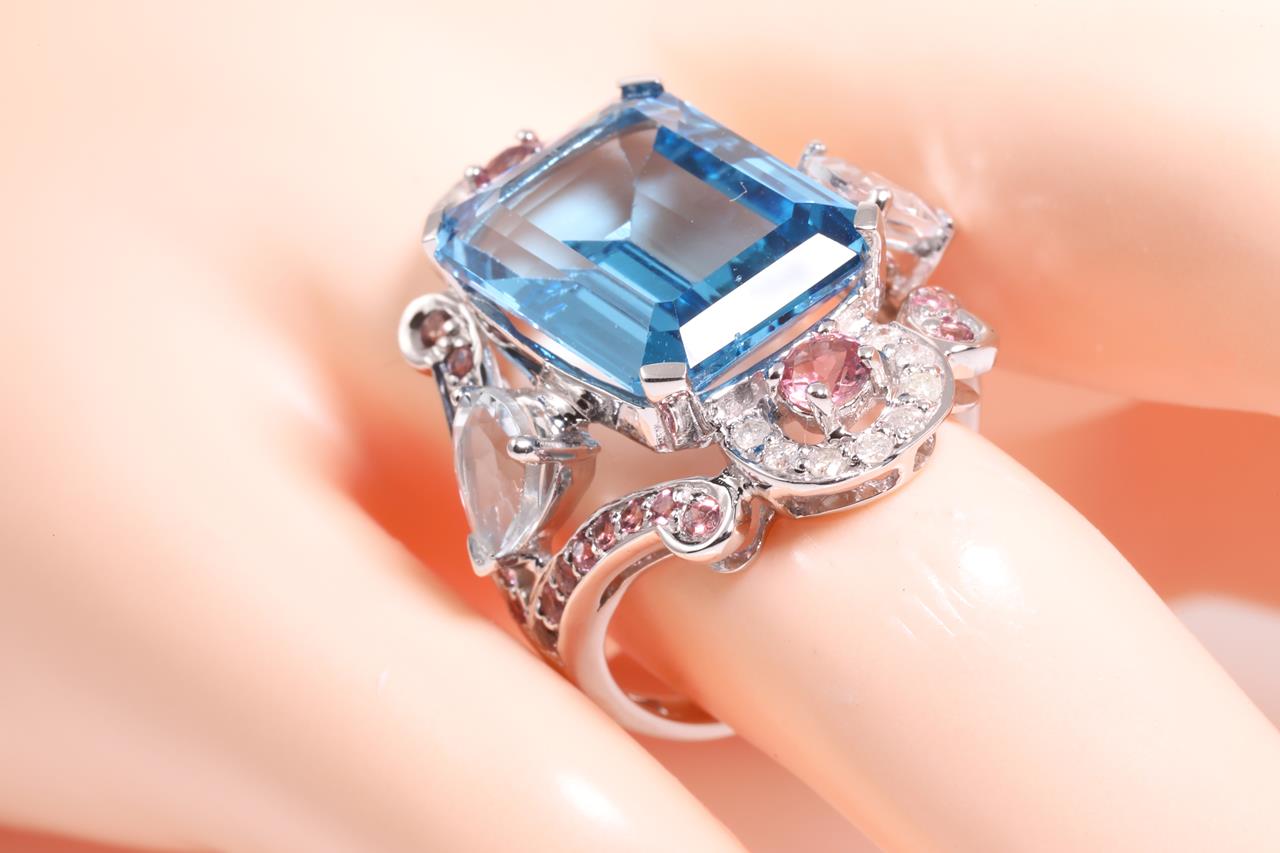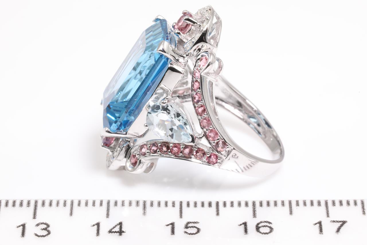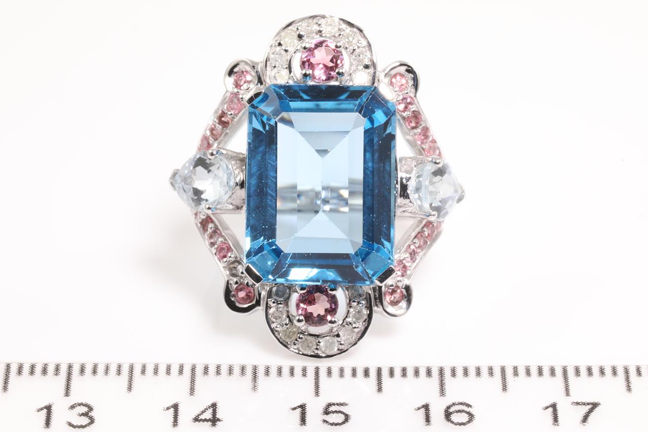 Topaz, Aquamarine, Tourmaline and Diamond ring with centre radiant cut blue Topaz of approximately 14.35ct, round pink Tourmalines totalling approximately 0.90cts, pear shape Aquamarines totalling approximately 1.30cts and round Diamonds totalling approximately 0.20cts. 14ct white gold. Ring size N1/2. Weight 8.6g. (Pre-owned)