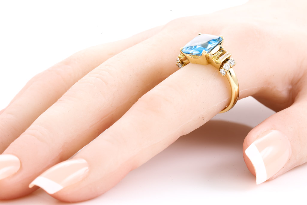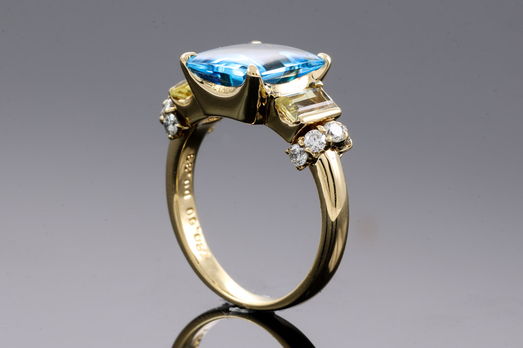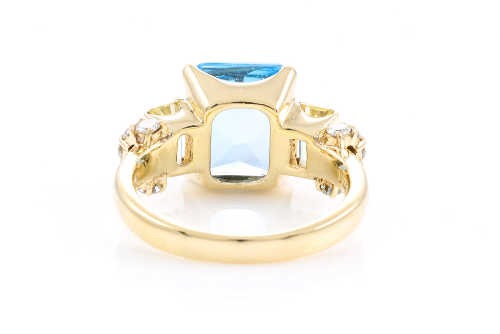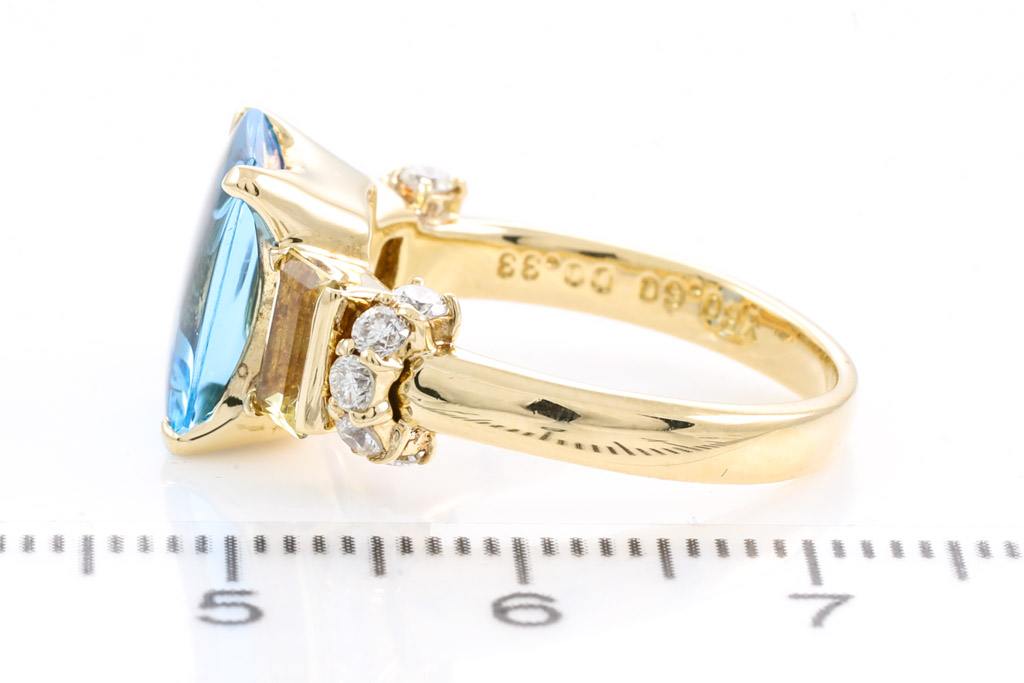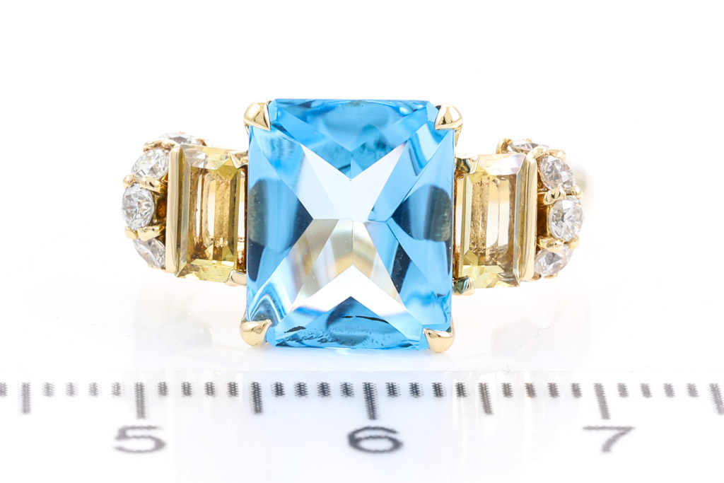 Topaz, Citrine and Diamond ring with rectangular shape buff top Topaz of 4.50ct, baguette cut Citrine totalling 0.60cts and round Diamonds totalling 0.33cts (Estimated grading: J SI). Ring size: N1/2 - ring resize is not recommended. 18ct yellow gold. Weight: 7.3g. (Pre-owned)