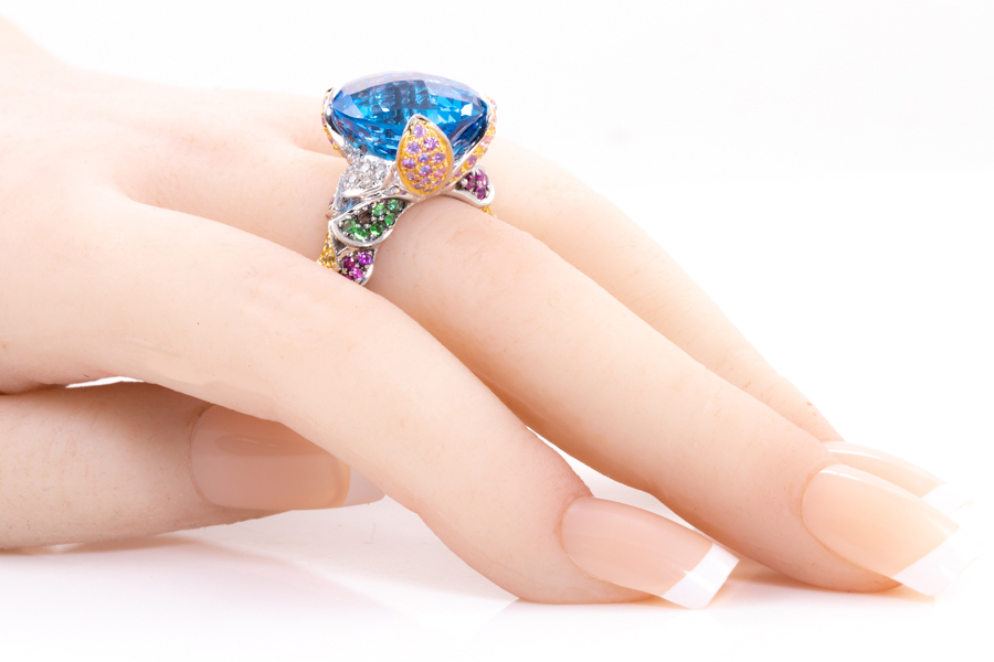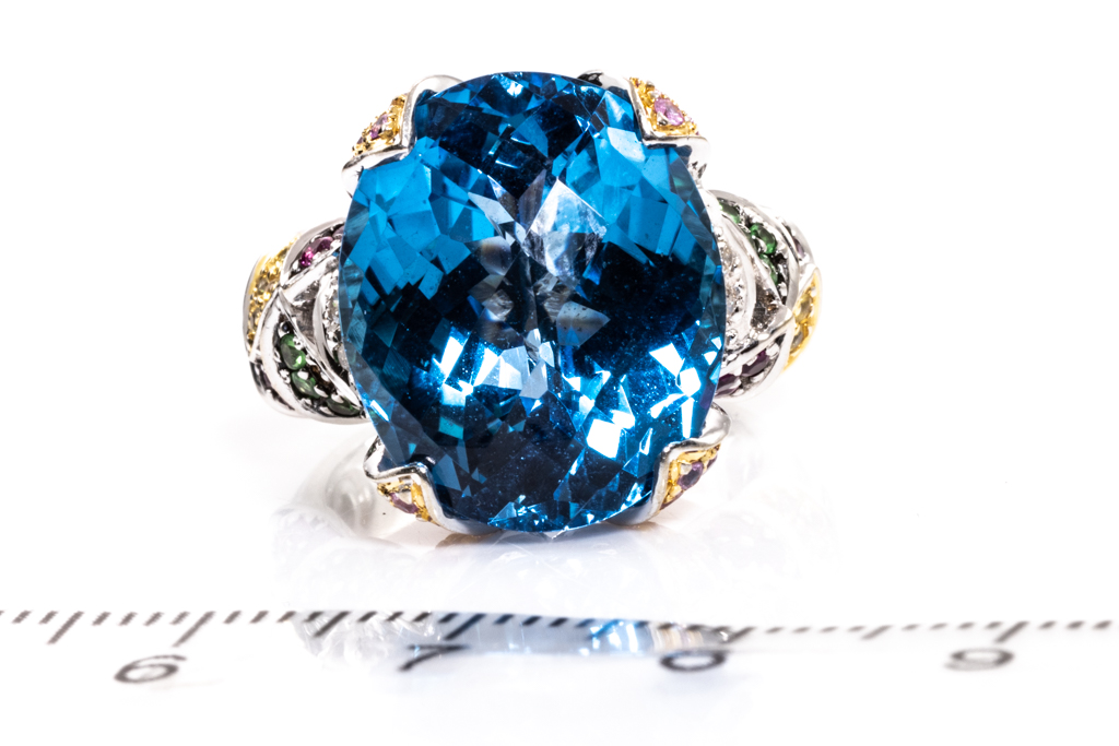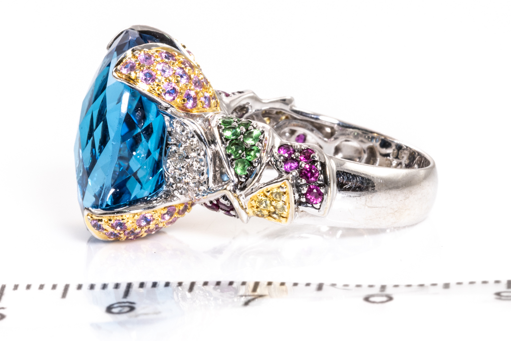 Topaz, mixed gemstone and Diamond ring with centre oval checkerboard cut blue topaz of 17.78cts and mixed round gemstones including, Sapphire, Emerald & Spinel totalling 1.38cts and Diamonds totalling 0.20cts. 18ct white gold. Ring size M. Weight: 13.2g. (Pre-owned)