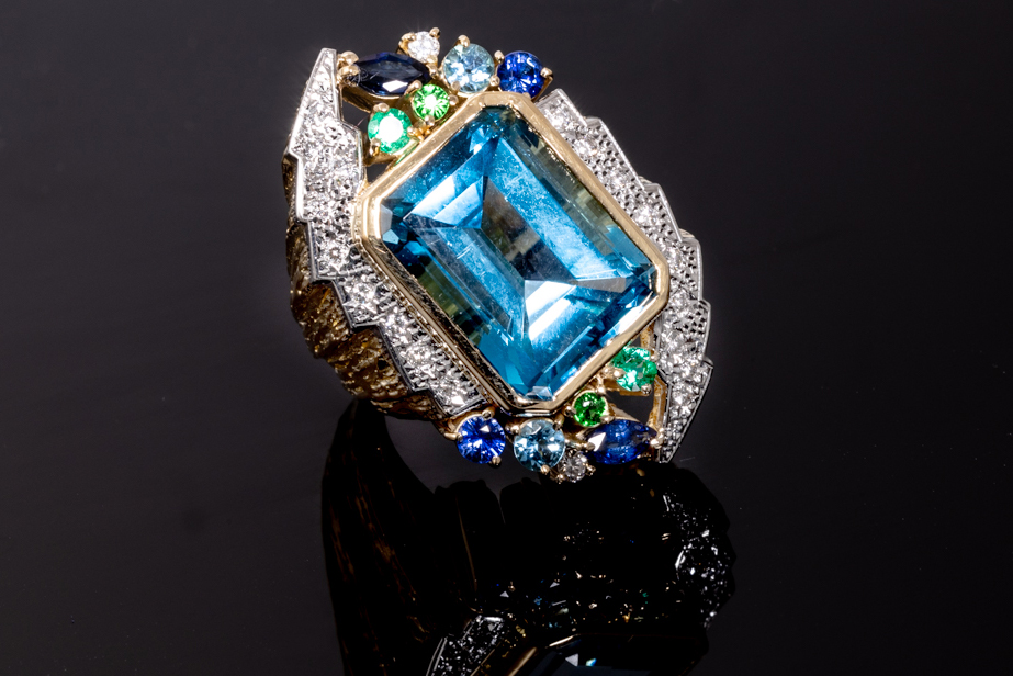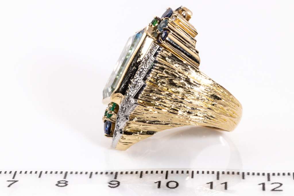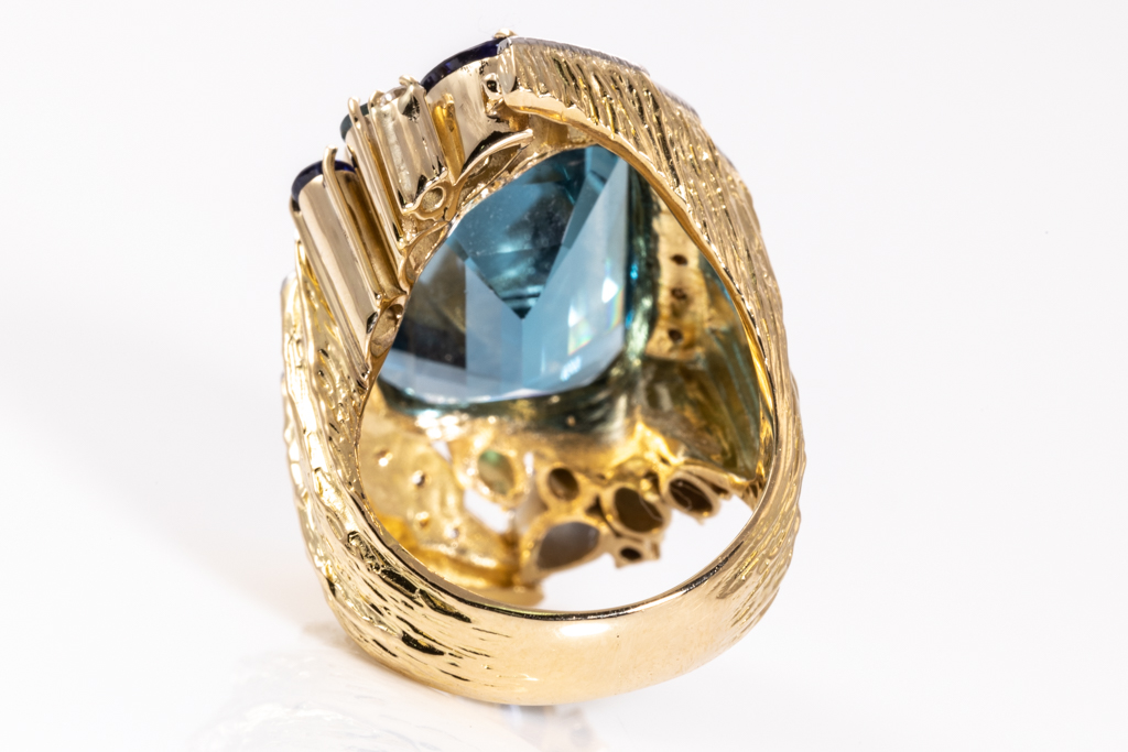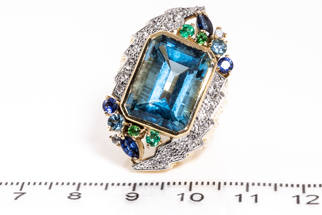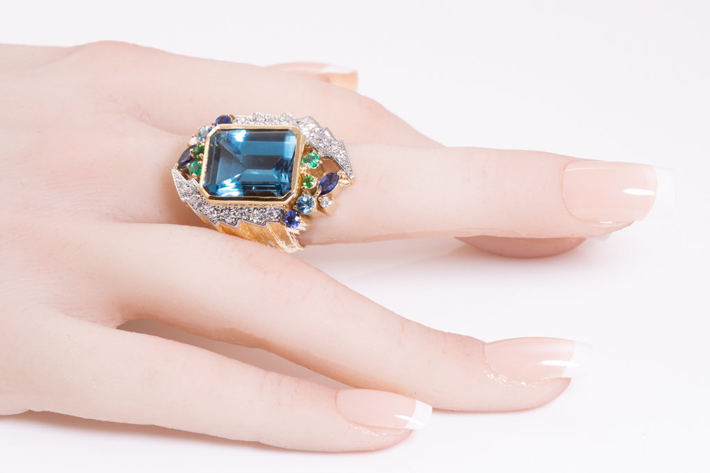 Topaz, mixed Gemstones and Diamond ring with a centre emerald cut blue Topaz of 15.14ct, 2 round blue topaz totalling 0.27cts, Sapphires totalling 0.73cts, green Garnets totalling 0.09cts, Emeralds totalling 0.12cts and round Diamonds totalling 0.26cts. 18ct yellow and platium. Ring size M. Weight: 23.4g. (Pre-owned)